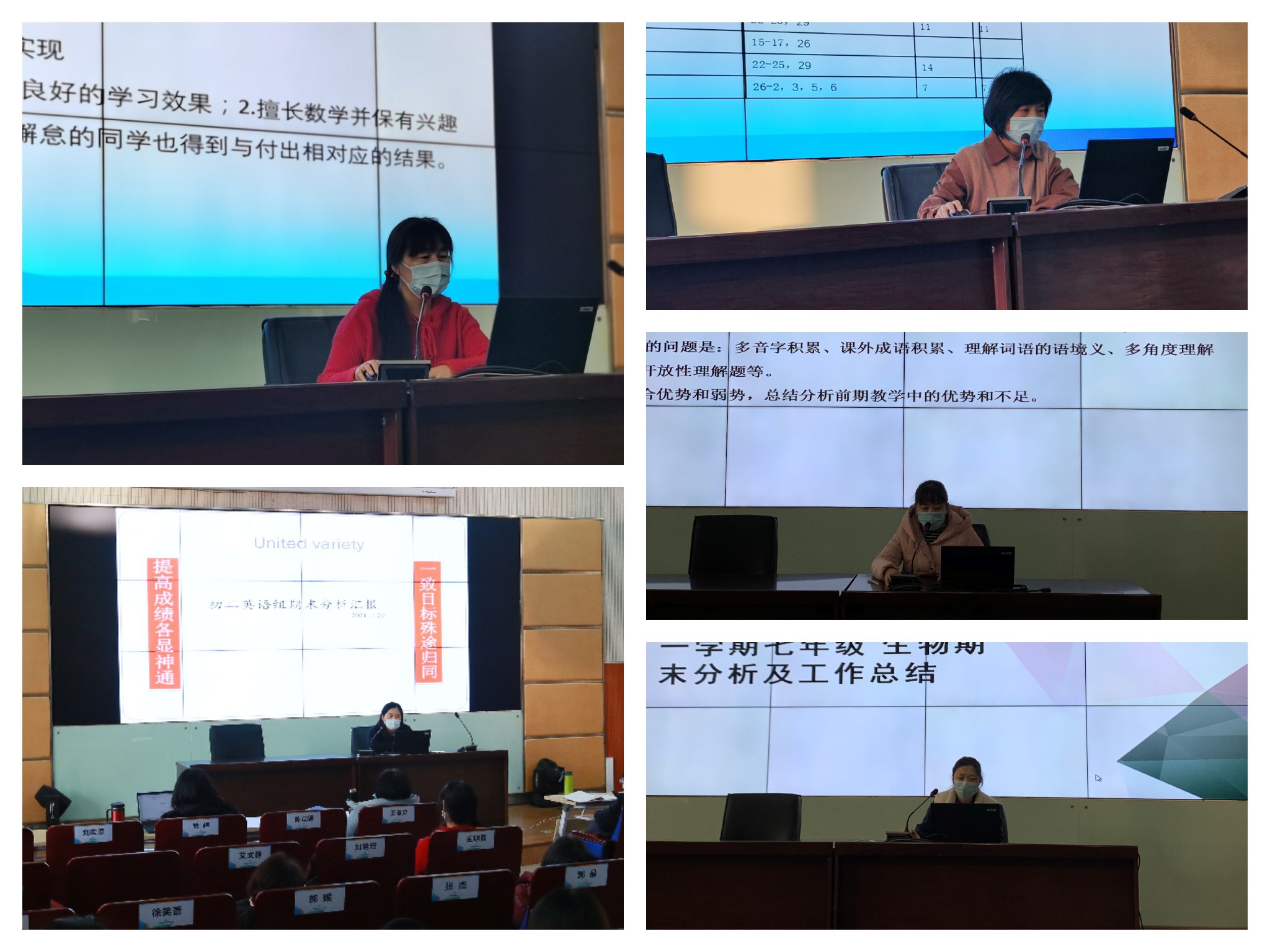 会议开始,由教务处黄国会主任和张劼主任解读本次研讨会的目标和要求,并从总成绩、各学科总分贡献情况、各个学科的潜力班级、培优补差以及问题和建议等方面进行质量分析,带领全体教师通过成绩反思教学,发现亮点、看到不足,为下学期的教育教学工作树立更精准的目标。