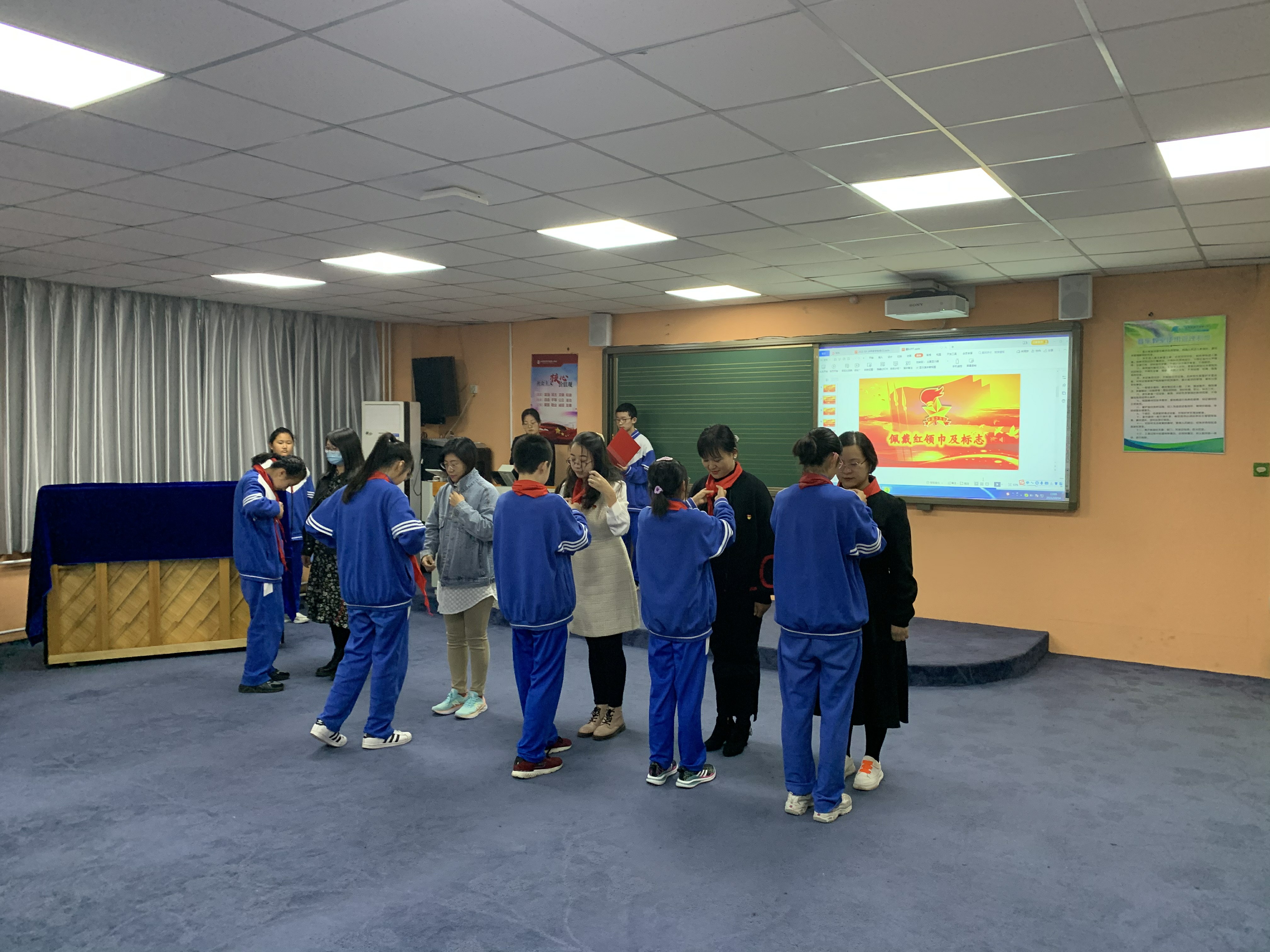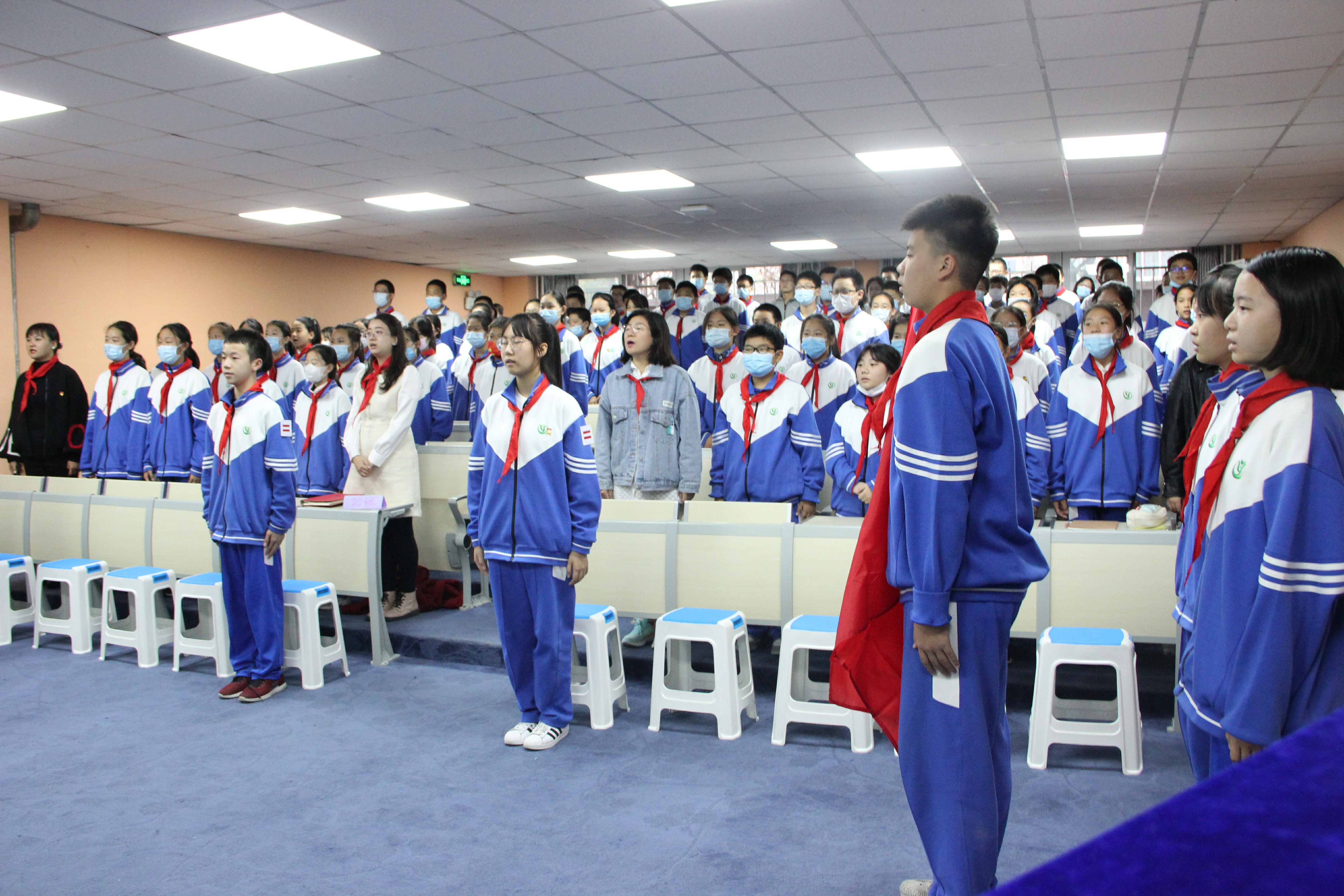 首先进行的是建队仪式,王瑾主任宣布成立新的少先大队和中队,少先队员旗手高高举起鲜红的队旗,全体学生歌唱《少年先锋队队歌》,大队长刘笑月带领同学们庄严宣誓。