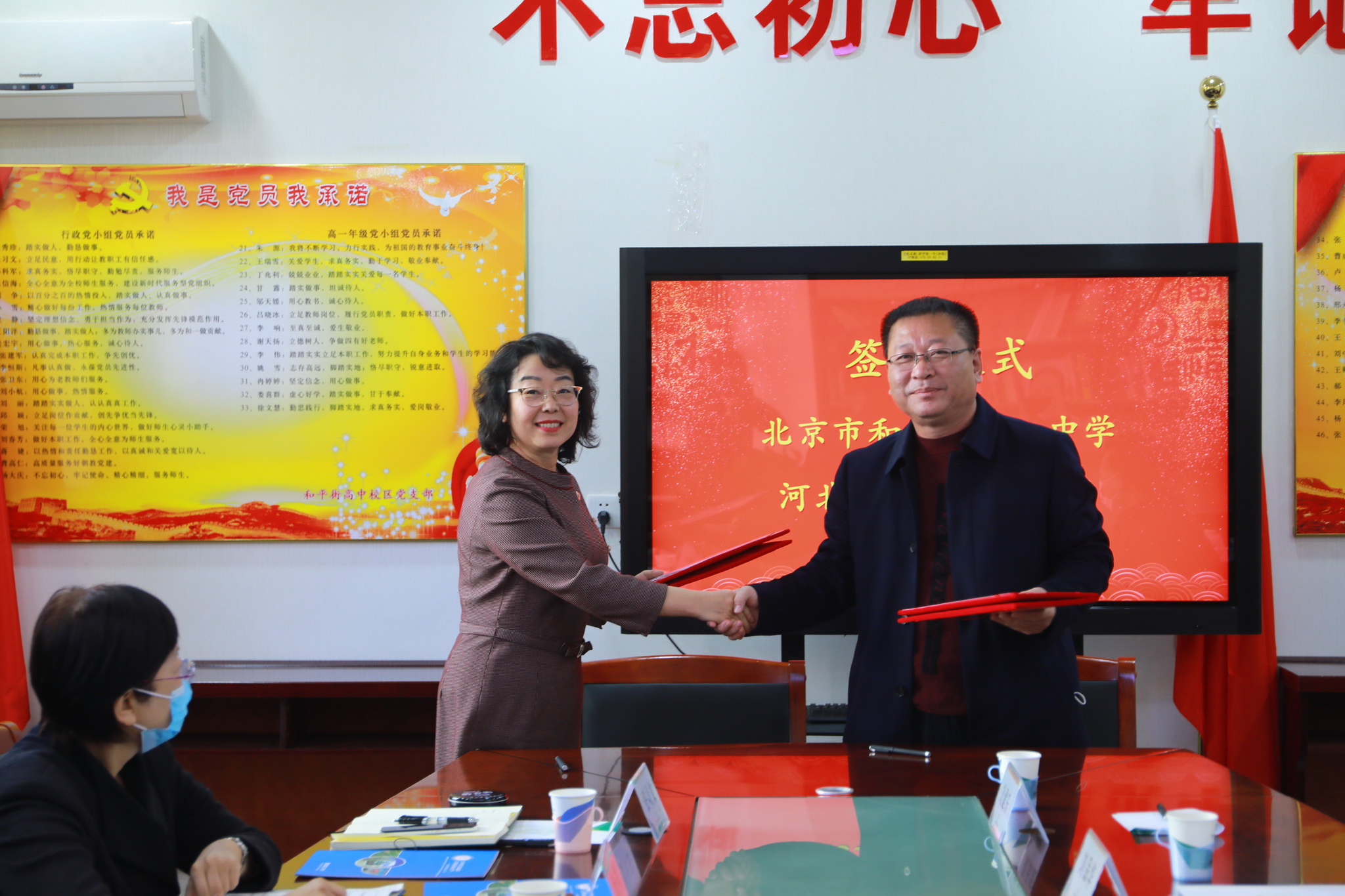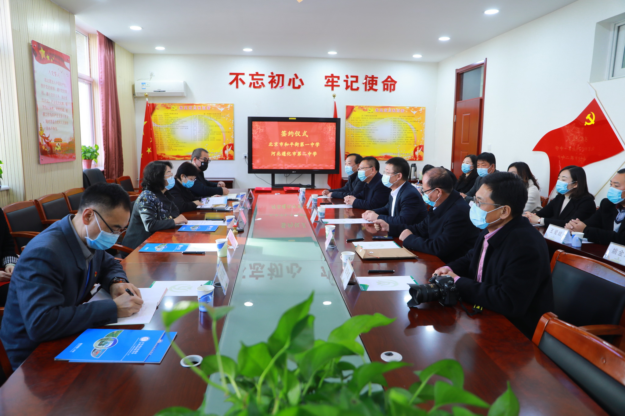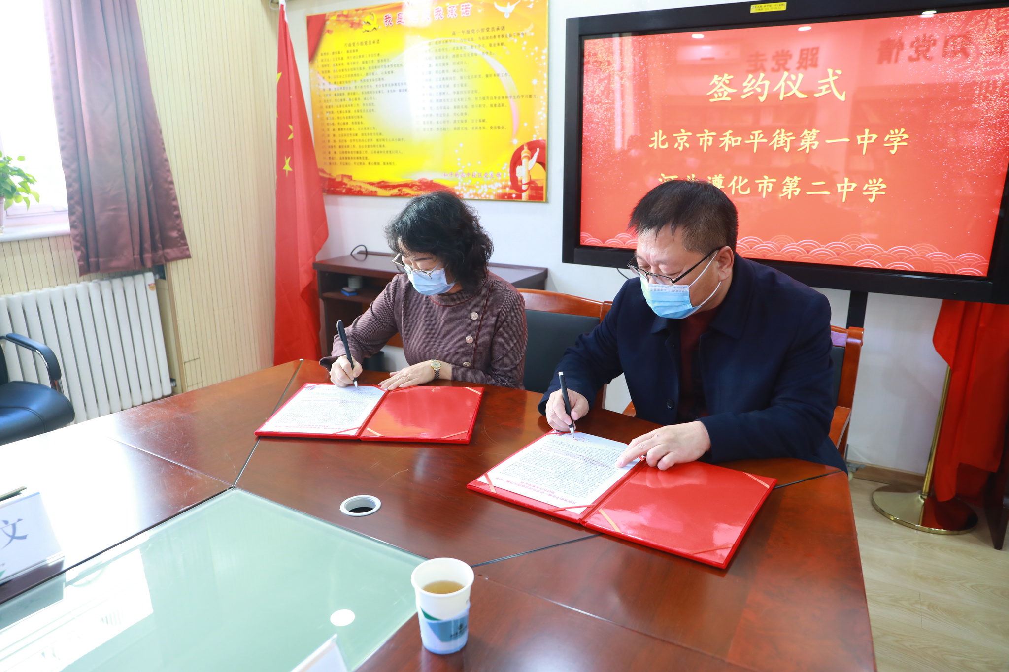 2020年12月3日,北京市和平街第一中学与河北遵化市第二中学友好合作签约仪式在和平街一中和平街高中校区举行。河北省遵化市教育局副局长刘建国、遵化市第二中学校长刘品华等领导、干部一行11人来到签约现场。