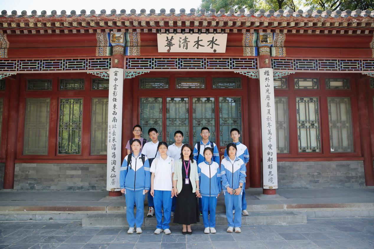 在参观清华学堂、图书馆、北院、水木清华等途中,杨艳校长与清华大学博士生董玉雪、研究生仇梦真、王啸给同学们讲解清华的历史、清华大先生们的故事。杨校长讲到“清华的美体现在很多方面,最美之处莫过于她的师生将清华的校训——自强不息 厚德载物内化到日常的一言一行中,成为了清华人的精神长相。”同学们感受到了学堂路上学生自行车流匆匆奔学的紧迫感,图书馆里全神贯注学习的庄严感以及课堂上哲思敏锐的深刻性。同学们走着走着来到了荷塘,虽然此时正值晌午,没有朱自清的“月色”,但朱先生的塑像和“水木清华”的牌匾还有荷塘的美景让同学们流连忘返。大家在此合影,祝愿同学们学有所成,圆梦理想!