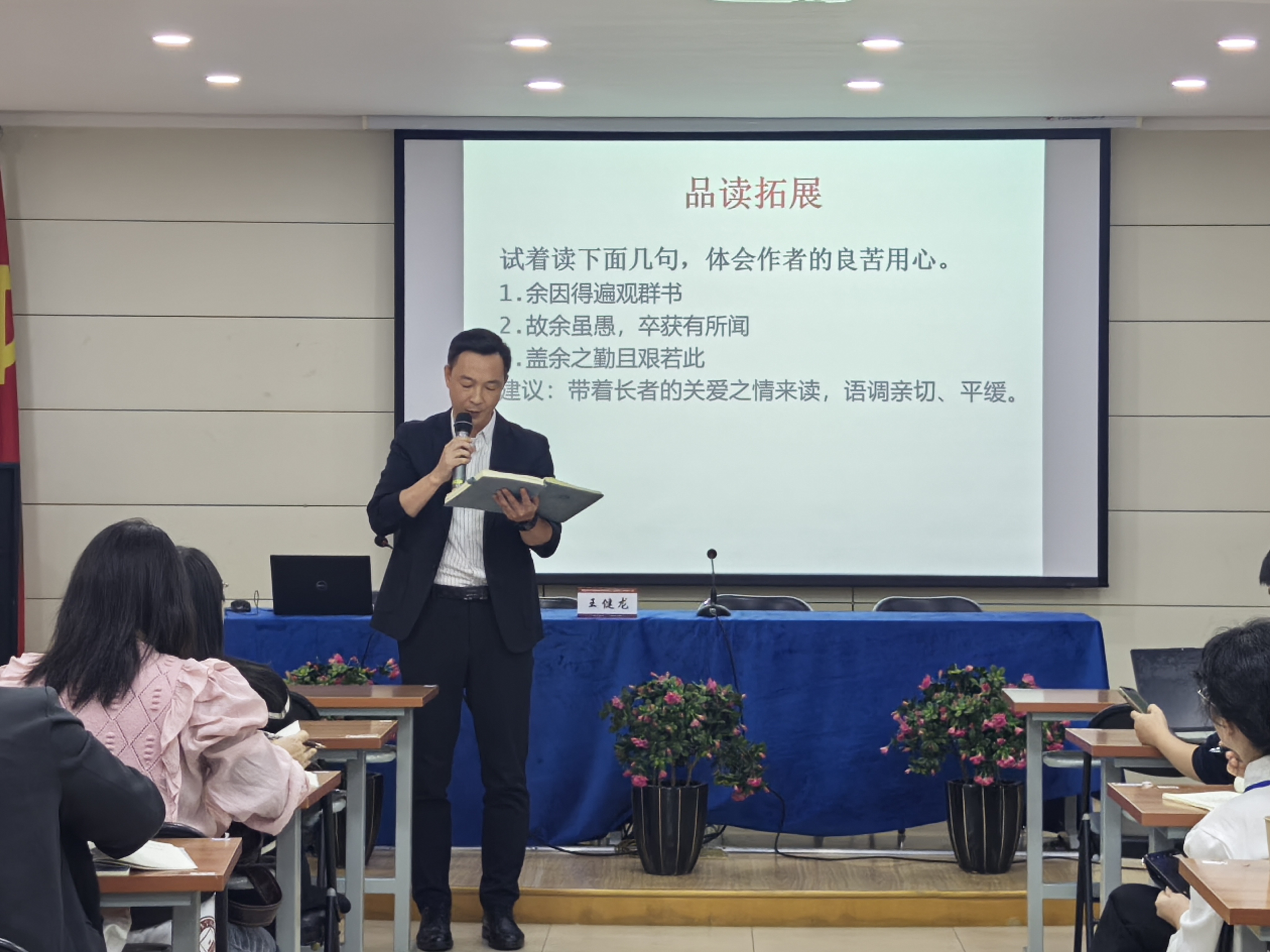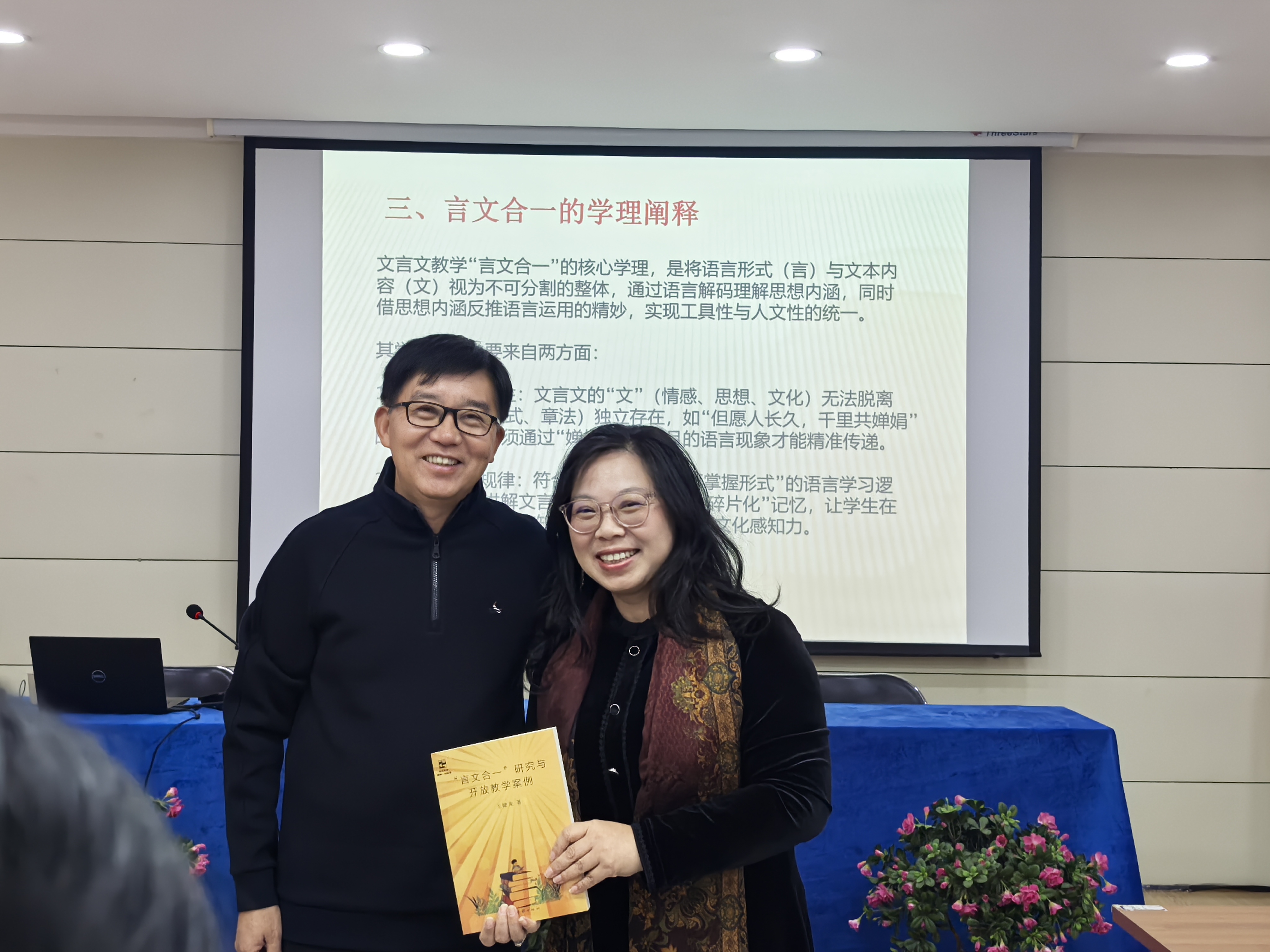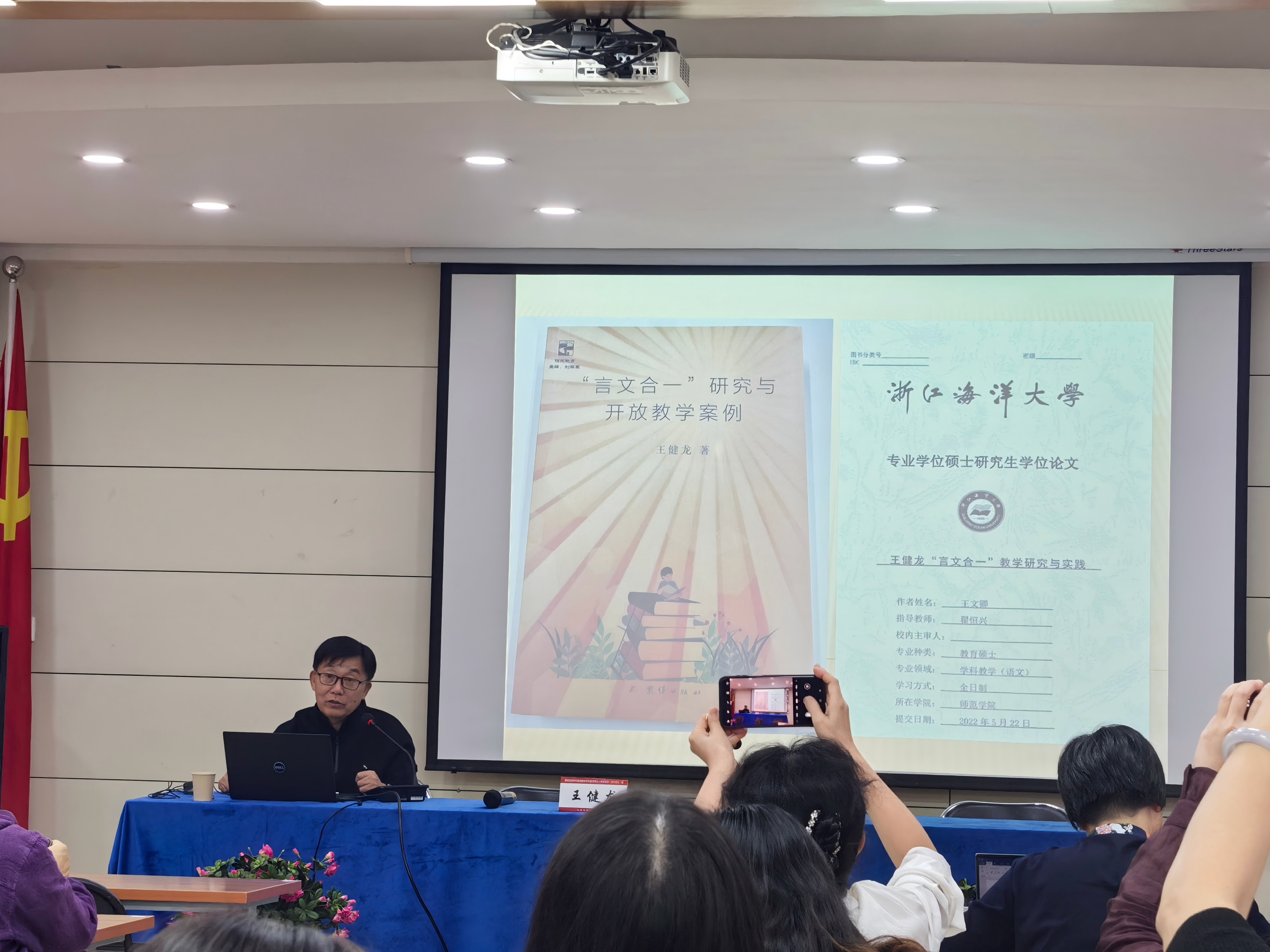 随后,众人移步讲堂,正高级教师、特级教师王健龙以“言文合一”为题,奉上一场思想与学术的盛宴。王老师虽年届花甲,仍躬耕于初三讲台,日日与少年相伴。他以毕生力作《言文合一研究与开放教学案例》为经纬,从理念溯源到学理探析,从课例实践到策略微探,层层展开,抽丝剥茧。