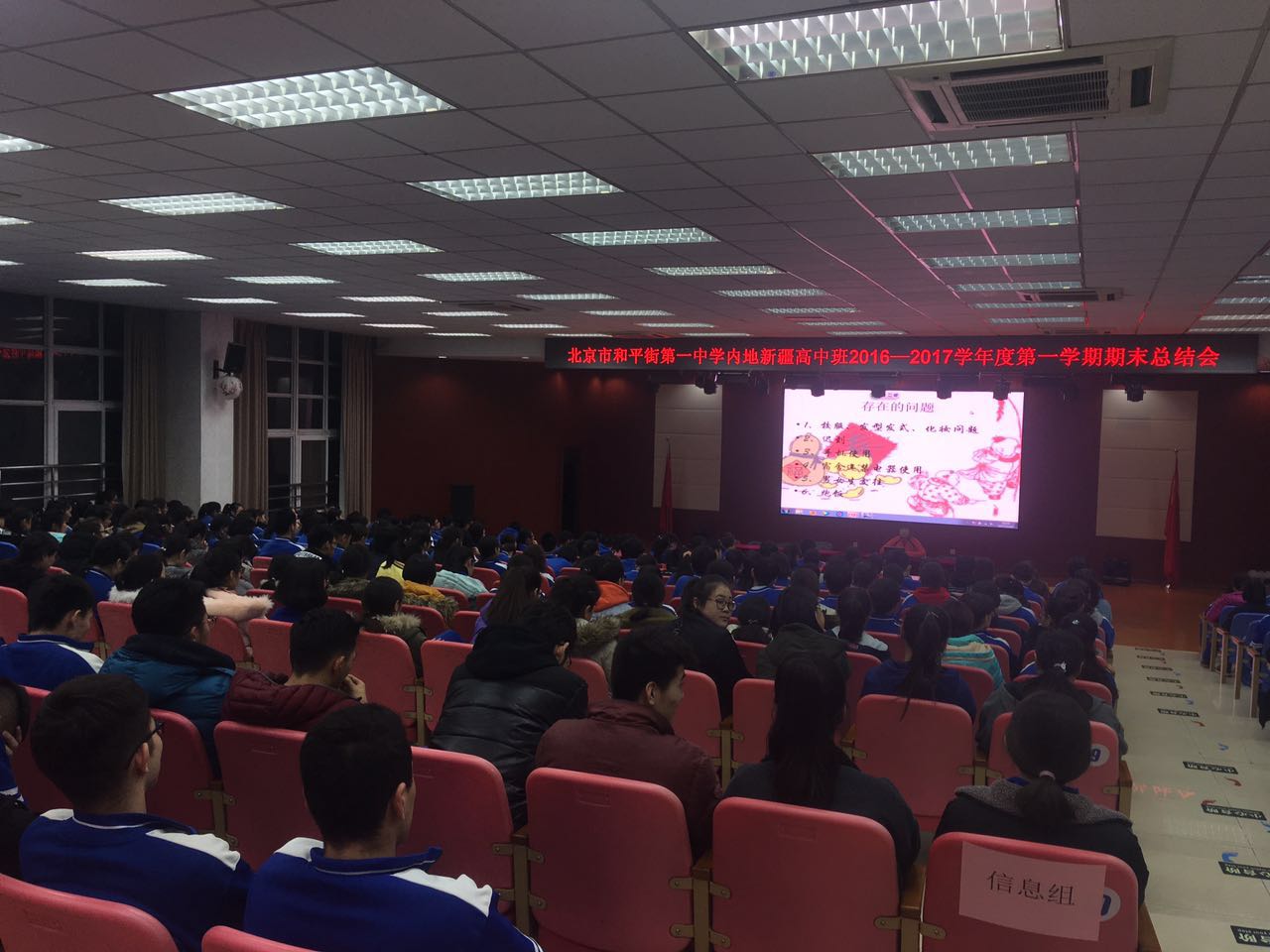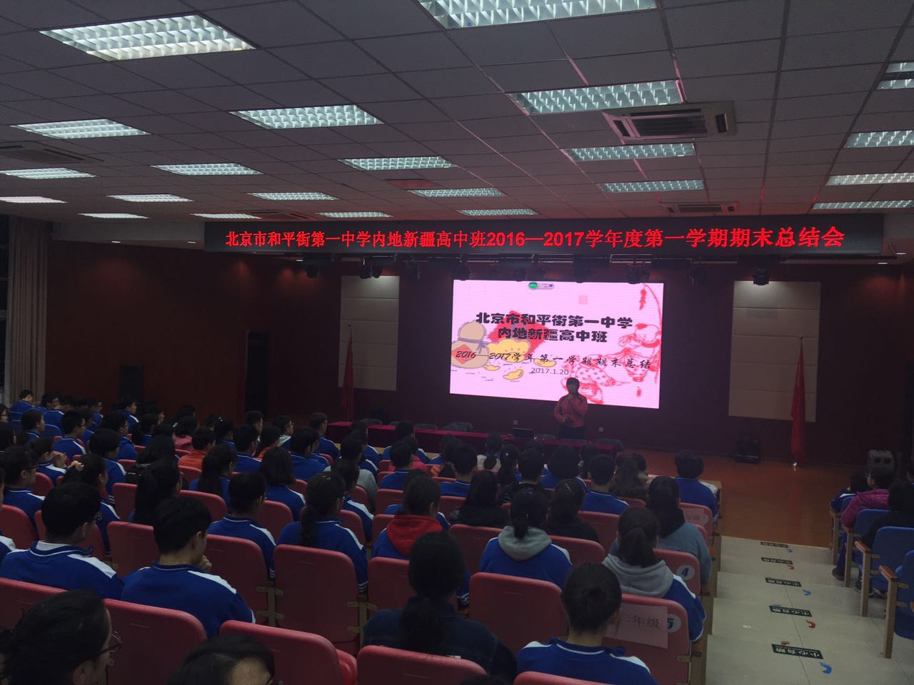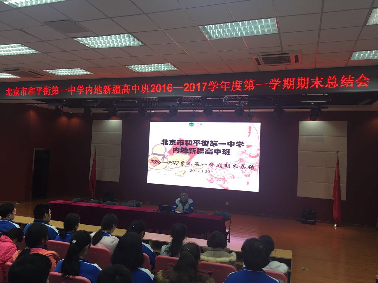 为了回顾总结各项经验,推动我校内高班工作更长久的开展,激励内高班学生再接再厉,自信阳光,成长成才,2017年1月20日晚19点,北京市和平街第一中学莲葩园校区召开了2016-2017学年度第一学期内地新疆高中班总结会。总结大会由学生发展处洪娟主任支持,刘鹏校长助理、德育教导员王建玲、刘争,内派老师出席了本次大会。