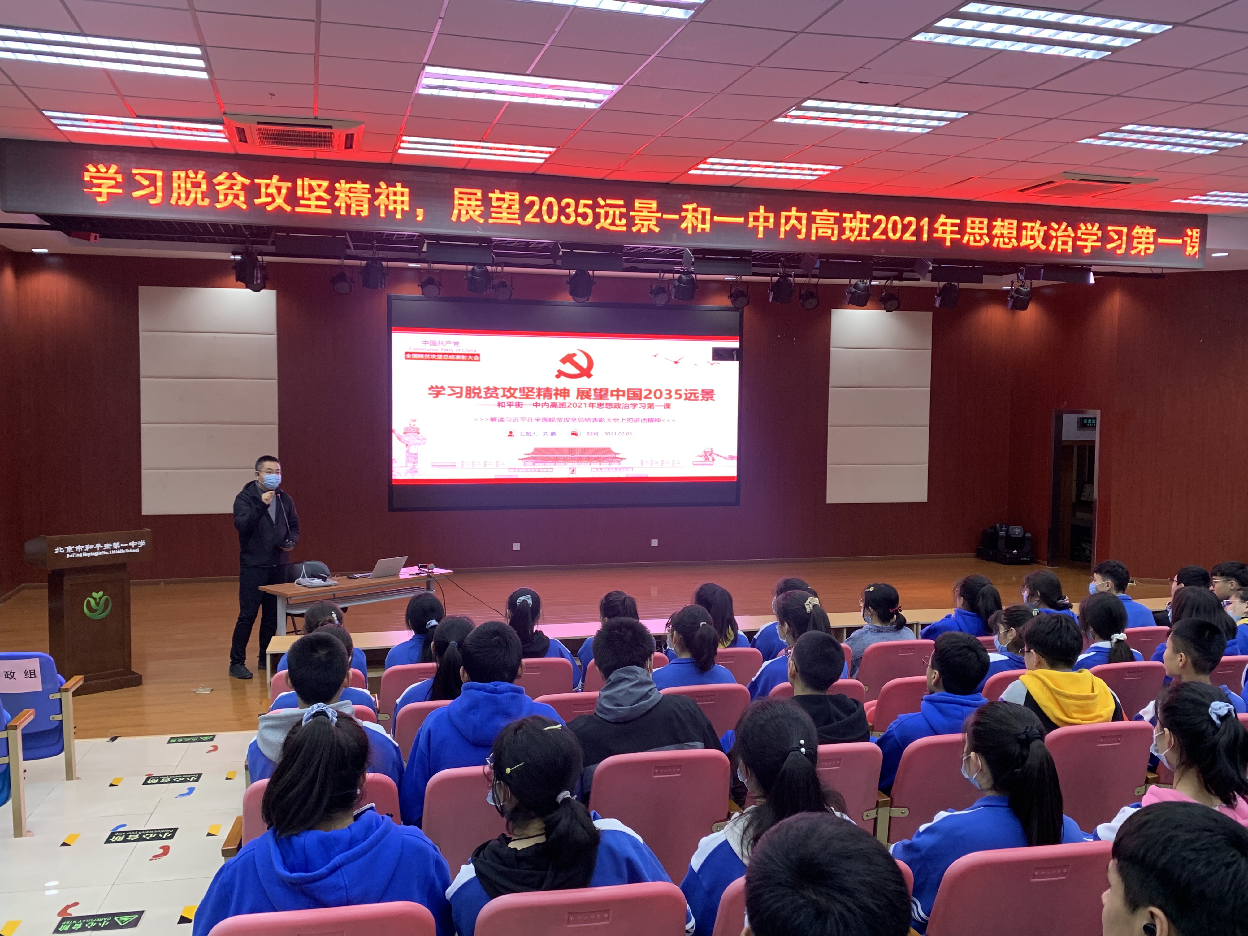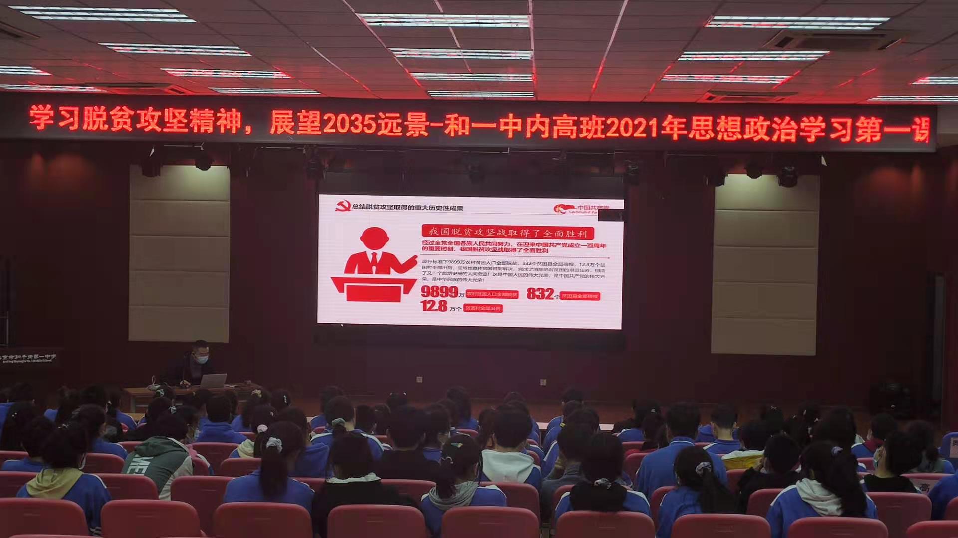 乘着全国脱贫攻坚表彰大会的东风,在2021年全国两会顺利召开之际,在新的学期开始之时,3月6日,我校内地新疆高中班进行了题为“学习脱贫攻坚精神,展望2035远景”的思想政治第一课,由刘鹏校长助理主讲。