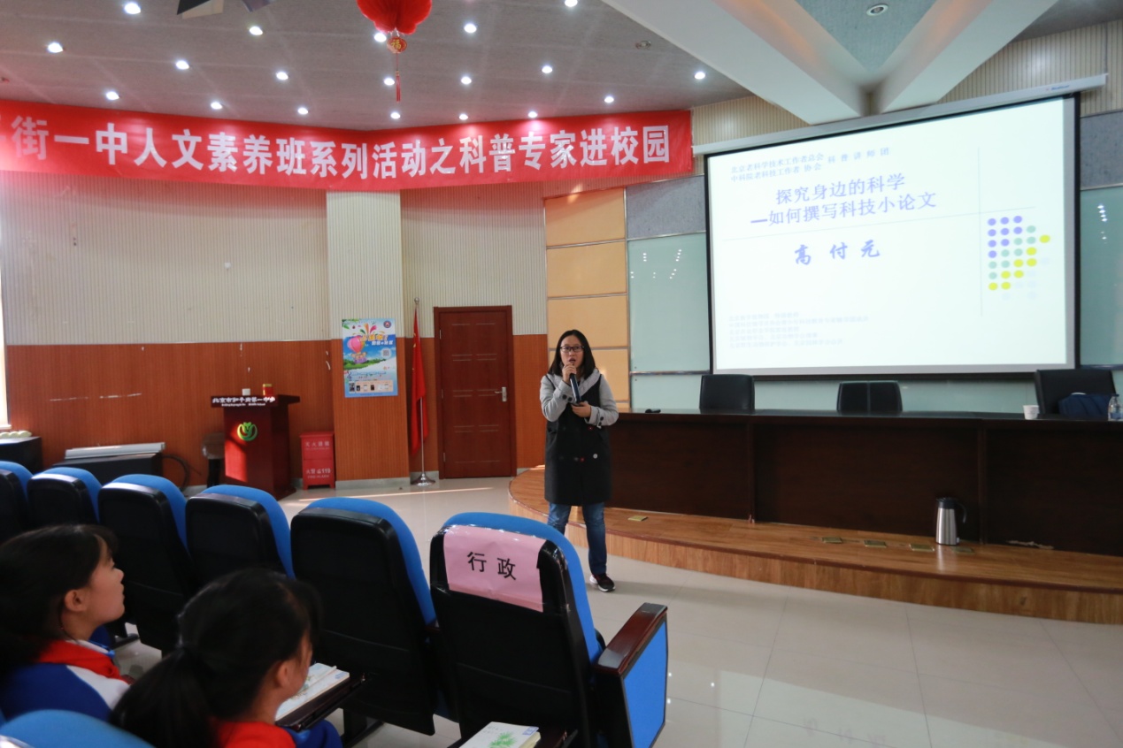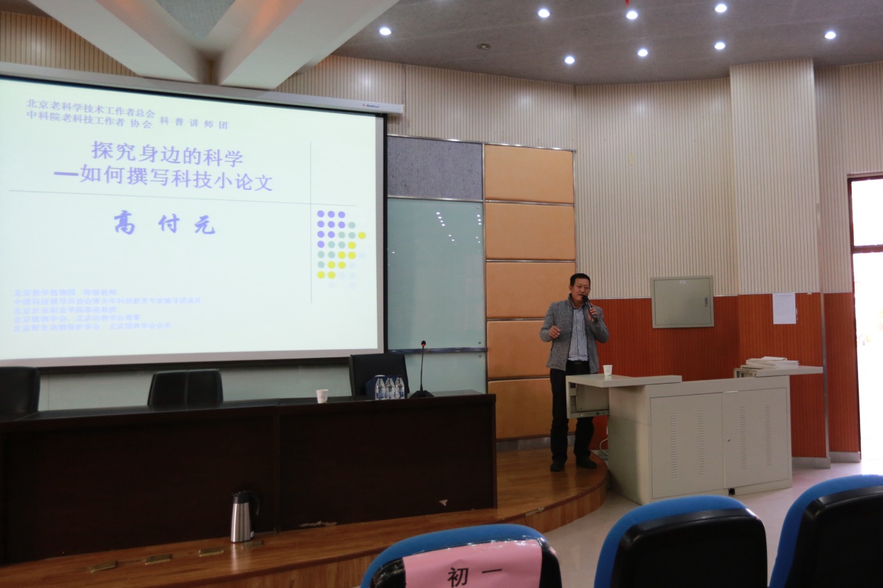本次活动特别邀请到北京教学植物园特级教师高付元专家为人文素养实验班的全体学生做主题为《探究身边的科学——如何撰写科学小论文》科普讲座。报告的内容包括四个方面:“理解科学、探索科学的线路、科技小论文的撰写、注意的几个问题”。之后,高老师结合两个论文案例《北京城区12种行道树树叶固碳能力比较研究》和《八月台湾旅游区常见蝶类物种考察》为大家讲解如何选题、如何研究、如何收集数据及如何撰写小论文等。
