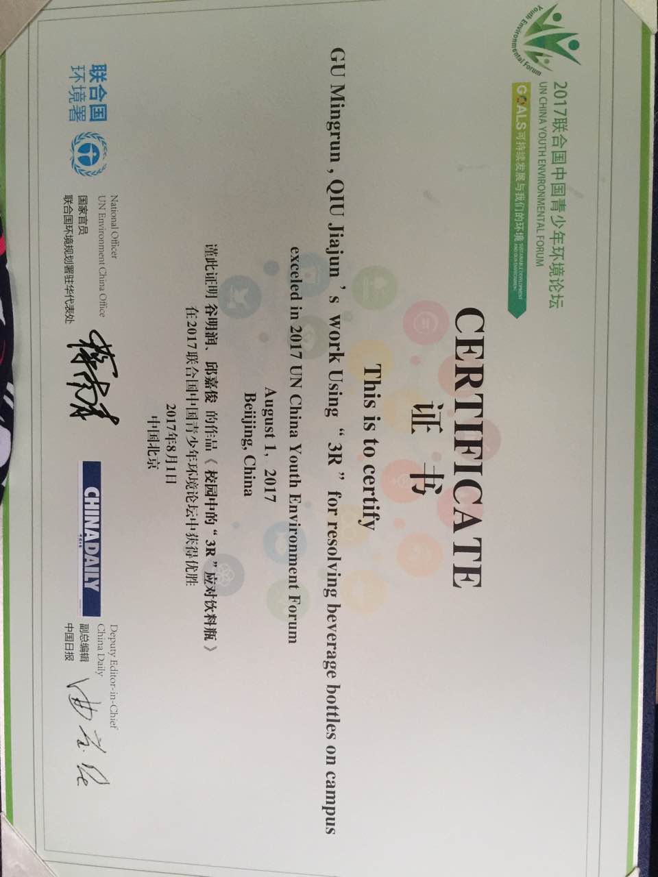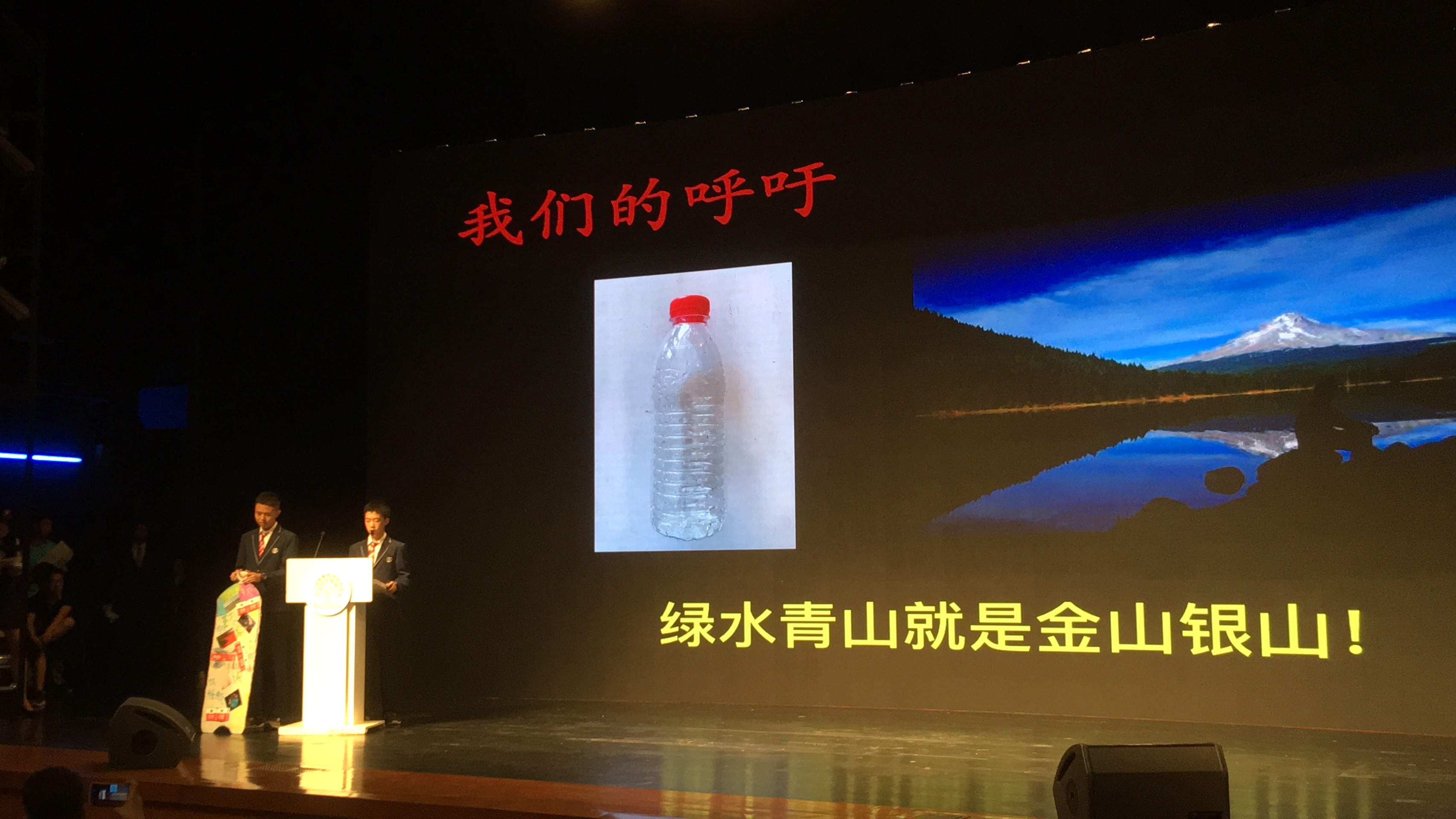 论坛上,两位同学先播放了一小段视频,引出“校园中每天产生大量饮料瓶”的环保问题,并由此推算出北京所有中小学校一年可能产生的饮料瓶的数量。随后,介绍“3R原则”并展示 “‘3R’应对饮料瓶”的视频,引起观众的共鸣。他们将利用饮料瓶自制的多肉花盆、泡泡机等小礼物送给现场观众,掀起一个小高潮。最后,他们引用习主席的 “绿水青山就是金山银山”作为整个演讲的结尾。最终,他们荣获了由联合国环境规划署驻华代表处和中国日报联合颁发的优胜奖证书。