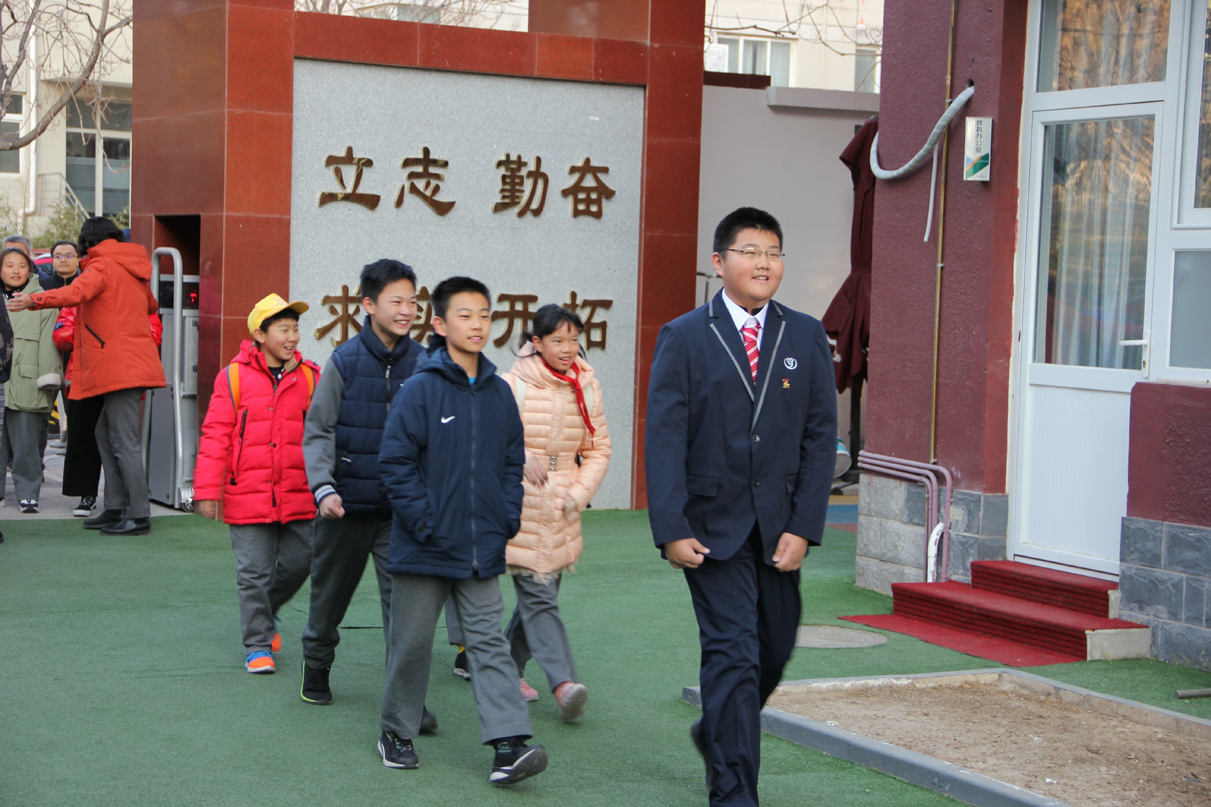 周六的清晨阳光明媚,奥运村校区初一年级部分学生,身着统一制服,精神饱满、朝气蓬勃地站在学校门口,迎接前来参加活动的国音附小学生。