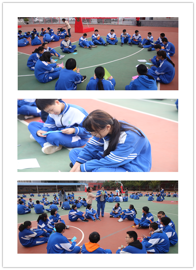 学生们在开心愉悦的游戏中,放松自己的心情,取得了很好的效果。最后的环节,每个人在彩纸上写下自己面对的压力与烦恼,然后折成飞机在操场上放飞,每人收到自己身边的纸飞机后打开阅读品味,并给予回应。五位班主任们也为所带班级的孩子们写下了寄语,一句句暖心的话打动在场的每位同学。师生们相互鼓励与支持,每个人脸上都洋溢着幸福、自信的笑容。