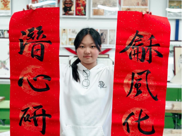 活动现场,社团成员杨景昀、严一漪和张曦月将烫画葫芦创作中锤炼的细腻手法与书法技艺相结合,铺展红纸、研磨润笔,凝神聚力间挥毫泼墨书写着由白林主任撰写的春联:“和衷聚力拓新路,锐意同心筑锦程”,和风化雨开智境,潜心研学探书山……一副副原创春联,既融入了对新春的期盼,又紧扣学校育人理念,更饱含着对学校的热爱与祝福。