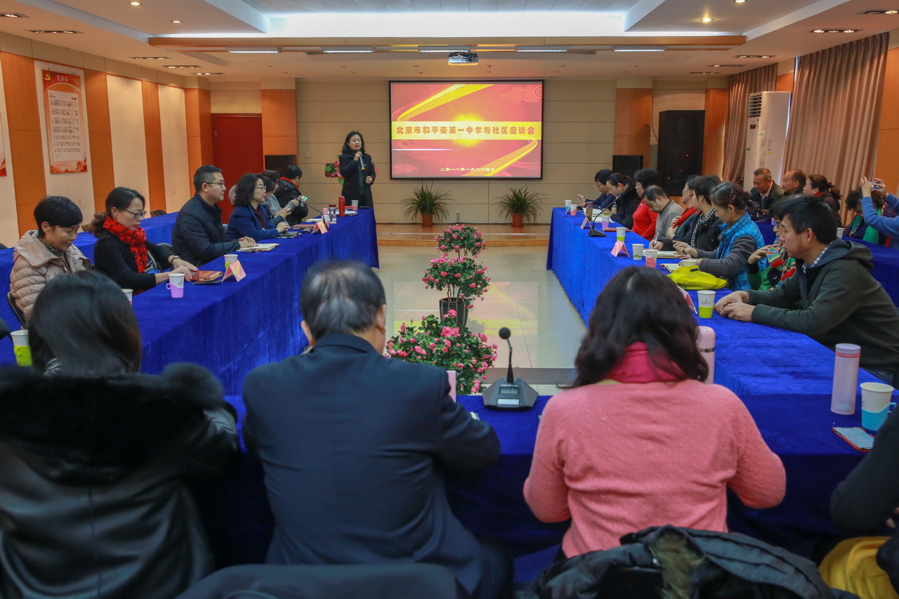 为加强与周围社区居民的联系与沟通,2018年1月24日上午,和平街一中在北苑莲葩园校区会议室召开学校、社区共建座谈会。来自北苑家园与朝来绿色家园的社区主任、居民代表40人参加座谈会。校长陈秀珍,北苑莲葩园校区副校长周建萍,朝来校区副校长张景鲜,清友园校区副校长殷桂萍、副校长蒋文杰等校领导参加会议。