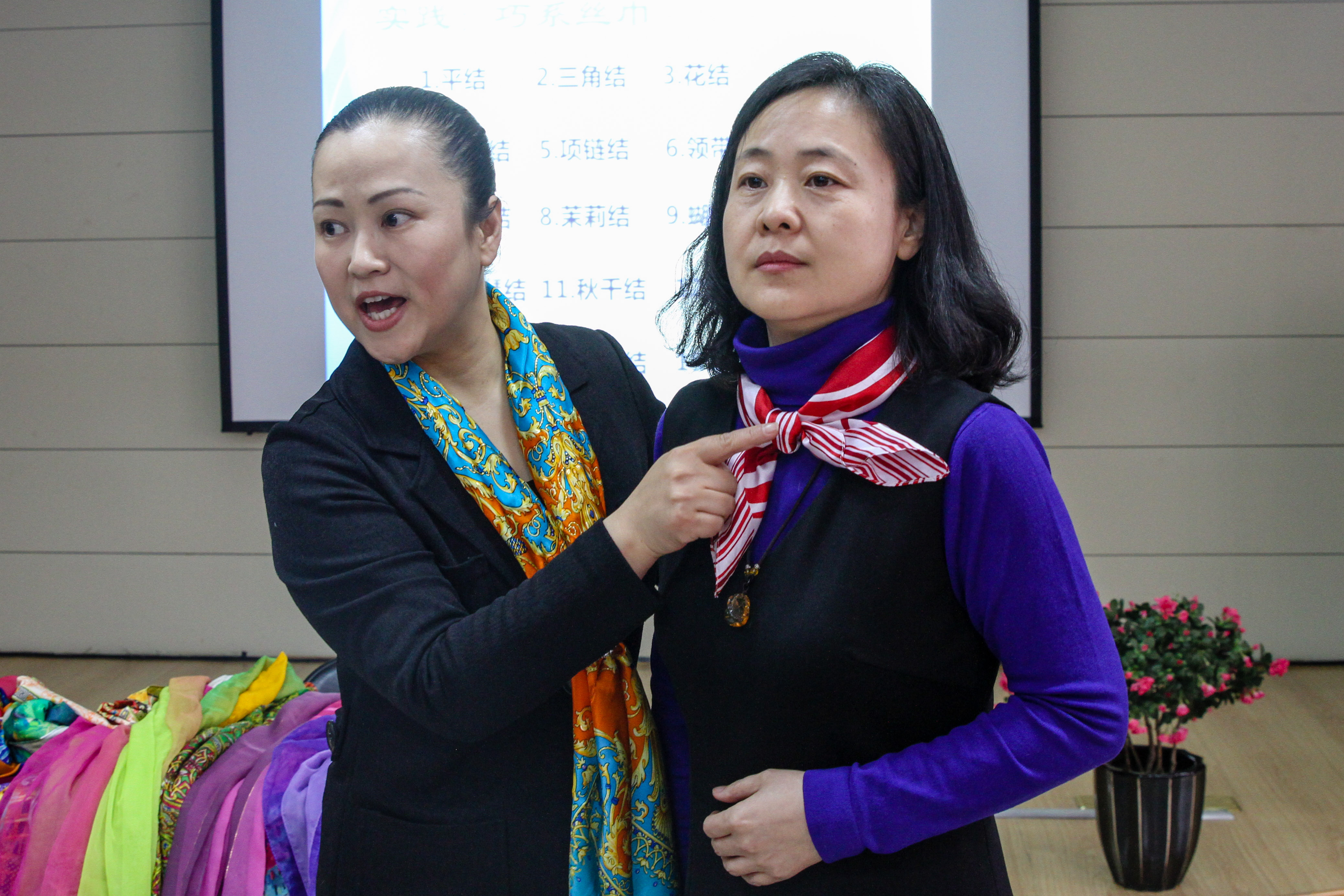 和平街校区和莲葩园校区分别请来礼仪专家王亚蕾老师和杨丽红老师为女教工们进行《服装搭配之玩转丝巾与配饰》的礼仪讲座,给老师们讲解丝巾的叠法、丝巾的系法、丝巾的围搭法以及日常礼仪。老师们们认真学习,积极体验,现场感受着成为精致、魅力、美丽女人的幸福。