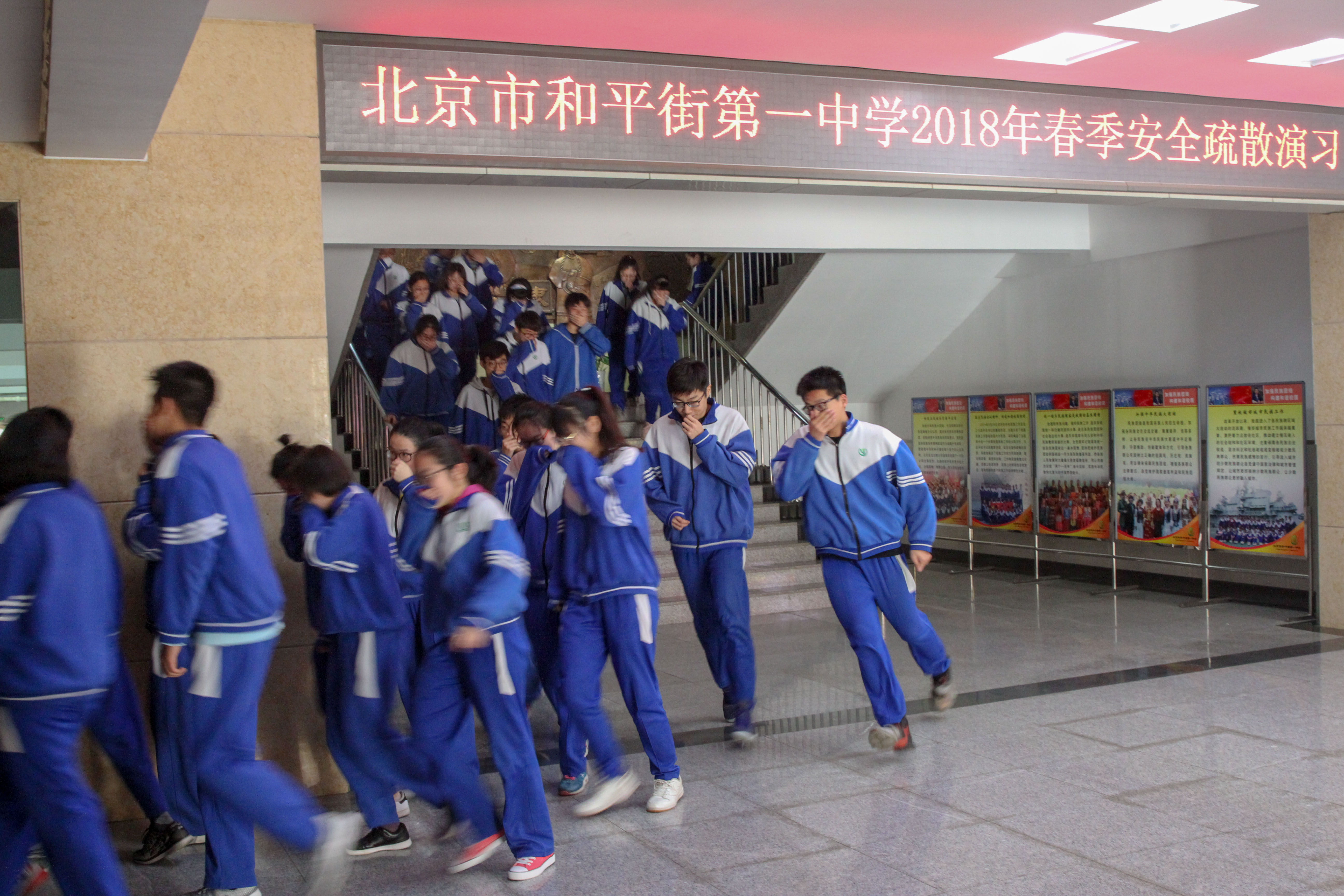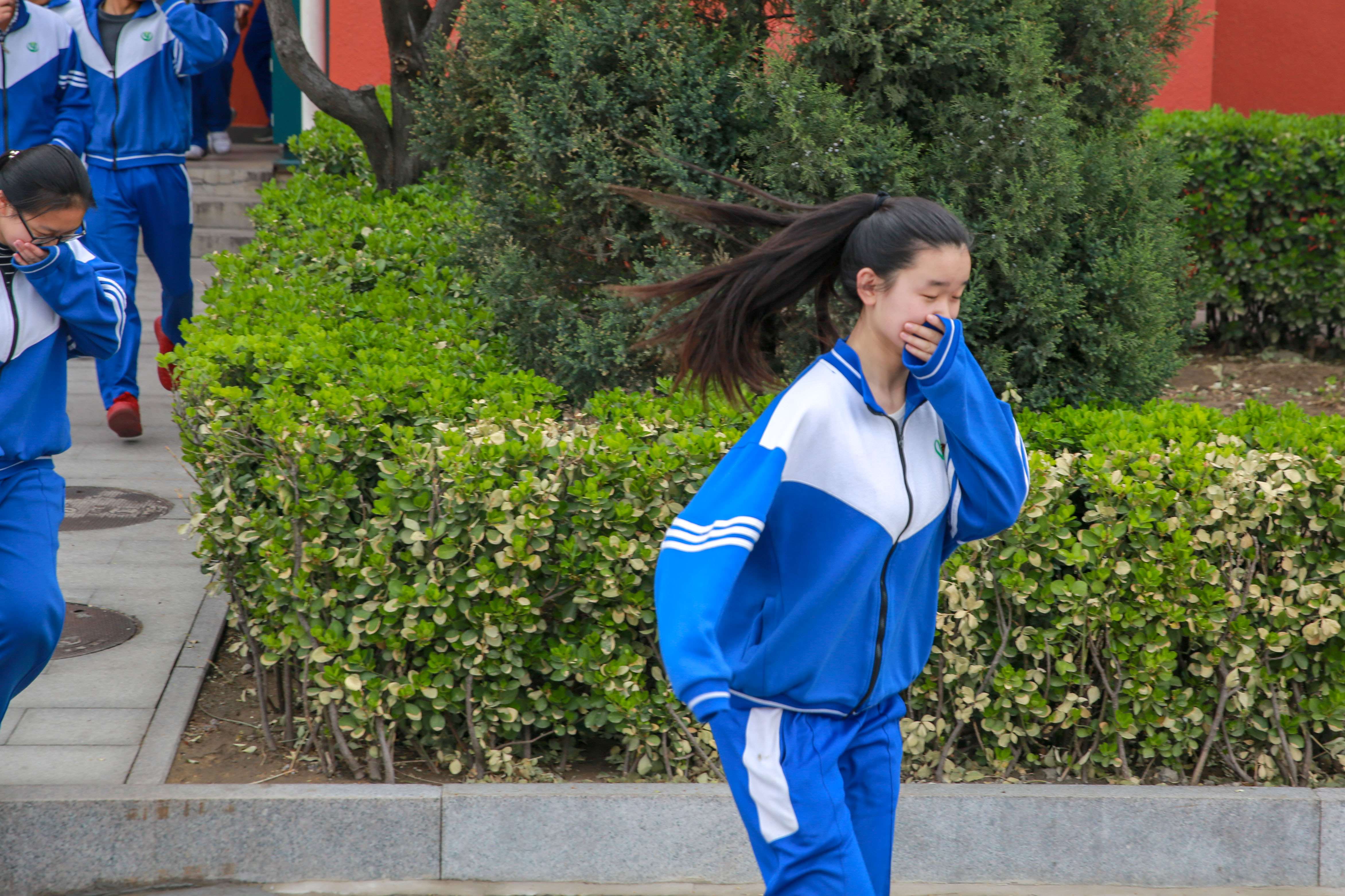 听到警报后,正在教学楼上课的学生,立即从座位上起立,快速有序地奔向走廊,根据疏散通道,弯着腰,猫着步,捂住口鼻,有序撤离到学校操场安全地带的指定位置站好。