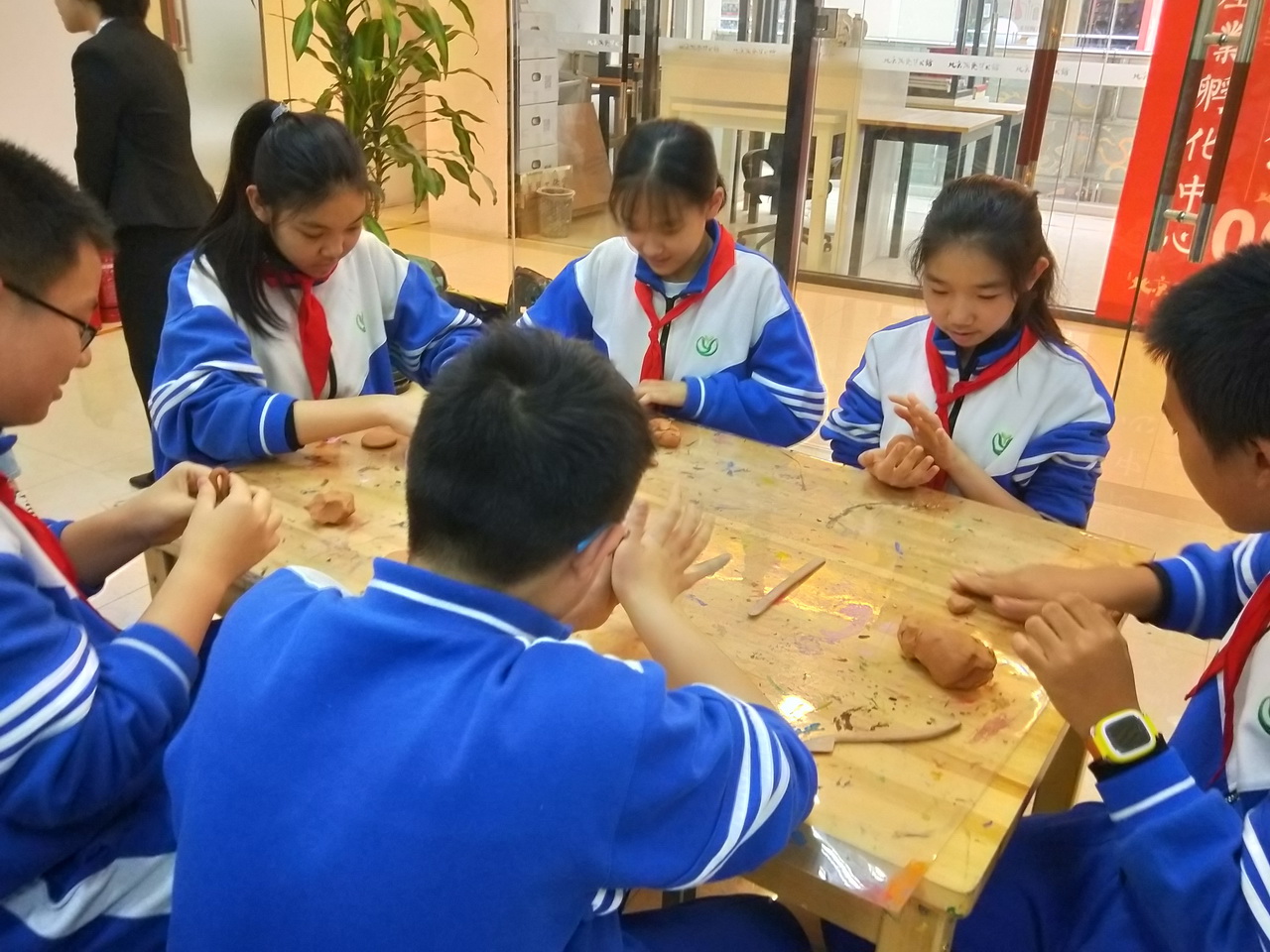 “给大家印象最深刻的莫过于拉坯。讲解员向同学们做了示范,先将一块泥团置于制坯机的中央,然后开启制坯机,随着制坯机的高速旋转,陶土在老师灵巧的手中,像魔术一样变出一个个可爱的造型,杯子、小碟、花瓶……我们看得眼花缭乱,心里已经抑制不住地跃跃欲试了。等到讲解员一声令下,我们迫不及待地‘动工’了。‘速度不要太快!’指导老师提醒。不过有些晚了,有的同学太急于求成了,结果泥团飞进了缝隙里卡住了;有的同学蘸水塑形时不小心将泥水溅了自己一身,狼狈地就像同泥巴打了一架;有的同学虽然塑成了形,却东倒西歪不成样子,与老师的‘模范作品’一比,简直惨不忍睹……尽管‘事故’层出不穷,最终我们都做出了自己的作品,心里满满的快乐和收获感。”
