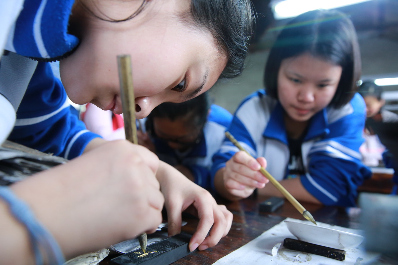除了看和听,此次学生更多地进行了做的体验。在徽雕博物馆,同学们尝试了戒尺的雕刻,感受徽州匠人的耐心、细心和对美的执着;在谢裕大茶行,学生们亲自采摘茶叶,体验了炒茶、揉茶、晒茶的工艺,学习了敬茶的礼仪;在胡开文老字号墨厂,学生进行了徽墨的制作,学习了用徽墨点字描图;在徽州古城,学生学习了剪纸,体验了黄梅戏的唱段。此外学生还尝试了自己制作包袱饺、烧饼等安徽美食。对徽州文化有了全方位的、立体的了解和感受。