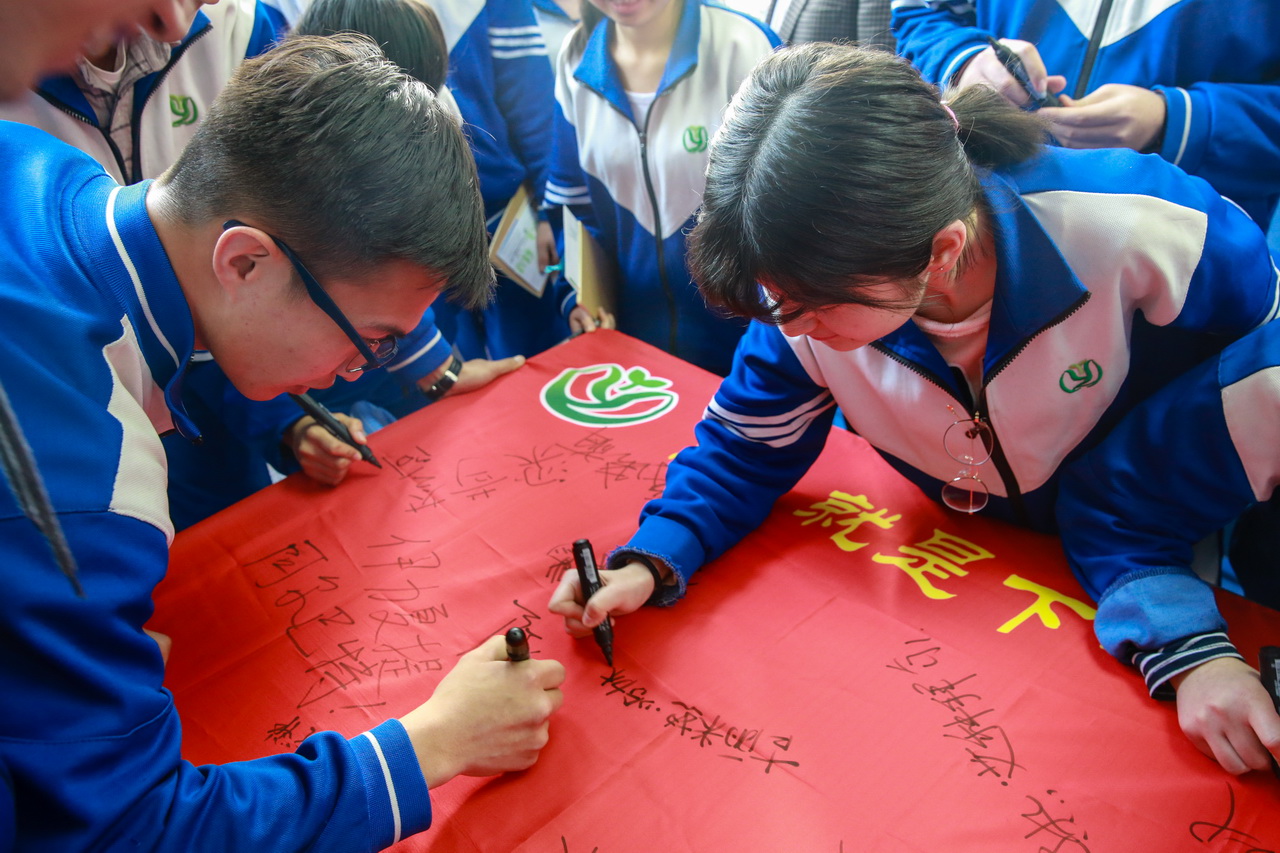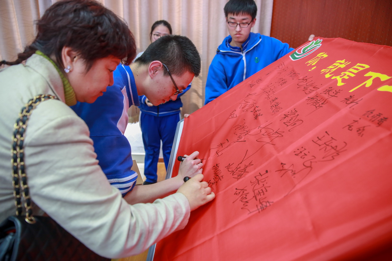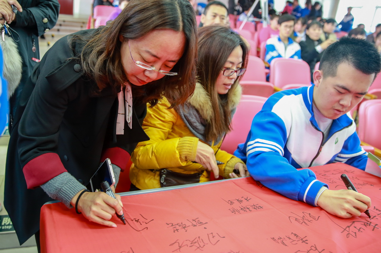 学校特邀请中国感恩文化继承人、中国感恩教育青年演讲家、心灵成长专家一竖老师前来作励志演讲,为高三学子鼓劲加油。一竖老师诙谐幽默的语言风格、鲜活生动的事例、感人肺腑的语言,深深打动了在场的每一位师生,赢得在场师生一次又一次的掌声,也使在场师生的心灵受到强烈的震撼和洗礼。全体高三学生及家长用签字笔在奇迹旗上郑重签下自己的名字,同时举起双臂,大声高喊出心中的誓言:“天王盖地虎,全上985 ;宝塔镇河妖,全上211”。