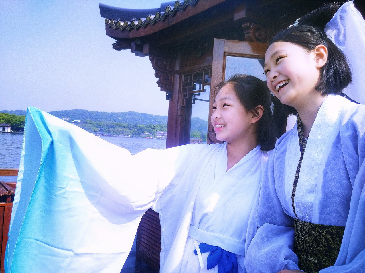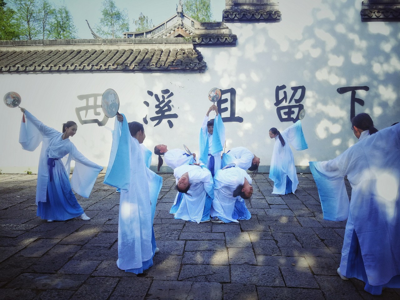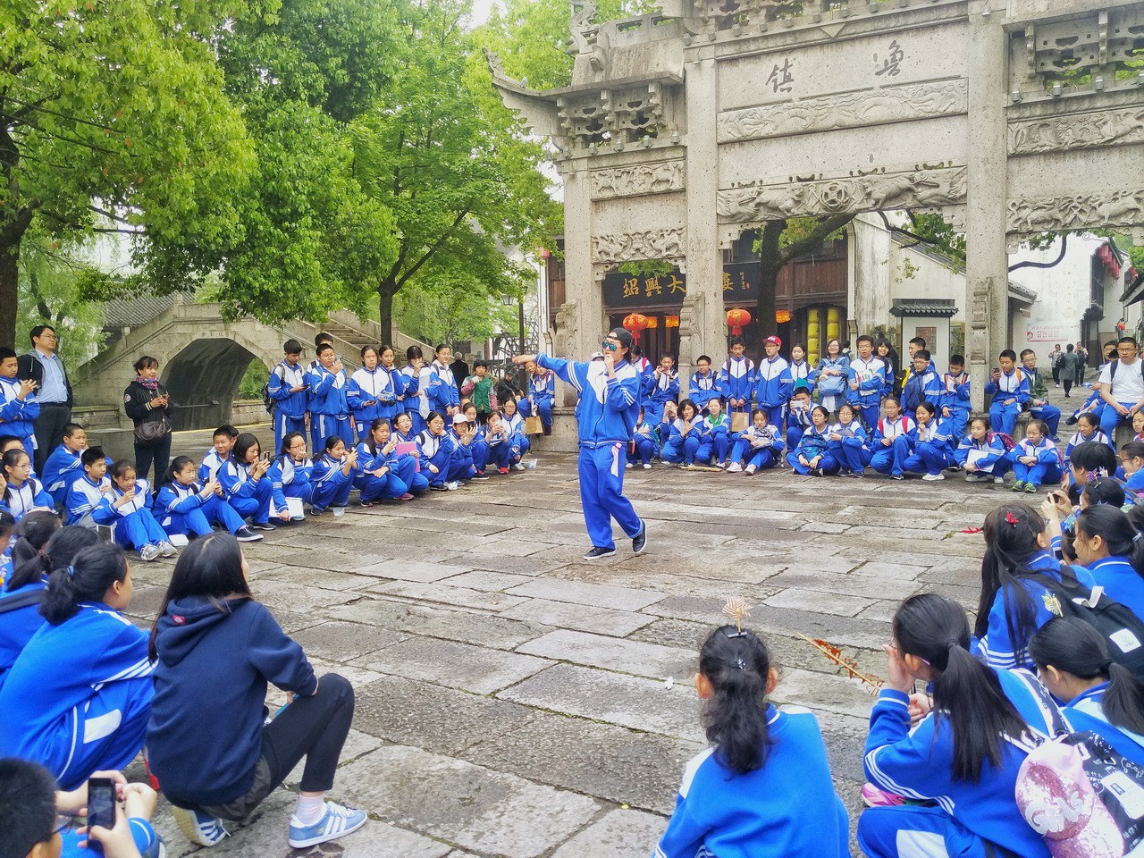 在素有“东方威尼斯”的绍兴,同学们在兰亭再现“曲水流觞”的兰亭盛宴,于茂林修竹之间集体吟诵。在王右军祠,飞檐之下,舞蹈小组的同学时而抬腕颌首,时而轻舒飘袂,手中扇起,似羲之笔走游龙,玉袖生风、翩翩起舞。在鲁镇,镇公所、鲁四老爷府邸、咸亨旅店、通济当铺、越瓷商行、古玩商铺一应俱全,还有“阿Q”、“祥林嫂”等人物行走在街头,让同学们直接融入到课本里鲁迅笔下的世界。
