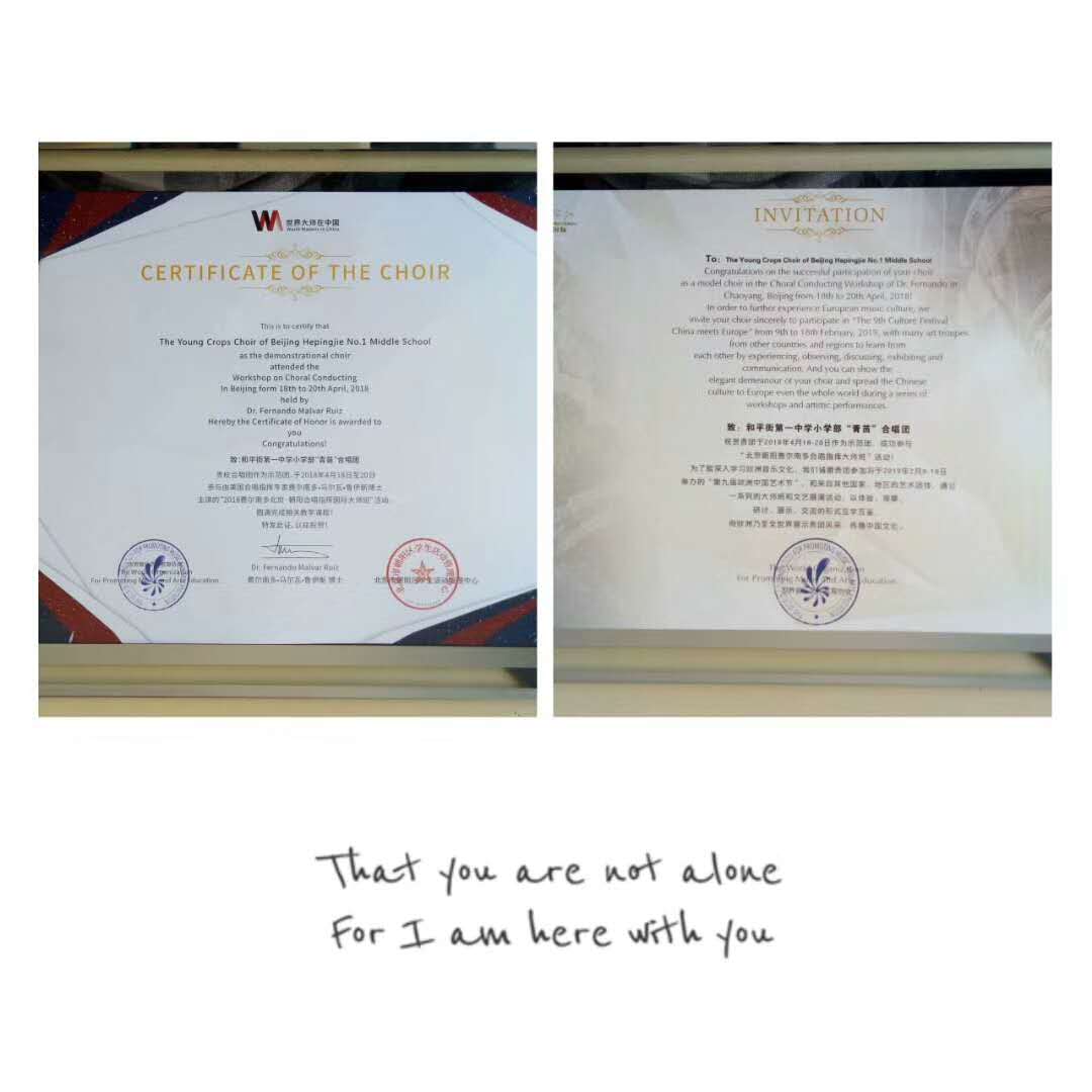 展演的最后,进行了颁奖仪式。蒋文杰副校长、张馨文老师、周伶老师代表青苗合唱团,接受了组委会及费尔南多博士授予的示范团证书及邀请函。这真是青苗合唱团一次难忘的经历!