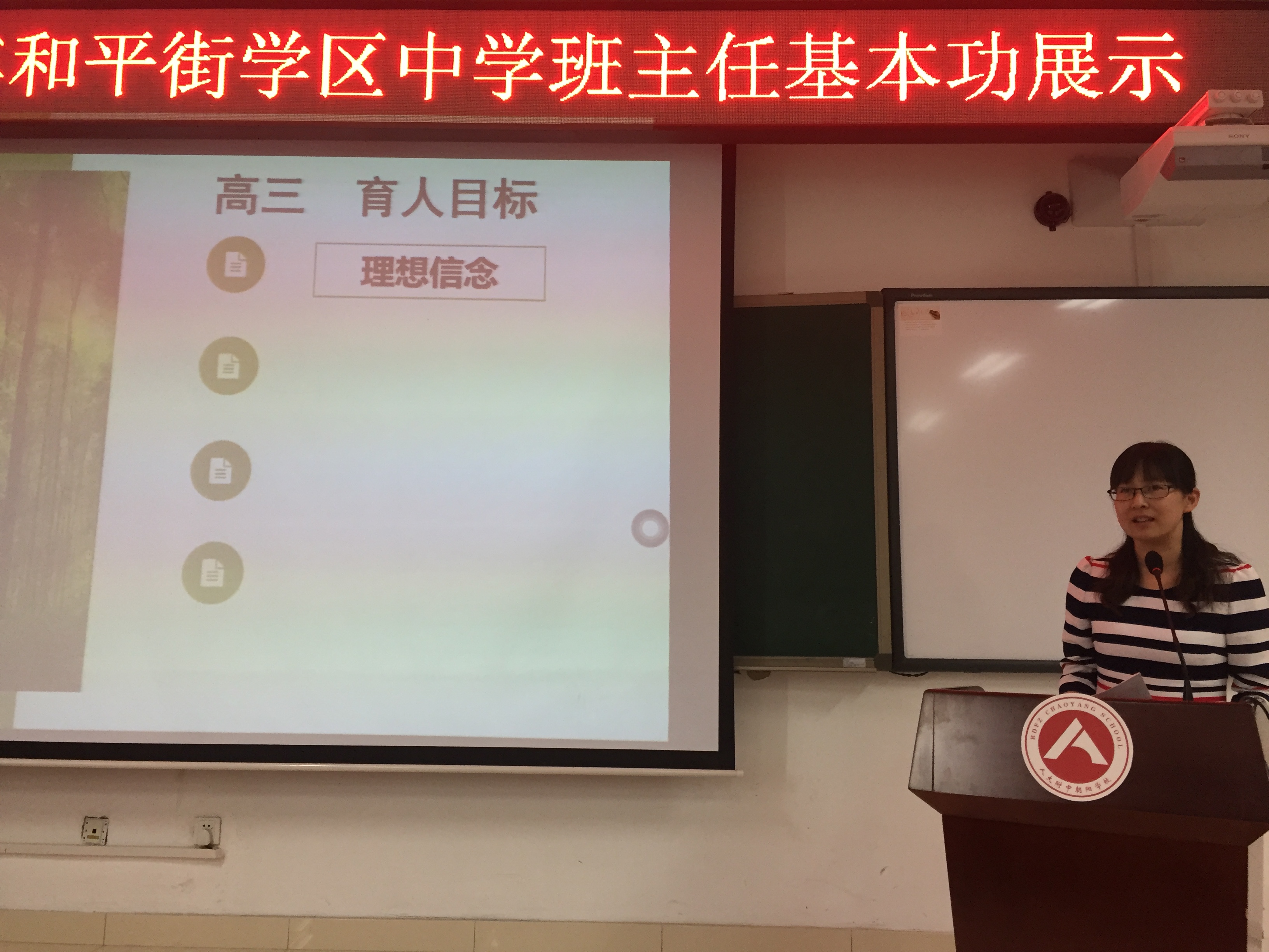 在朝阳区教委大力重视班主任队伍建设的大好形势下,为进一步探索新形势下班主任队伍建设的新途径、新方法,推进班主任队伍专业化发展,2018年5月24日下午,和平街学区在人大附中朝阳学校召开了“第二届班主任基本功展示”活动。通过学区内各校推荐、选拔,包括和平街一中初中夏曼青老师、高中王瑞雪老师在内的共计9名优秀班主任进入了和平街学区的最后决赛。参与本次活动的还有片区各校德育干部、部分老师。