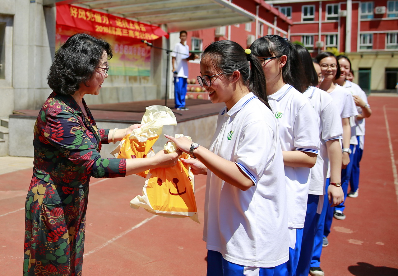 升旗仪式结束后,四位高二年级学生代表为高三学长们深情朗诵诗歌,送上诚挚祝福。高三年级组长梅晓璇老师、李伟老师分别发表了热情洋溢的讲话,回顾了高三学子在校三年的点点滴滴;叮嘱高三学子准确定位,调整心态,控制节奏,充分思考,清清楚楚,胜券在握;并鼓励同学们勇往直前,决胜高考。和平街初中校区教学处主任李春光代表校区师生为高三学生送上祝福,李主任表达了对学生充满期待、兴奋和不舍的心情,鼓励学生淡定、自信、从容的面对高考,用自己的胆识、勇气、实力和智慧去创造属于自己的辉煌!最后,校长、书记还有全体高三年级组的老师们与同学们击掌鼓劲,为每一个孩子送上精心准备的“和一福袋”,里面装着由校领导亲自包装的“状元饼”、成人仪式光盘、高考备忘录和送给学生的一封信。活动在热烈的掌声中落下帷幕。