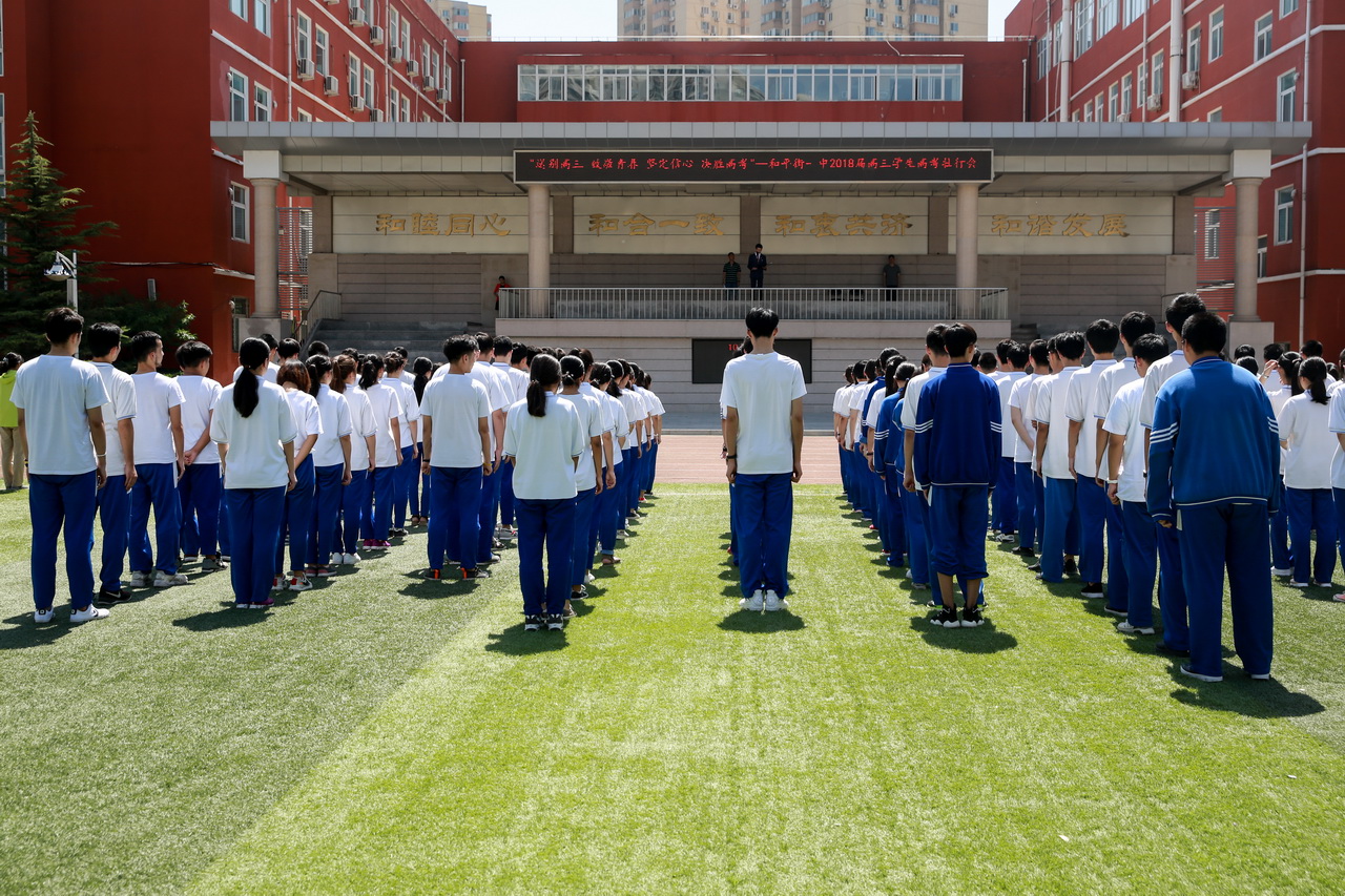 在非毕业年级学生的夹道欢迎中,高三全体学生跟随着音乐大步入场。