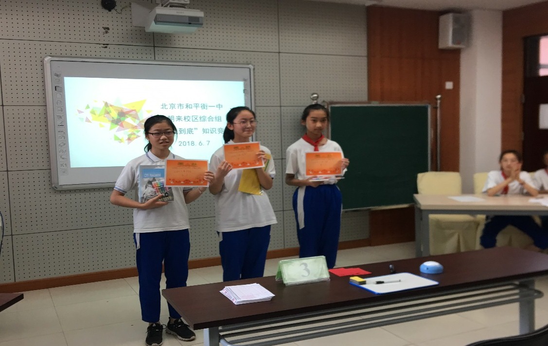 比赛分为三个环节:唾手可得、生死时速、力挽狂澜。竞赛现场气氛十分热烈,必答题环节选手们小心谨慎;抢答题环节,每题必争;最后在“力挽狂澜”环节中选手进行一对一PK,展现出和一学子的机智、霸气。经过三轮的激烈角逐,最终初二(9)的艾梦涵同学凭借扎实的政史地知识功底获得了本次比赛的第一名,初二年级的刘逸菲,初一年级的耿乐分获第二名和第三名。现场观众也积极参与到本次活动中来,不仅参与了游戏环节的趣味知识竞答,还作为助援团为比赛选手提供帮助。
