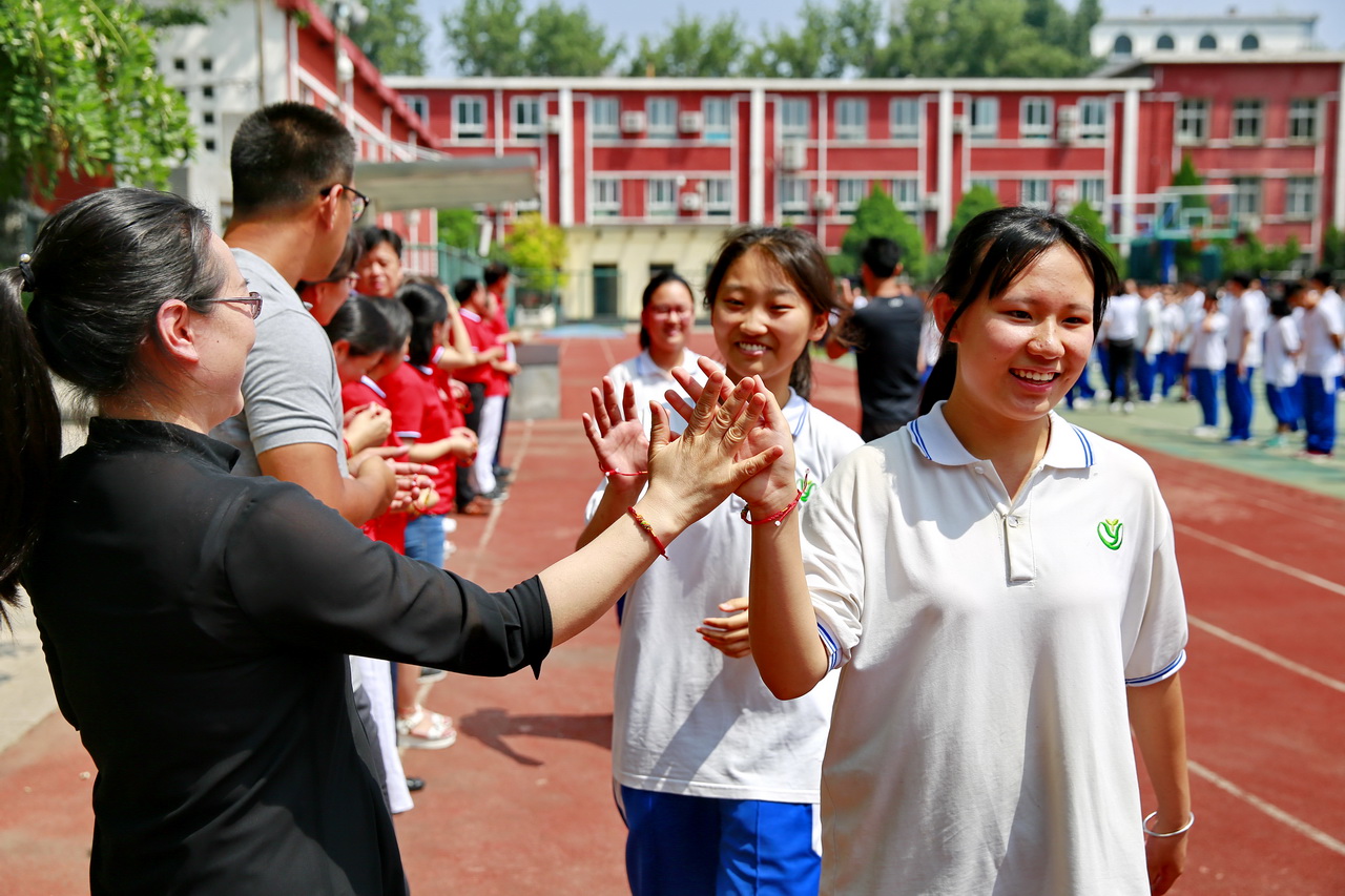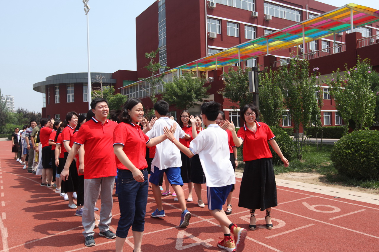 初三年级学生在音乐声和同学们的掌声中缓缓入场。初三学生代表高卉进行了发言,表示了对师长们的感恩之情,表达了决胜中考的信心和决心。高一学长、2017届初三毕业生王云飞同学向全体初三学生送上了祝福并希望能在高中继续看到大家的身影;朝来校区学生代表曹乃安同学给初三学生送去最美好的祝愿,愿他们中考金榜题名,满载而归,为自己的初中生涯留下辉煌的一笔。教师代表王健龙老师用慷慨激昂、饱含感情的语言为初三学生加油,希望他们用百倍的信心,坦然面对考试。曹成勇副校长也发表了热情洋溢的讲话,他鼓励同学们要直面挑战,从容应考,并预祝大家能超常发挥,再创辉煌。活动最后,和平街校区的领导与老师们、朝来校区的学弟学们为每一位初三年级学生佩戴象征幸运的红绳,祝愿他们金榜题名。初三学生们伸出双手跟领导、老师们一一击掌,接受老师们的祝福。