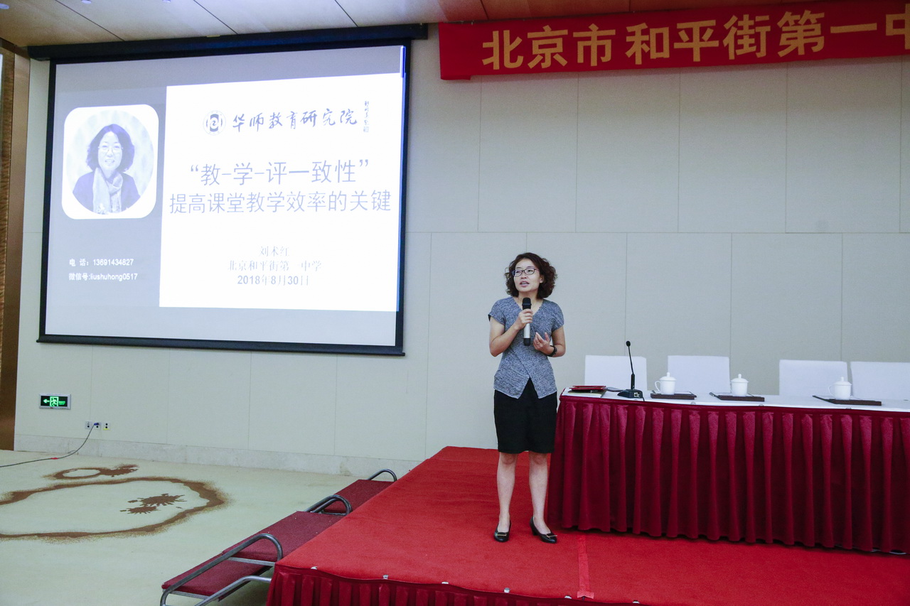 华师教育研究院副院长刘术红应邀前来为全体教师做了题为“‘教—学—评一致性’提高课堂教学效率的关键”的讲座。刘副院长认为目前教师在制定教学目标中存在“缺位、虚位、错位”等问题,指出“有效教学的所有问题都与教学目标的设置有关,教学目标设置的所有问题都与课标的分解有关”,并提出要从“分析学情、分析课标、分析学材”三个原则出发叙写学习目标。她结合大量的案例说明了标准如何转化成目标、目标如何在课堂落实、落实后如何检测评价等一系列策略与方法;明确了基于课程标准的学习目标制定与叙写的步骤:即确定关键词、核心概念分解,根据概念图、分解行为动词,确定行为条件和行为程度,写出学习目标。培训中,刘副院长与教师们积极互动,通过提问、追问等方式引导老师们深入理解“教、学、评一致性”的要求。