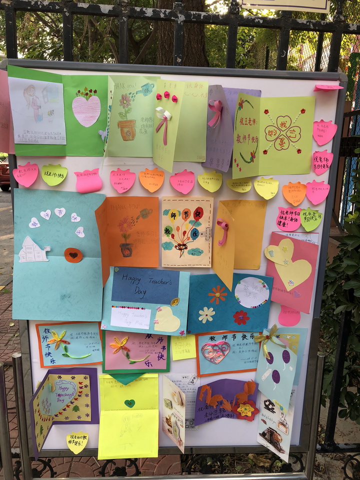 一大早,各校区就提前布置好了“感恩教师节展板”。伴随着悠扬的音乐,同学们陆续来到校门口,写下对教师的祝福,并亲手把它贴在“教师节纪念展板”上。由学生装扮成的吉祥物和每一位老师热情的拥抱,让老师们真切的感受到教师节的来临。朝来校区的同学们在前一天就将各班亲手折叠成串的千纸鹤挂在教职员工办公室门口两侧,中间贴上“教师节快乐”字样的祝福画。暖心的孩子们,还用“胶钉”设计成“心形”粘贴千纸鹤挂串和祝福画的四个角,表达对全体教职员工祝福的心愿!