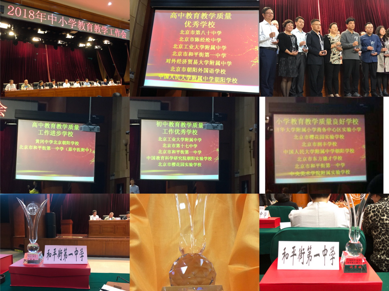 2018年9月26日,朝阳区2018年中小学教育教学工作会在平谷召开。大会对2017-2018学年度全区教育教学工作情况进行了总结和表彰。和平街一中小、初、高三个学段同步收获丰硕教育教学成果。学校喜获朝阳区高中教育教学质量优秀校、初中教育教学质量工作优秀校荣誉!学校小学部喜获朝阳区小学教育教学质量良好校荣誉!在此,对学校的发展表示热烈祝贺!对全校教职工的辛勤付出表示衷心感谢!