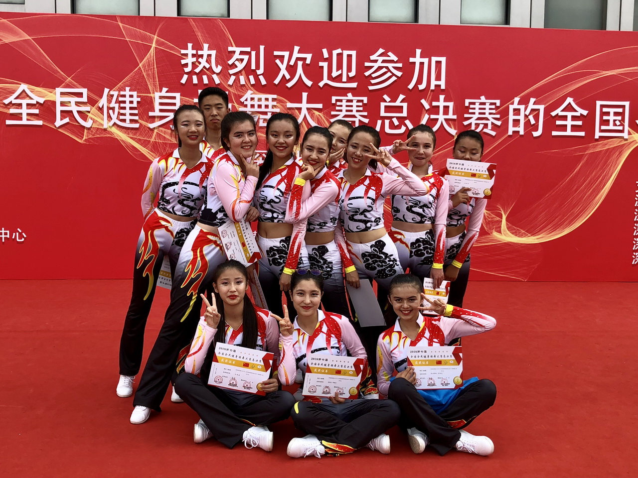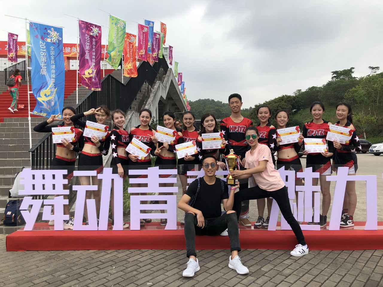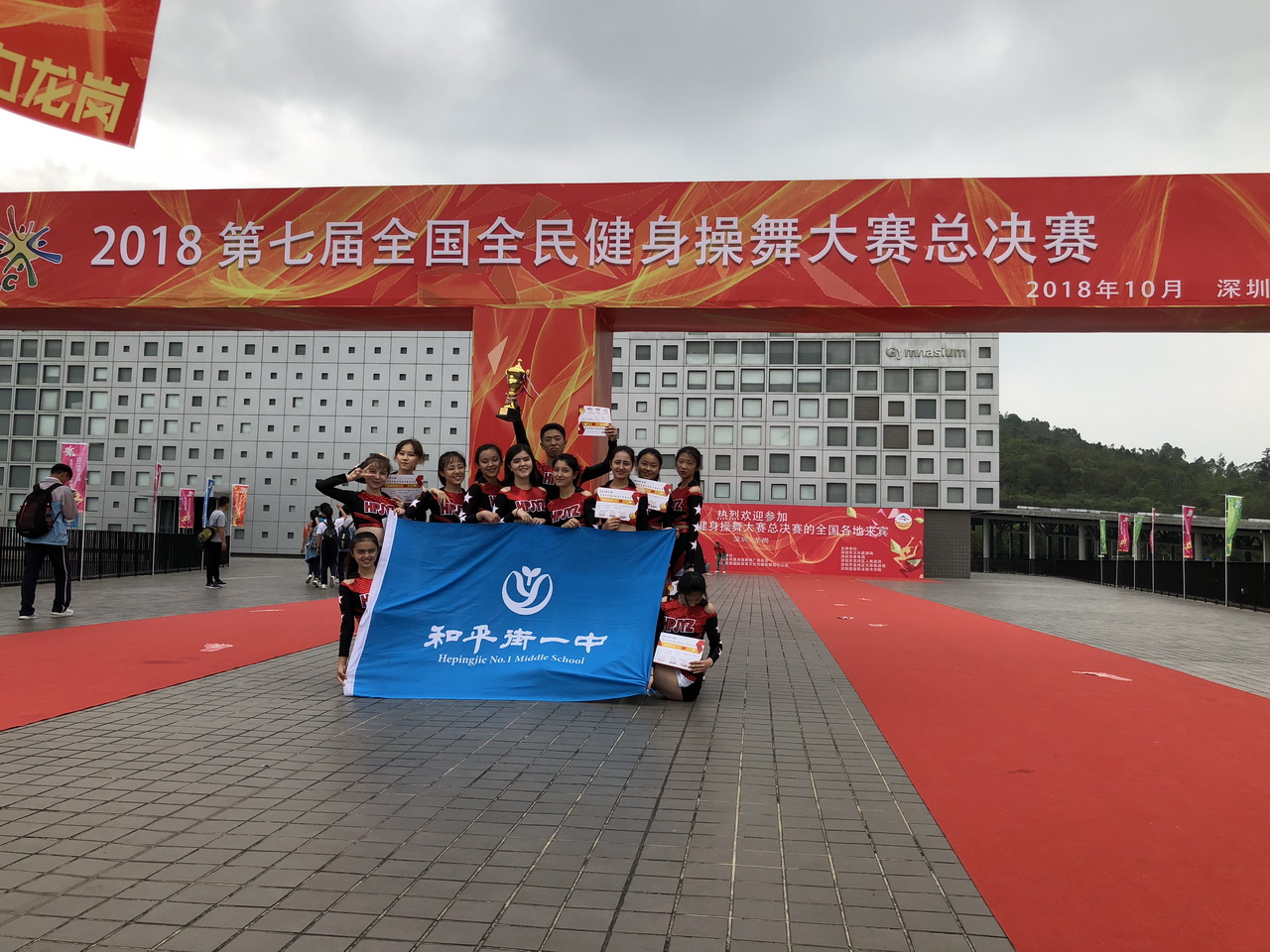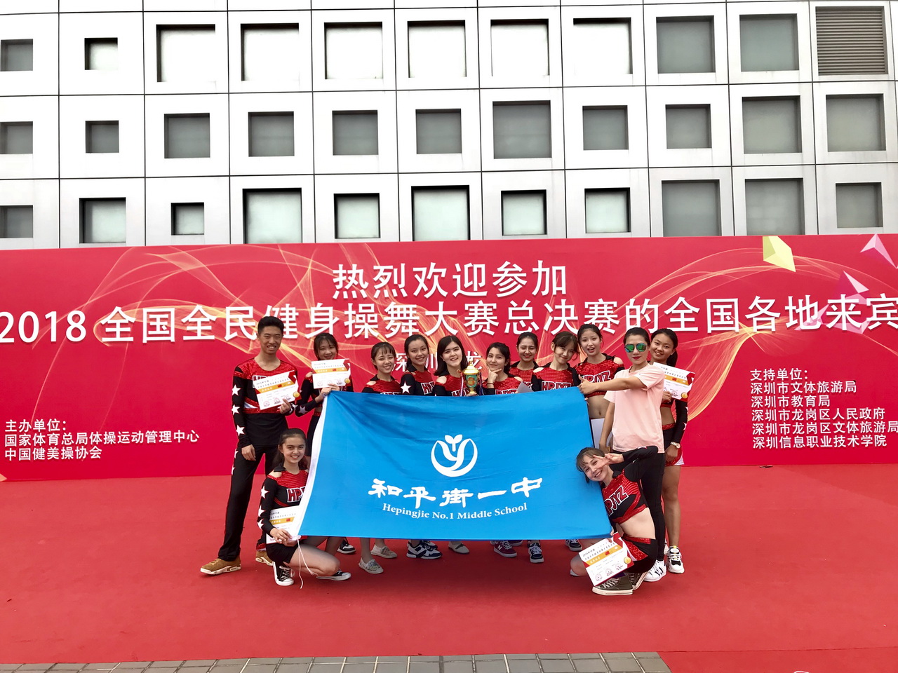 2018年10月23-25日,和平街一中高中健美操队在沙金老师、郑旭老师的带领下,赴深圳参加2018第七届全国全民健身操舞大赛总决赛。在两个项目均是第一个出场的不利条件下,同学们克服困难,以全场最高分获得全民有氧4级第一名特等奖、全民有氧5级一等奖以及最佳团队奖的优异成绩。同时,沙金老师还荣获“优秀教练员”称号。