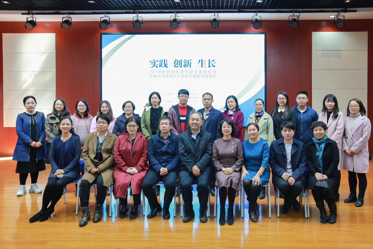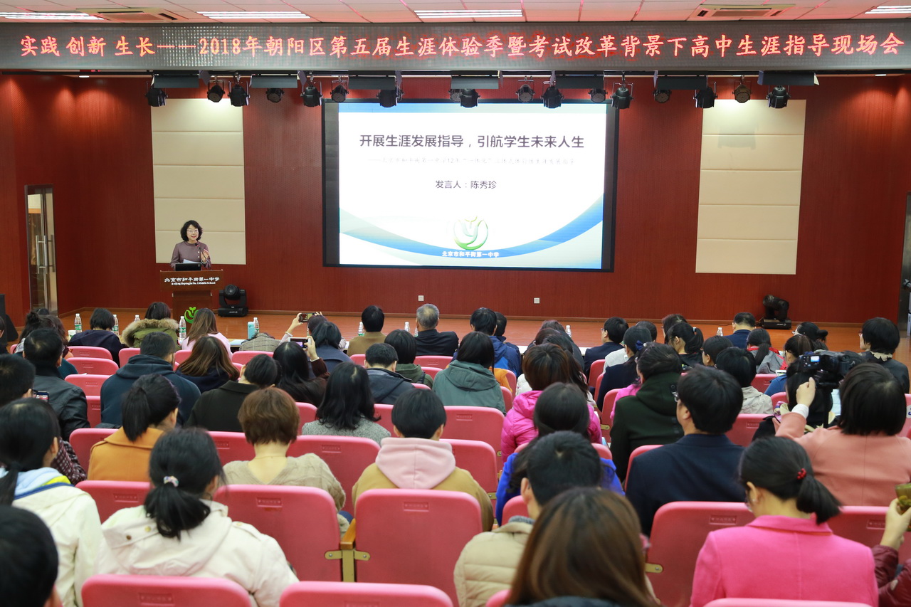 2018年10月31日,朝阳区第五届生涯体验季暨考试改革背景下高中生涯指导现场会在和平街一中莲葩园校区顺利召开。朝阳区教委副主任徐志辉、职成科科长蔡芳、副科长刘志如及区教研中心副主任陈洪等领导出席大会,北京工商大学林永和教授、北京教育学院教育生涯项目负责人曹新美教授和她的项目团队专家成员前来指导,朝阳区各校相关教师近300人参加了会议。