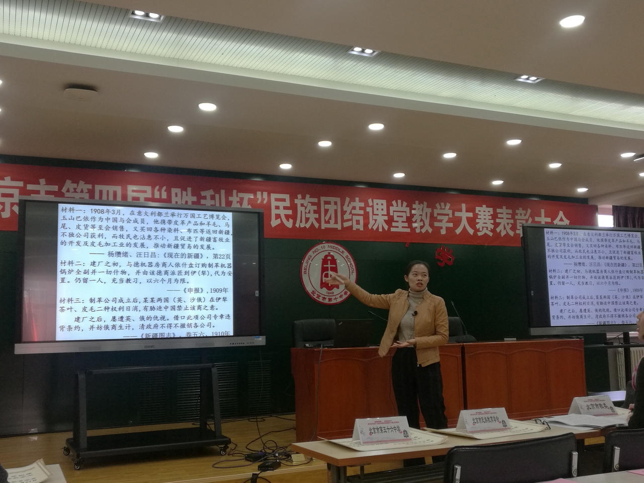 北京市第四届“胜利杯”民族团结教育进课堂教学大赛于2018年11月27日圆满落下帷幕。本届大赛由北京市民族教育学会、丰台区教育委员会主办,丰台区教育分院、丰台十中承办。在总结表彰会上,和平街一中莲葩园校区的郝雏凤老师展示说课,为全市开展民族团结教育的领导和老师示范如何在历史课上开展民族团结教育,受到与会领导和老师的一致好评。北京四中历史特级教师李明赞做了精彩点评。他称赞郝雏凤老师的说课基本功扎实,学科教学与民族团结教育结合平实,凸显了历史学科的思想、方法和训练,体现了郝老师一贯朴实、踏实的教风。