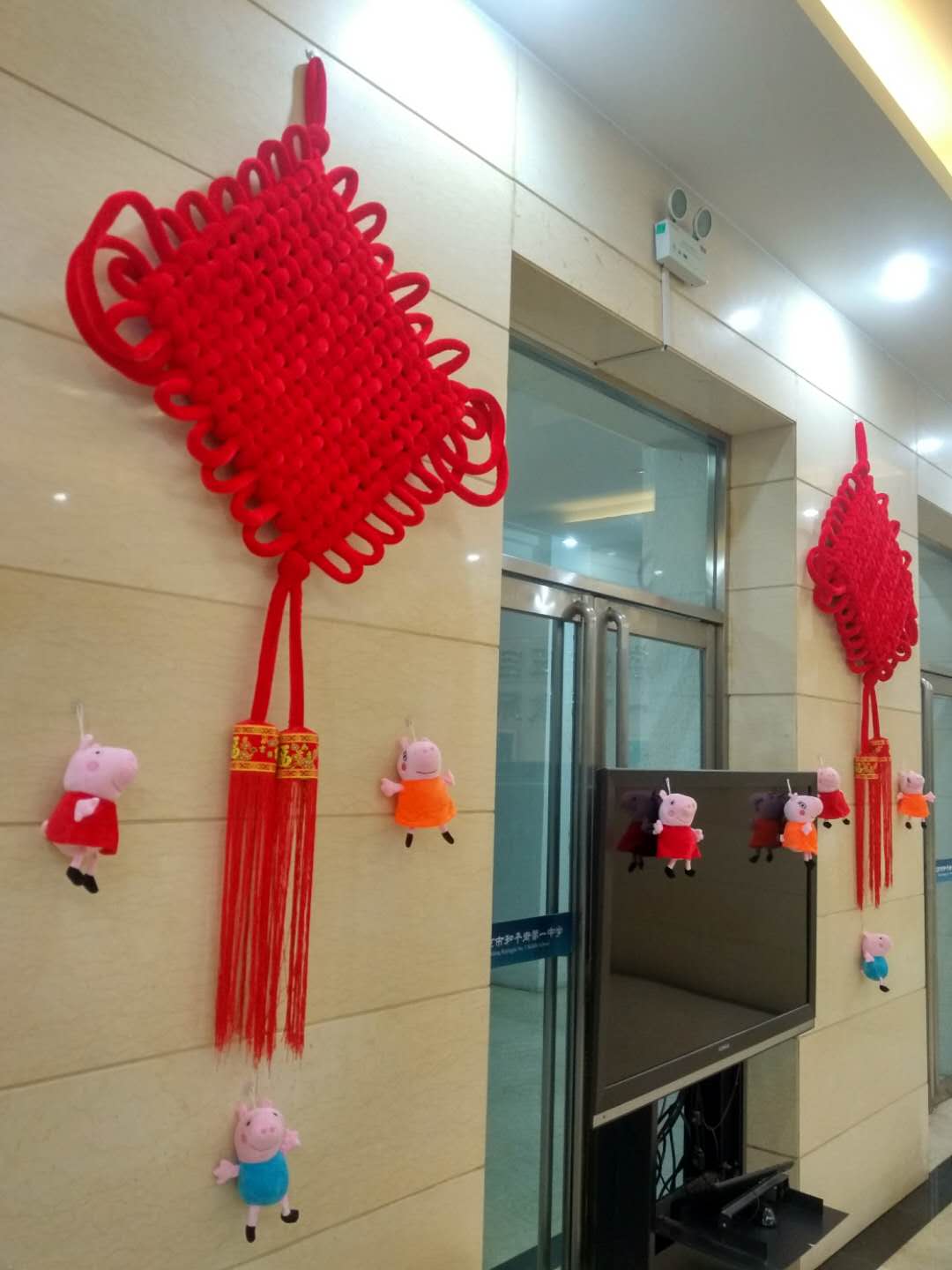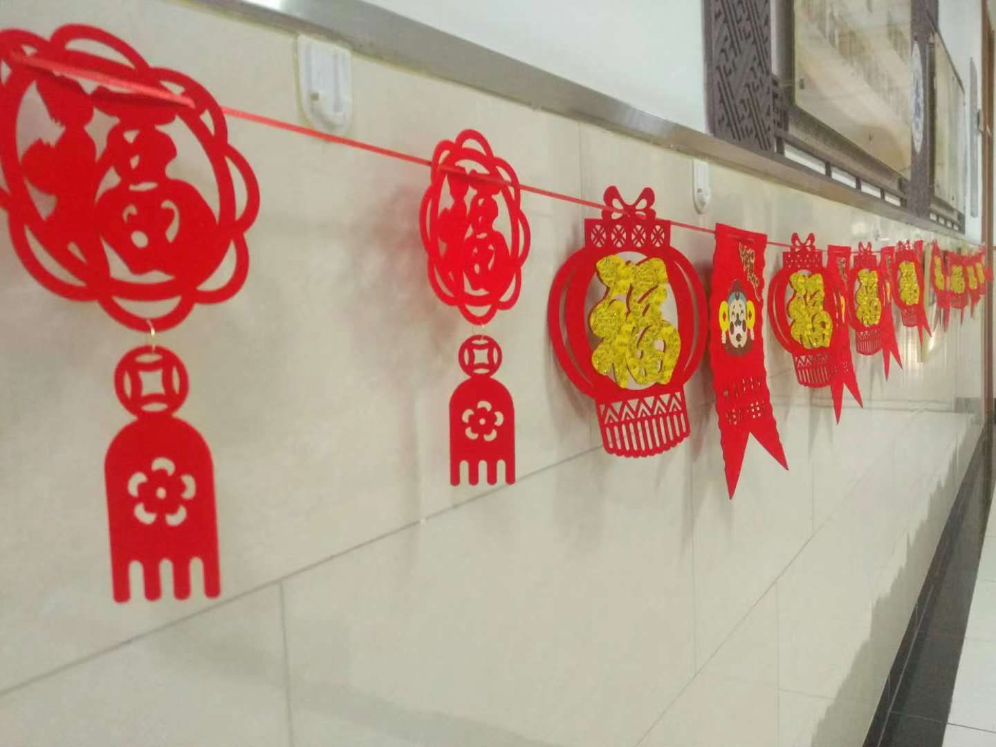 在校园文化长廊和教学楼楼道挂满了融合中国剪纸艺术的拉花,一个个福字和图案不仅体现了镂空艺术,也将节日氛围烘托的更加热烈。门厅里大大的中国结更是象征了团结的和一、奋进的和一。