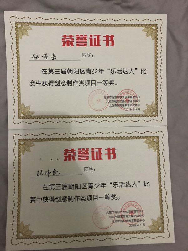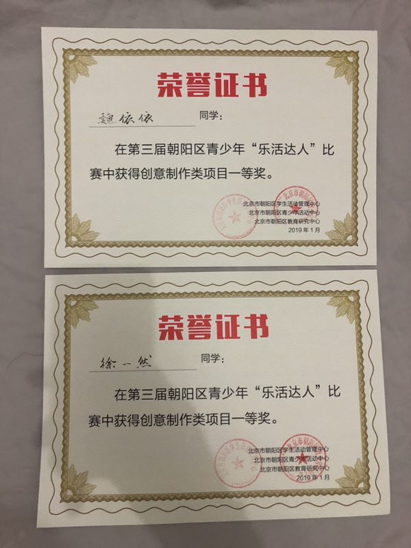 制作是一个艰辛而又漫长的过程。从2018年9月开始设计、制作、上交作品,到后来对作品的不断调整和完善,整个过程历时几个月。期间,小学部科学组李保国、赵秀文、许鑫鑫、王婕、左佑、王焱本六位教师全员参与了整个活动的制作与指导。1月19日,在左佑老师的带领下,同学们参加了复赛。经过激烈角逐和精彩的答辩,小学部王宇凡、魏依依、邓婷月、籍常睿等10名队员分别荣获第三届朝阳区青少年“乐活达人”比赛一等奖。