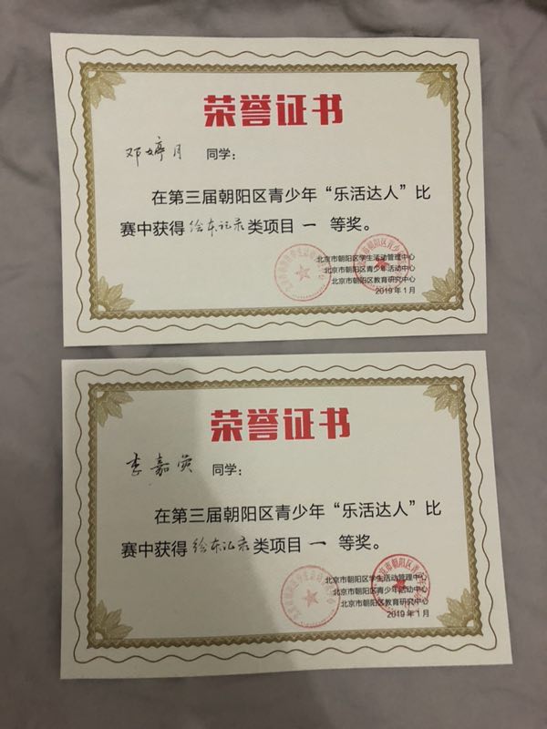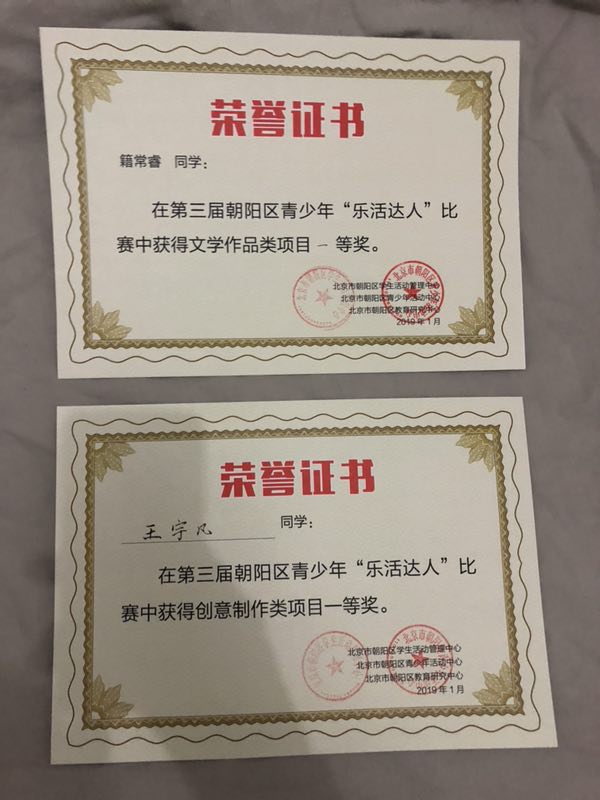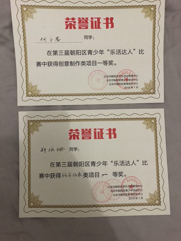 2019年1月19日,第三届朝阳区青少年“乐活达人”复赛暨现场展示与即兴创作活动在朝阳区蟹岛三点钟会议中心举行。来自全区15个中小学校,近200名学生参加了比赛。本次活动共计24个项目进入复赛答辩,我校的“昆虫的口器”、“牛油果生长日记”、“花椒凤蝶的一生”、“春种一号种 秋收航彩樱”、“北京的四季”五个项目进入复赛答辩。