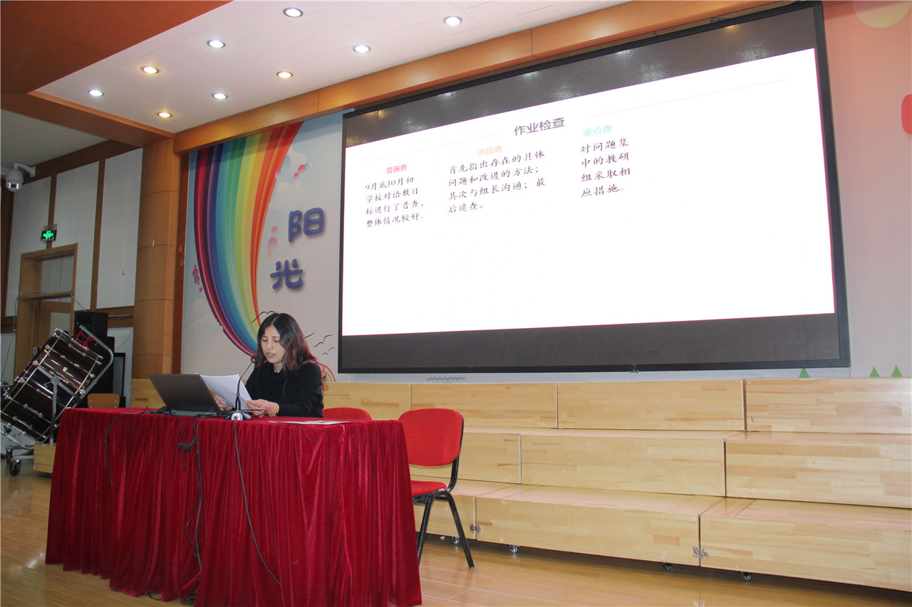 首先,殷桂萍副校长为本学期获奖教师颁奖,祝贺老师们在工作中取得的成绩。随后,老师们共同观看了由信息组精心制作的视频宣传片,回顾一学期工作,大家都有所收获,有所感悟。会上,教学、德育、行政负责人分别对本学期部门工作进行了汇报,他们主要从教育教学、师德规范、成绩与反思、后勤保障、安全与卫生等方面进行了总结。最后,殷桂萍副校长进行了总结性讲话。