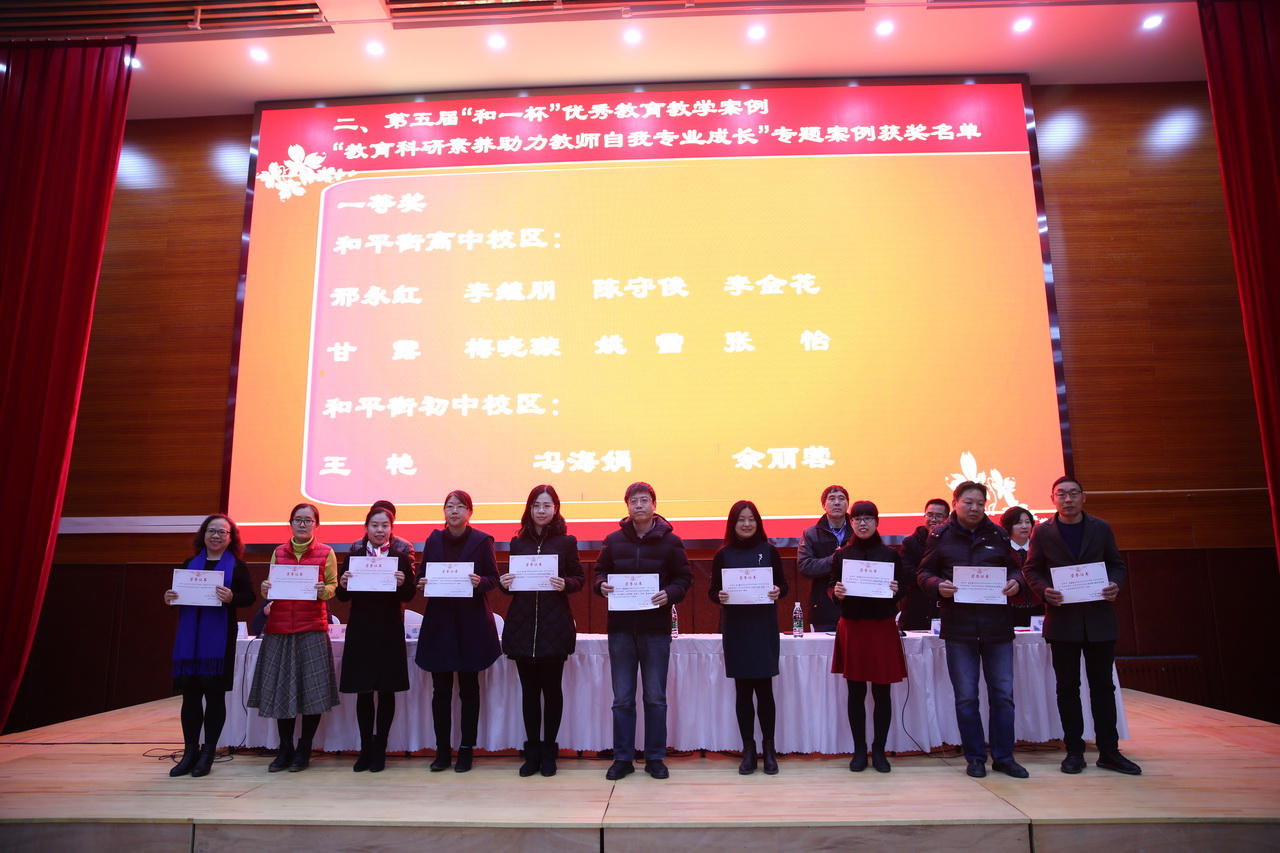 本届教科研节自去年9月份启动以来,历时4个多月,开展了丰富的活动,取得了丰硕的成果。为表彰先进,树立典型,会上首先对在本届教科研节中取得优秀成绩的先进个人和集体进行了表彰。学校领导分别为2018年度教育科研先进个人、第五届“和一杯”优秀教育教学案例——教育科研素养助力教师自我成长专题案例奖、第三届“和一杯”优秀校本课程奖、2018年度研究性学习优秀指导教师奖及2018年度教育科研先进团队(课题组)获奖者颁奖。