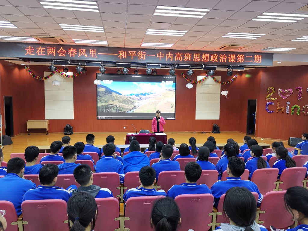 乘着“两会”的春风,结合我校民族团结教育工作特点,2019年3月22日,我校内高班同学进行了以“走在两会春风里”为主题的思想政治课学习,由学生发展处洪娟主任主讲。