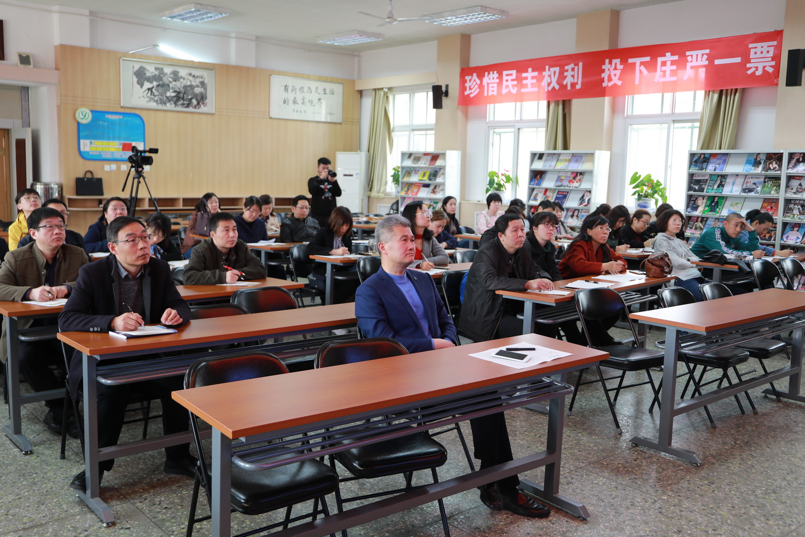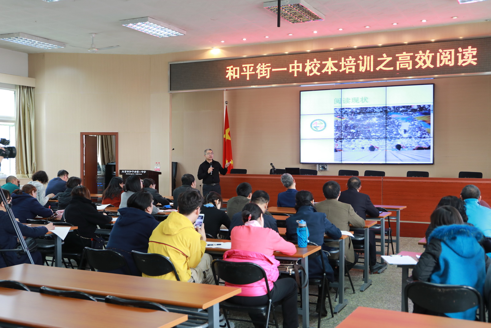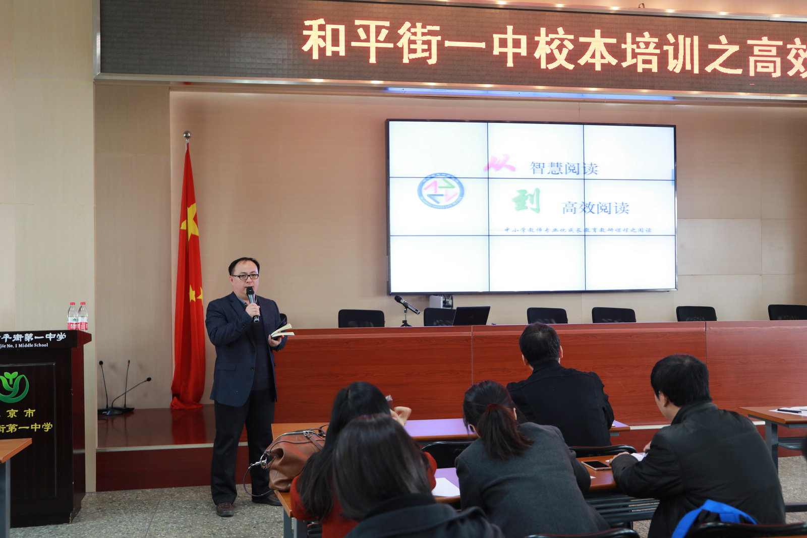 2019年3月26日下午,和平街一中和平街高中校区举行了本学期首次教师校本培训。本次培训响应李克强总理政府工作报告中“倡导全民阅读,推进学习型社会建设”的号召,以“从智慧阅读到高效阅读”为主题,由专家对校区全体教职工进行高效阅读的指导。