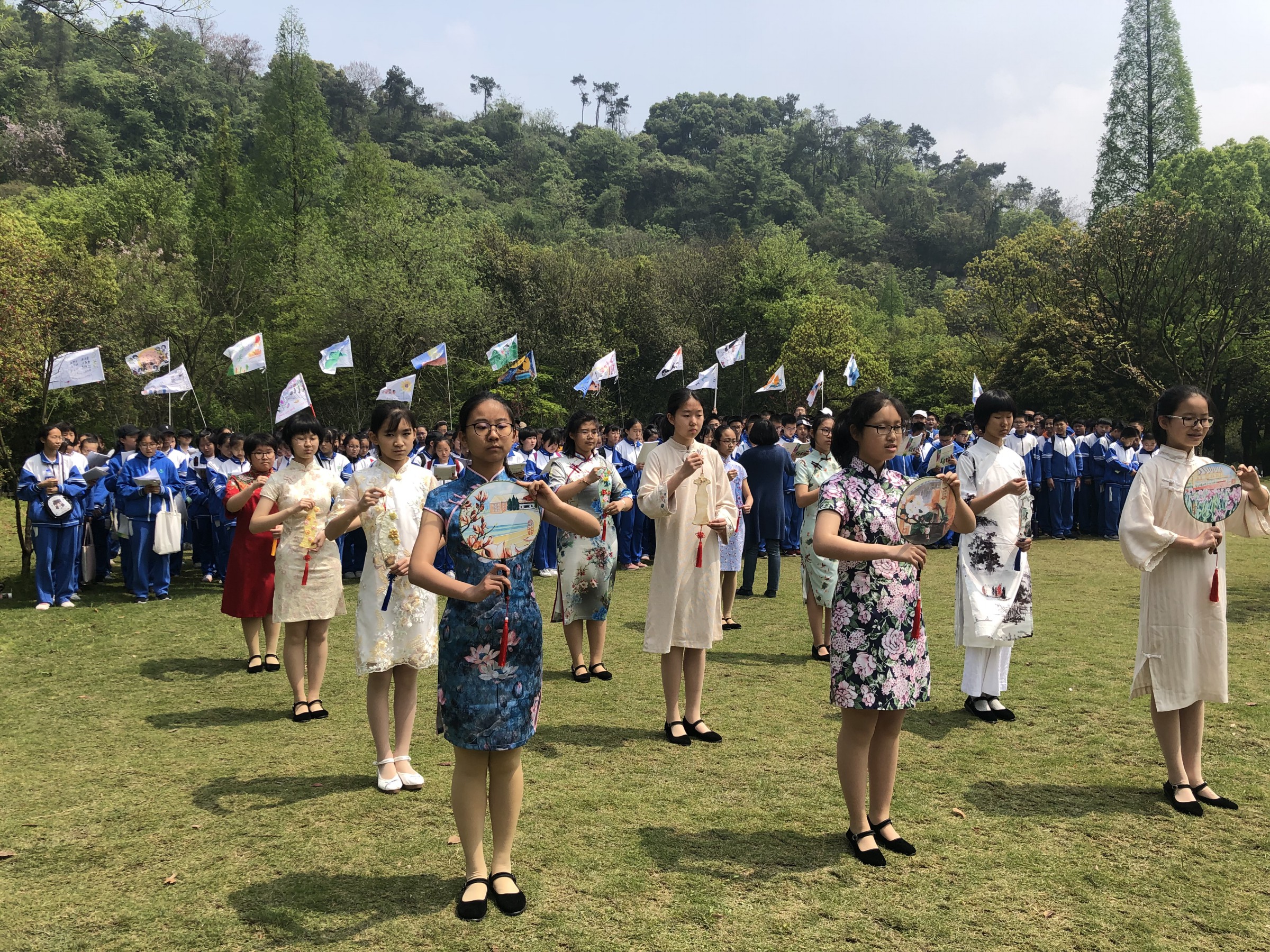 2019年4月12日,北京市和平街第一中学朝来校区师生来到绍兴柯岩景区。同学们通过演唱李叔同的《送别》和《春游》这两首学堂乐歌,以及手工制作了同时期旗袍的小样儿,充分感受了民国时期的校园文化。