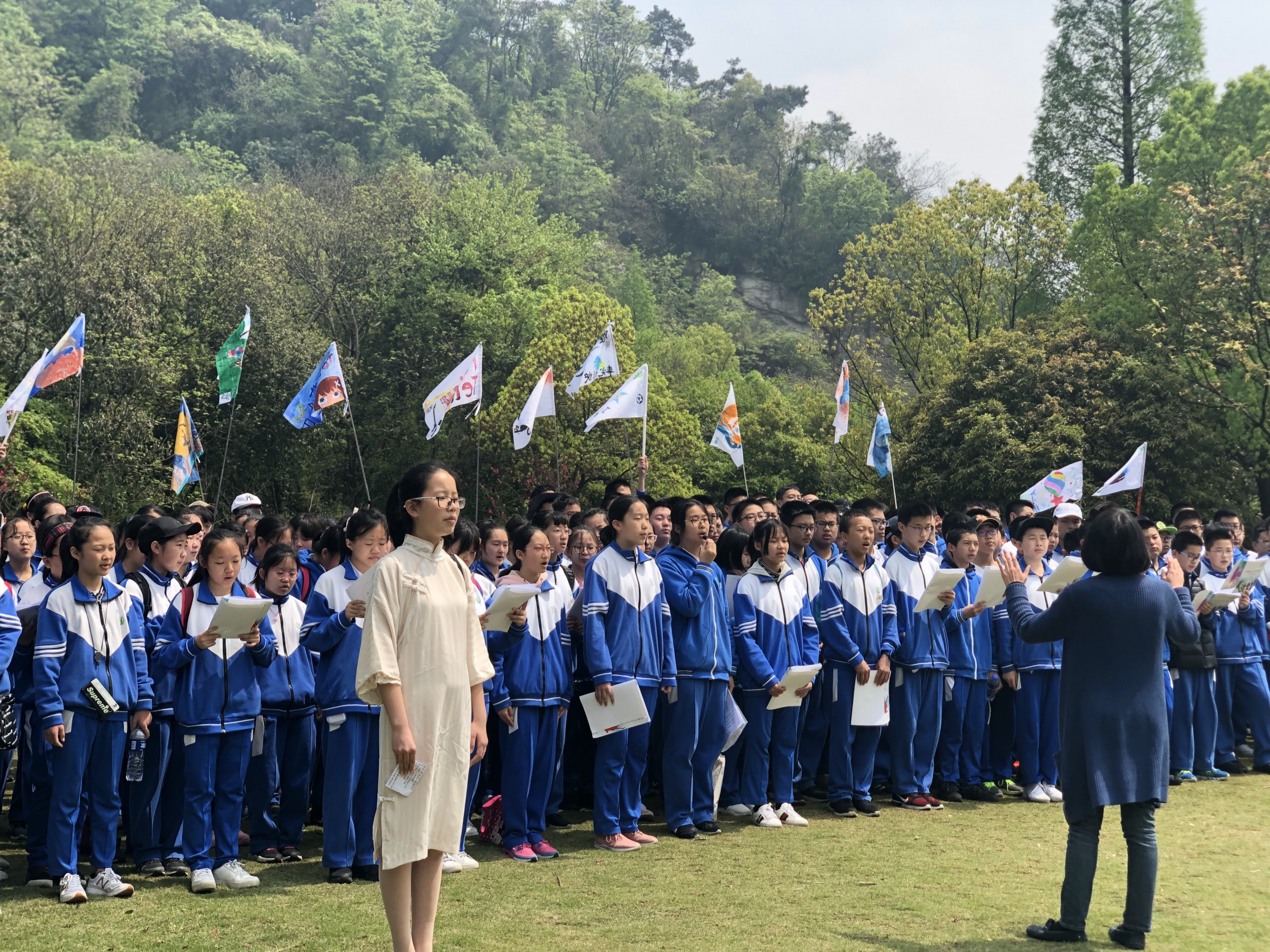 活动当天,在音乐王老师的指挥下,全体初一同学合唱了《送别》和《春游》这两首歌曲。同学们在合唱中,体会了七言律诗的雅淡脱俗,音乐的自然之味。