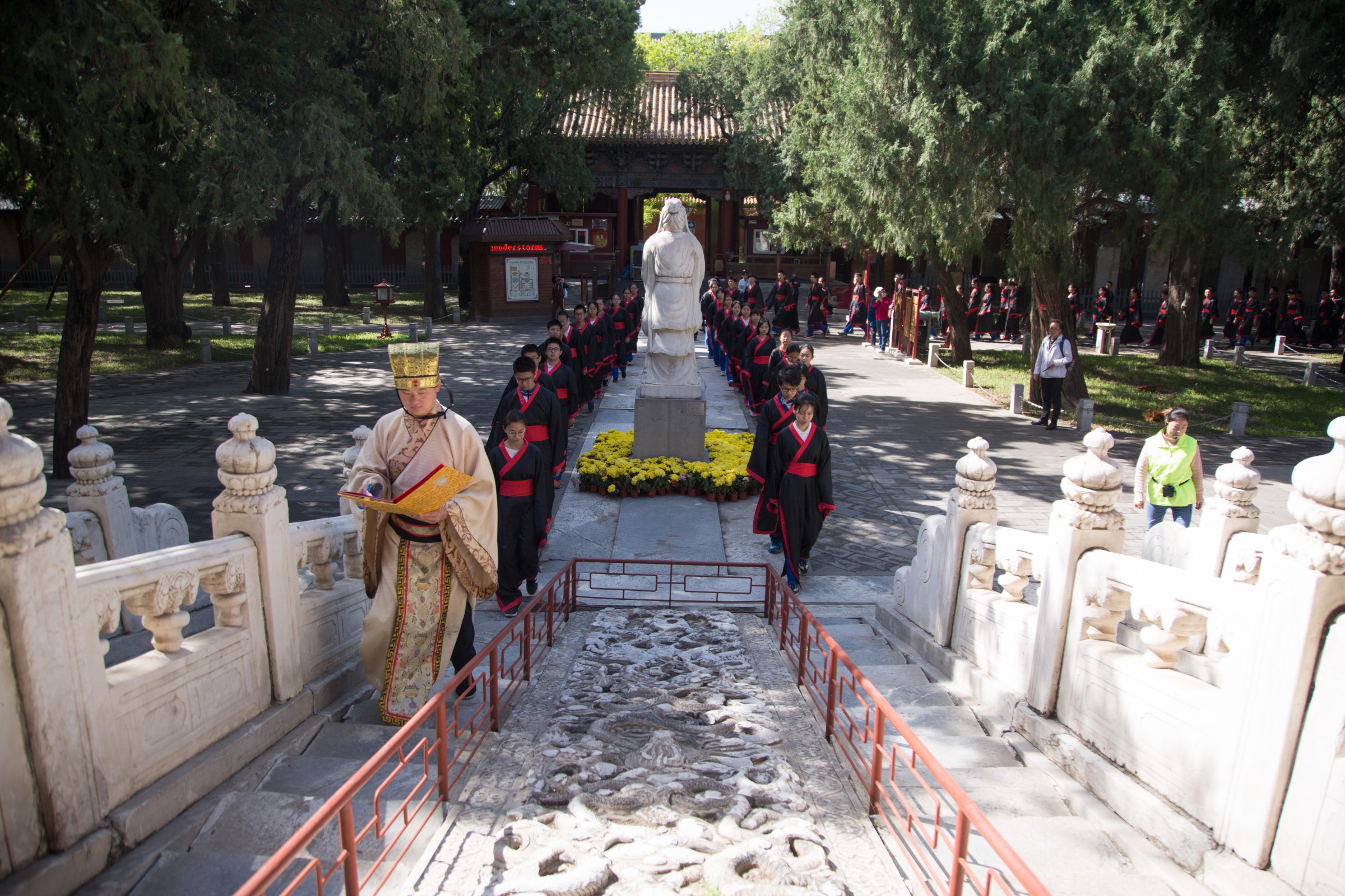 转过孔子的雕像,跨过大成门,我们来到了大成殿前。第一件事便是举行释菜礼,释菜礼便是表达我们对先师的敬意的仪式。伴随着庄重的音乐声,四名释官托起祭礼——代表着勤于学的芹菜、早立志的大枣和栗子还有多才华的韭菜,款款走向大成殿,将祭礼放在了大成殿前的蒲团上。接下来同学们在司仪的指导下行了四拜礼,“拂手——高揖——拜——兴——”以示对至圣先师孔子的敬仰,亦是表达学子对老师们的尊重。