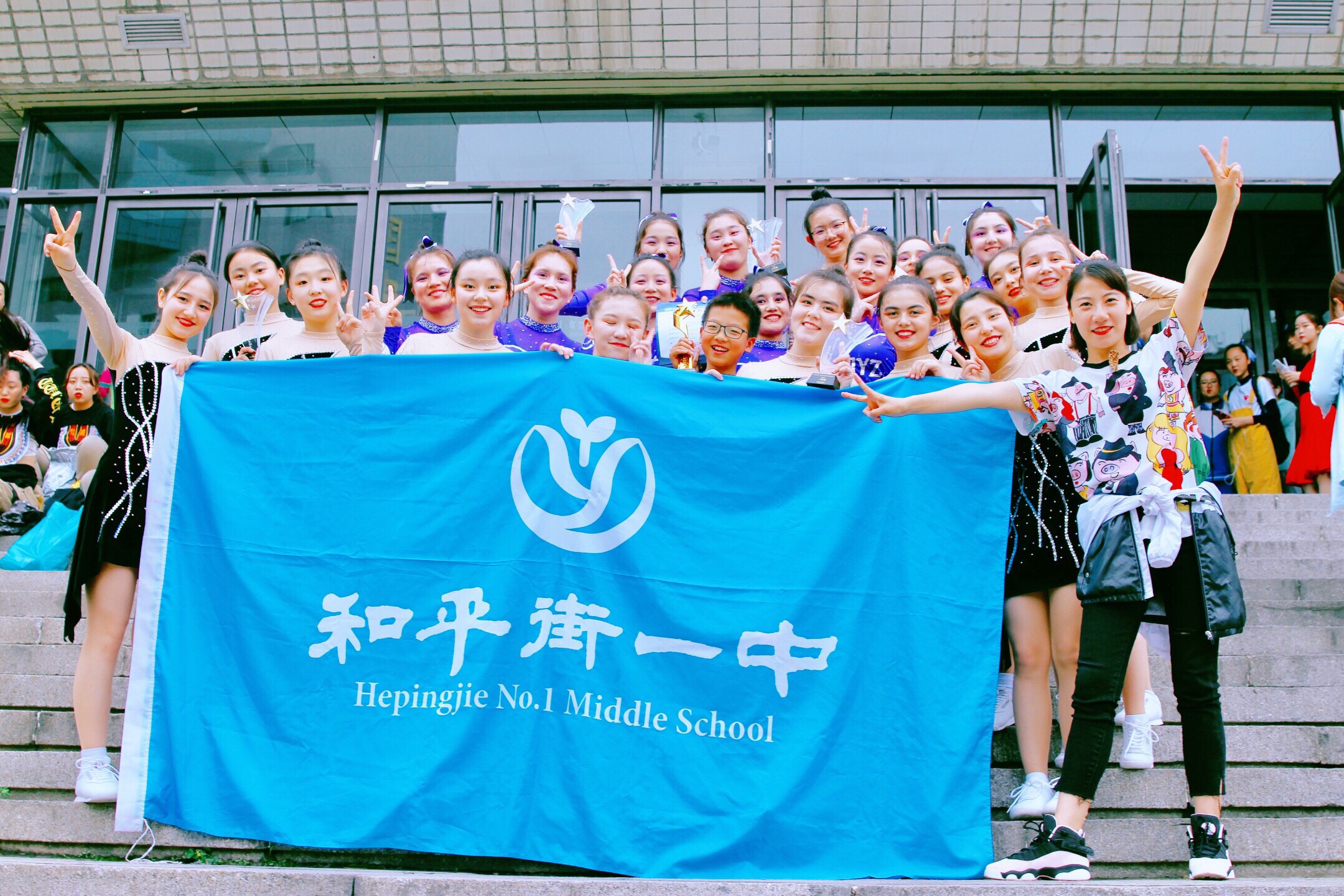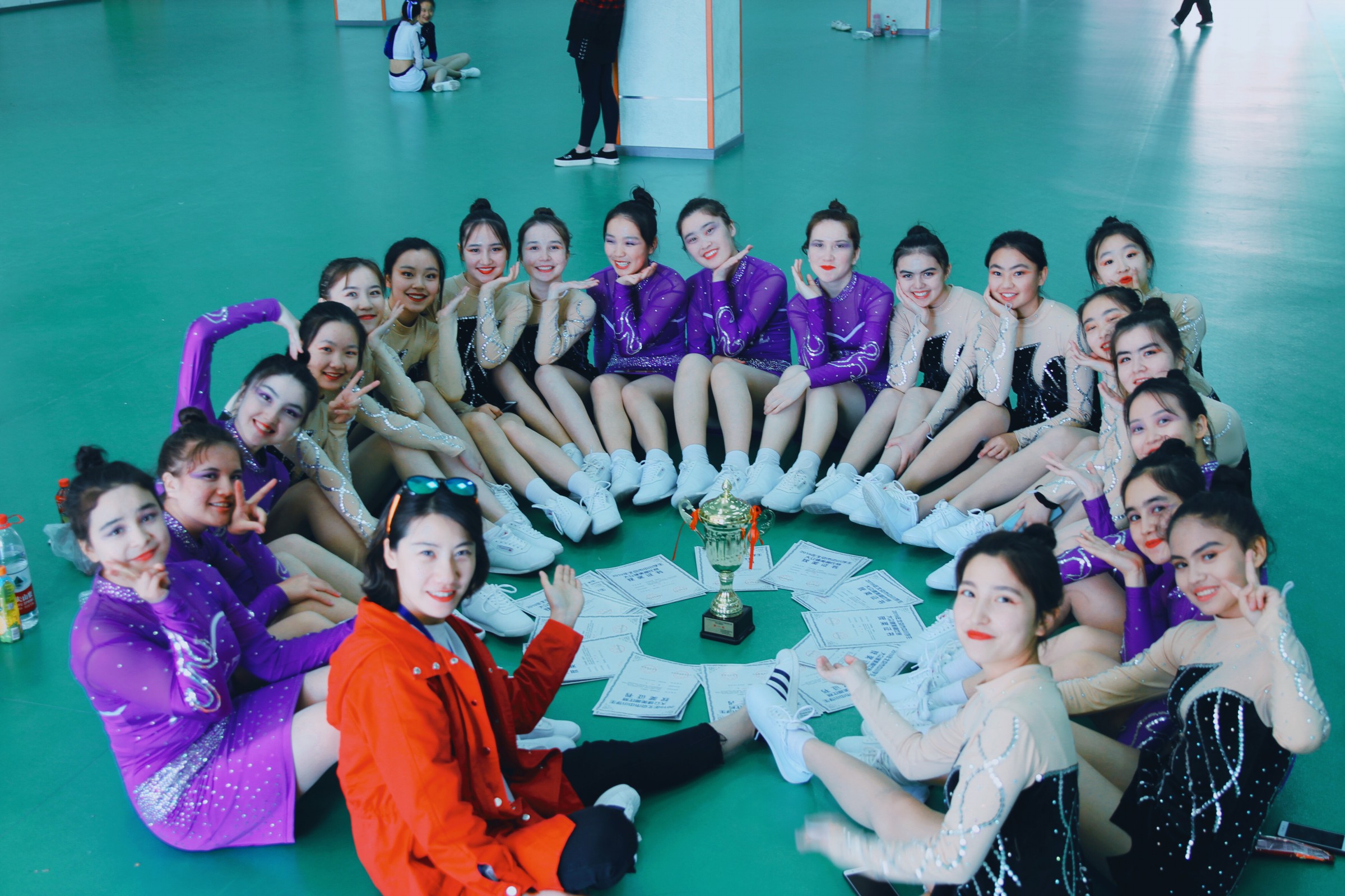 学生们利用课余时间训练,得到了学校领导和老师们鼎力相助,为了不耽误孩子们学习,年级组长,班主任及各科老师也会时常关注她们的学习,在有限的时间,紧张训练中孩子们懂得团结一致的重要性,收获了友情、磨炼了坚毅的品质,为学校再次争得了荣誉!幸运的是,为高中组团体第一名颁奖的嘉宾是曾在我校毕业、现健美操届泰斗孟宪军老师,更加荣幸的是赛后我校健美操队员与孟老师和中小学健美操比赛总裁判长合影留念,他们为我们取得如此好的成绩表示祝贺。两天的比赛孩子们收获满满,并且激动的说回去一定好好学习,努力训练争取能够参加明年的比赛!