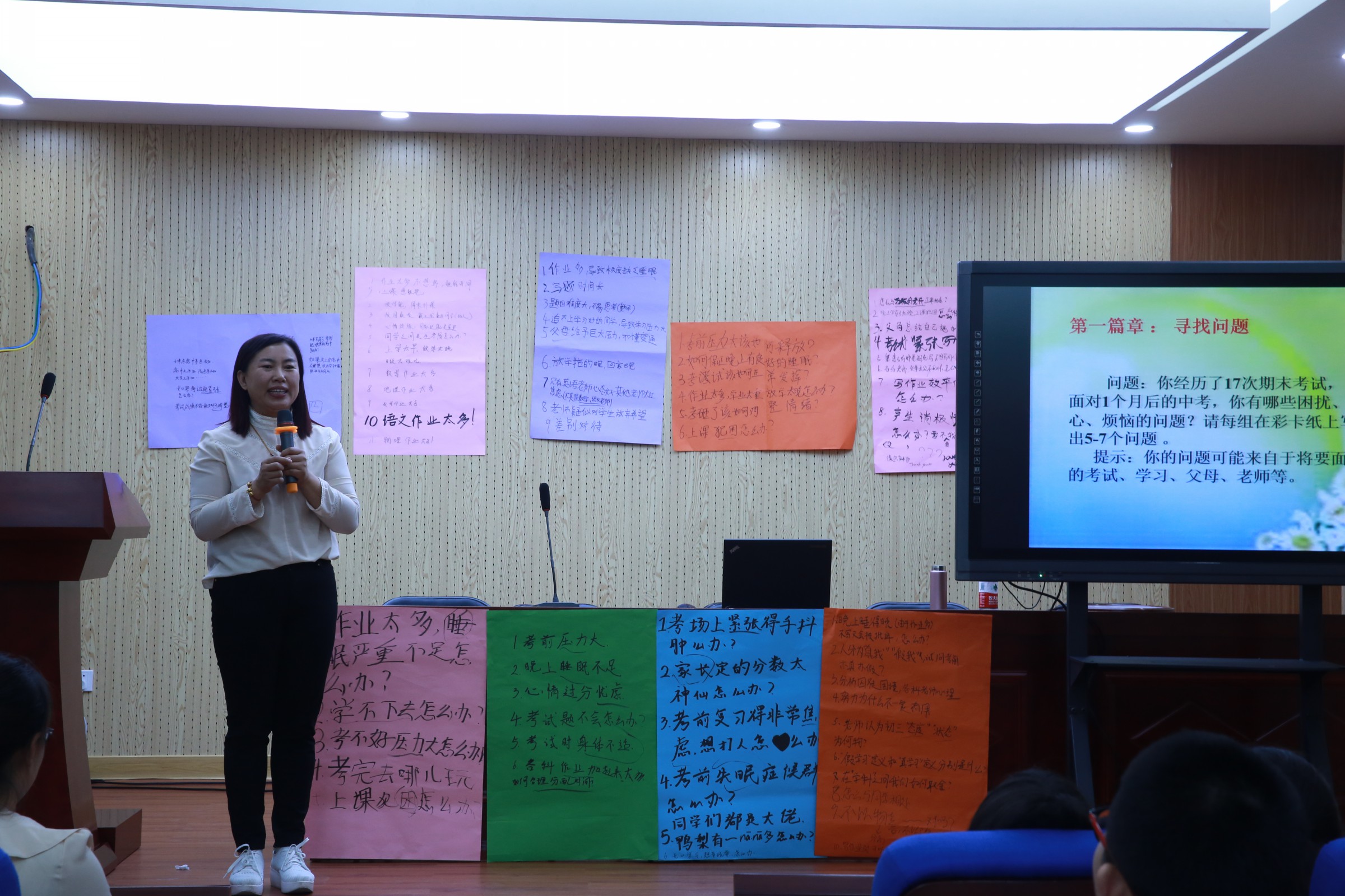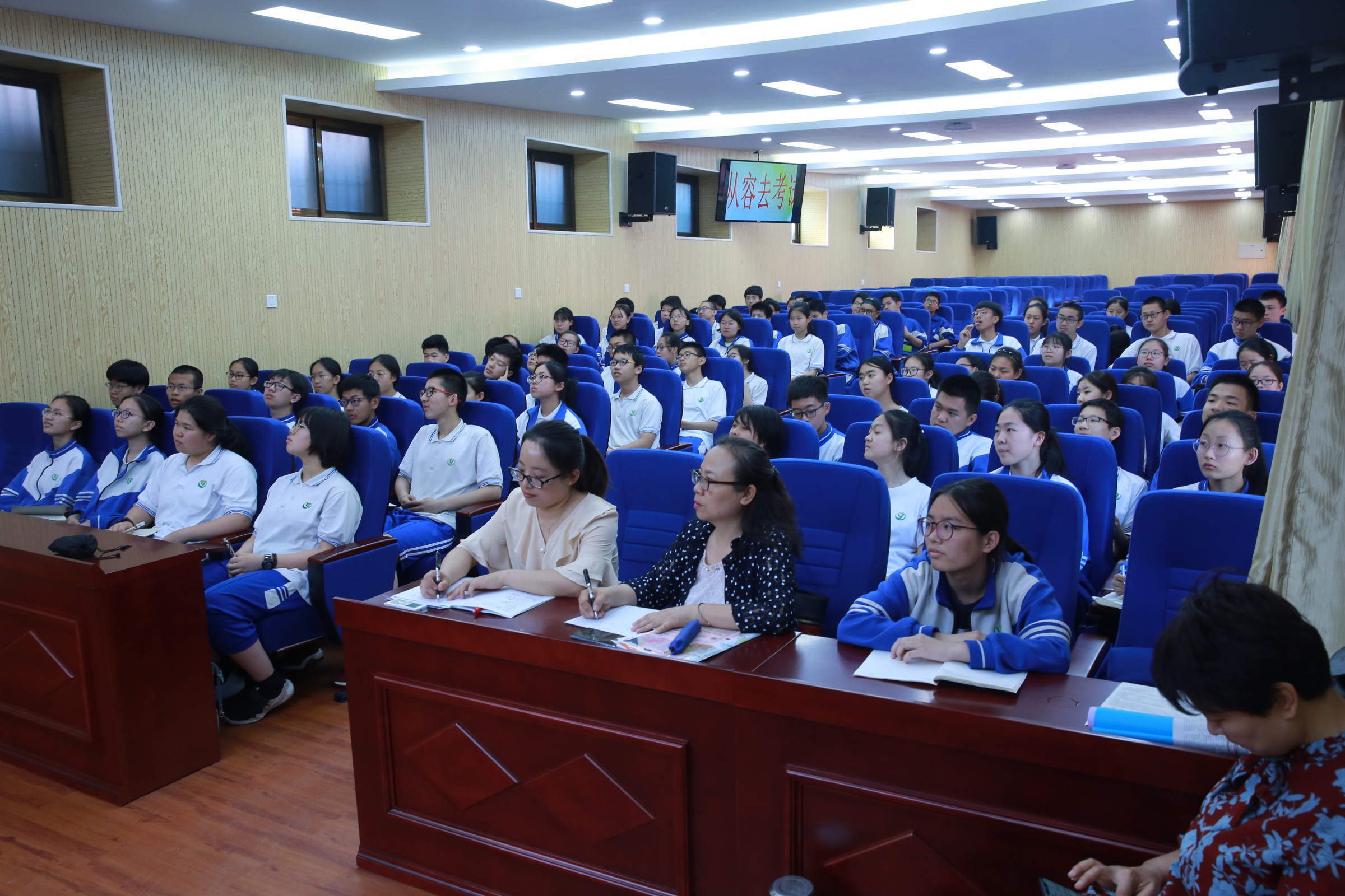 5月22日下午,和平街一中和平街初中校区初三年级开展心理讲座活动。本次我们有幸请到的专家是密云教研员武金红老师,武老师给初三年级同学带来主题为“从容淡定去考试”的讲座,学生发展处张主任、教务处黄主任、年级组长余老师,心理梁老师以及初三全体学生和部分家长参加本次活动。
