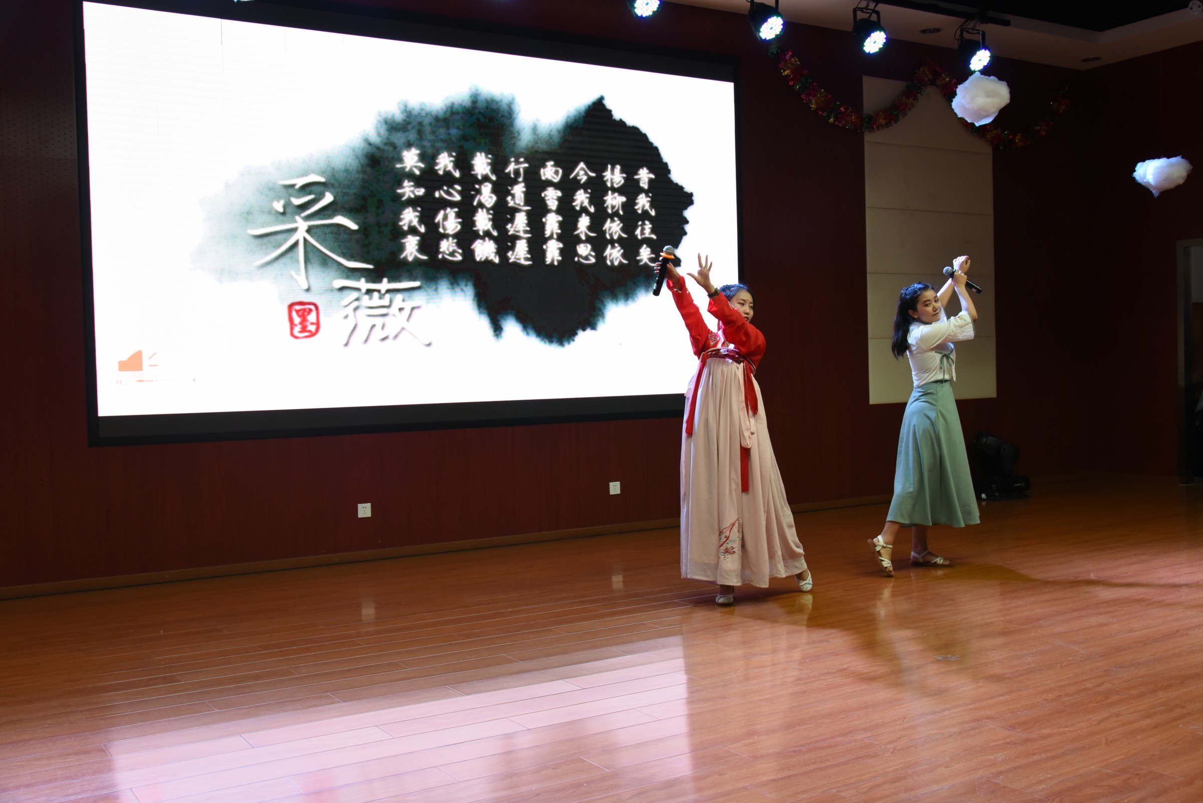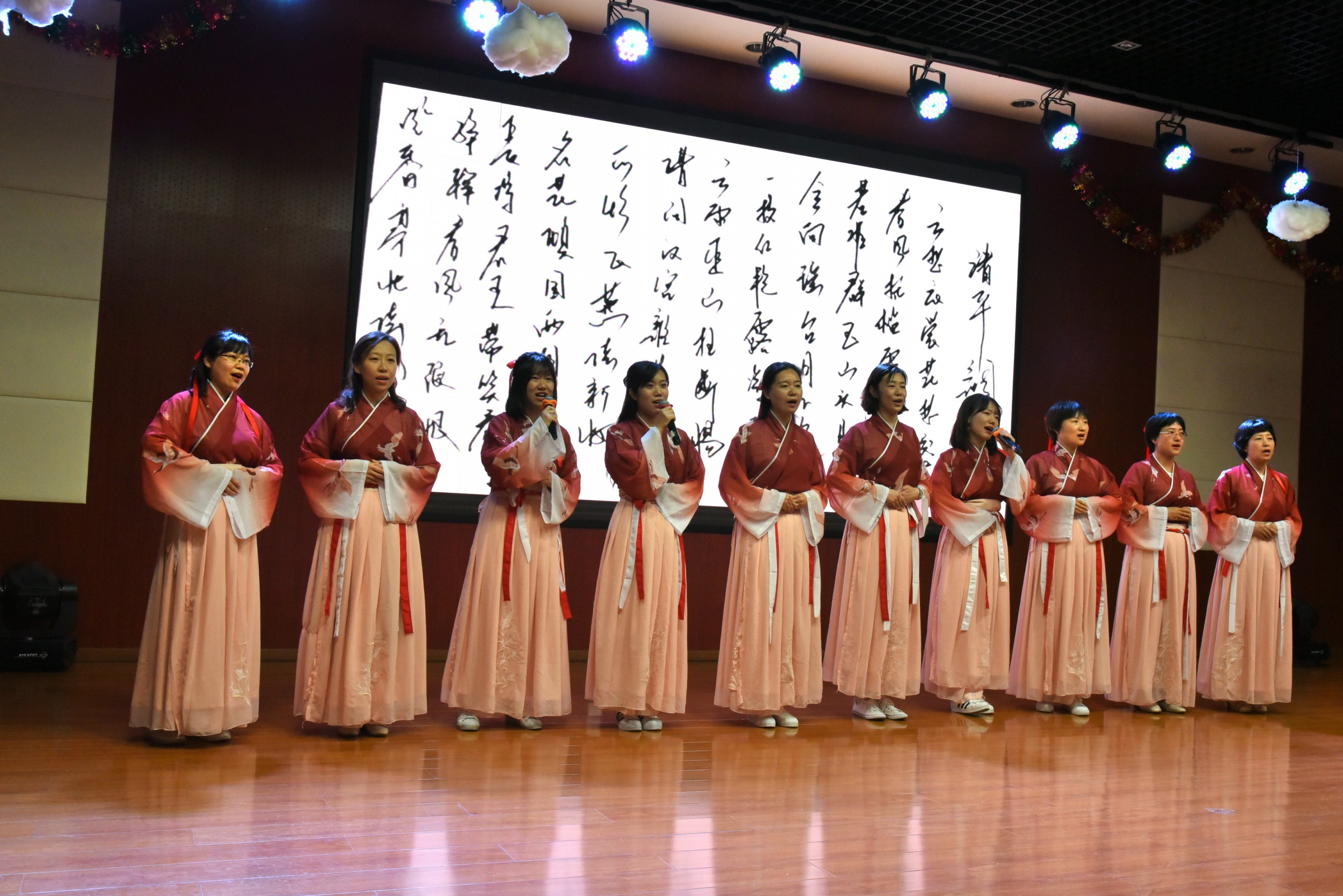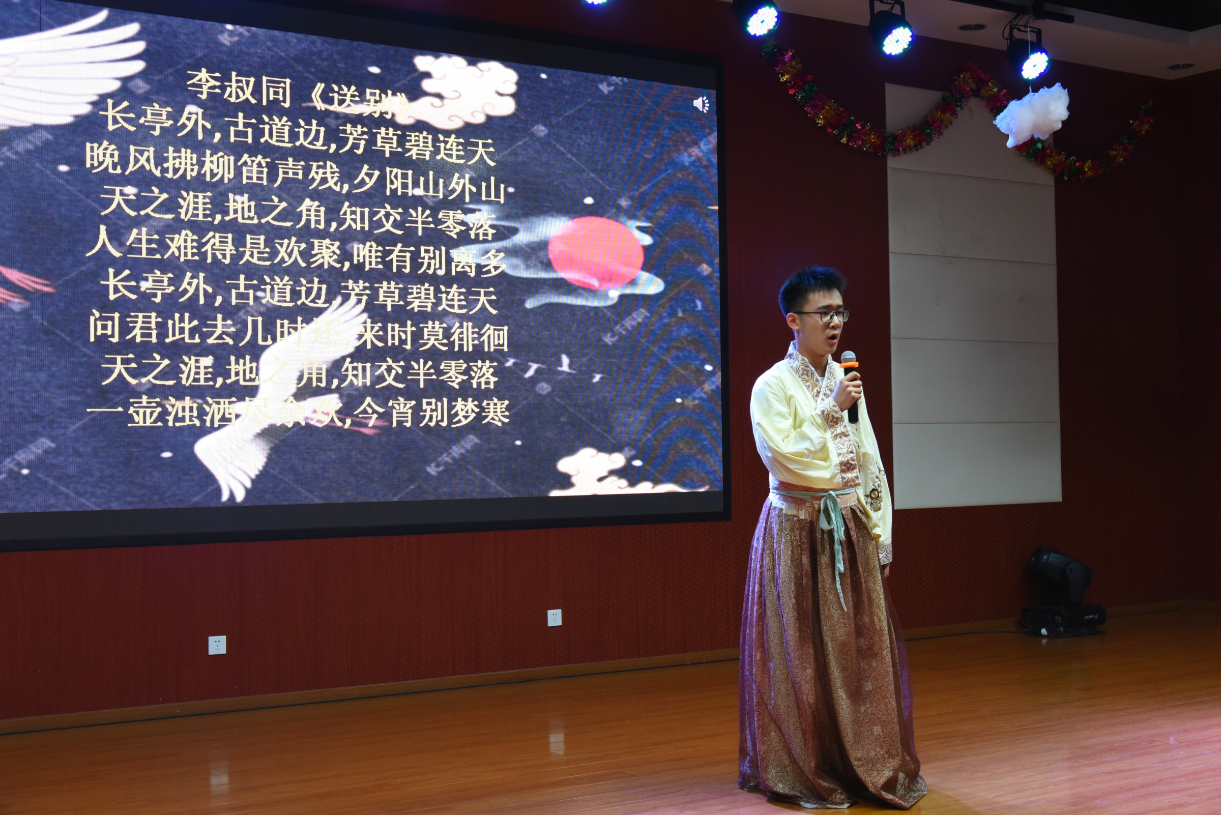 比赛接近尾声,全体语文老师集体吟唱《清平调》,将活动推向高潮。“云想衣裳花想容,春风拂槛露华浓”裳花亦在伤人。正如本次比赛,听歌亦在传承经典。