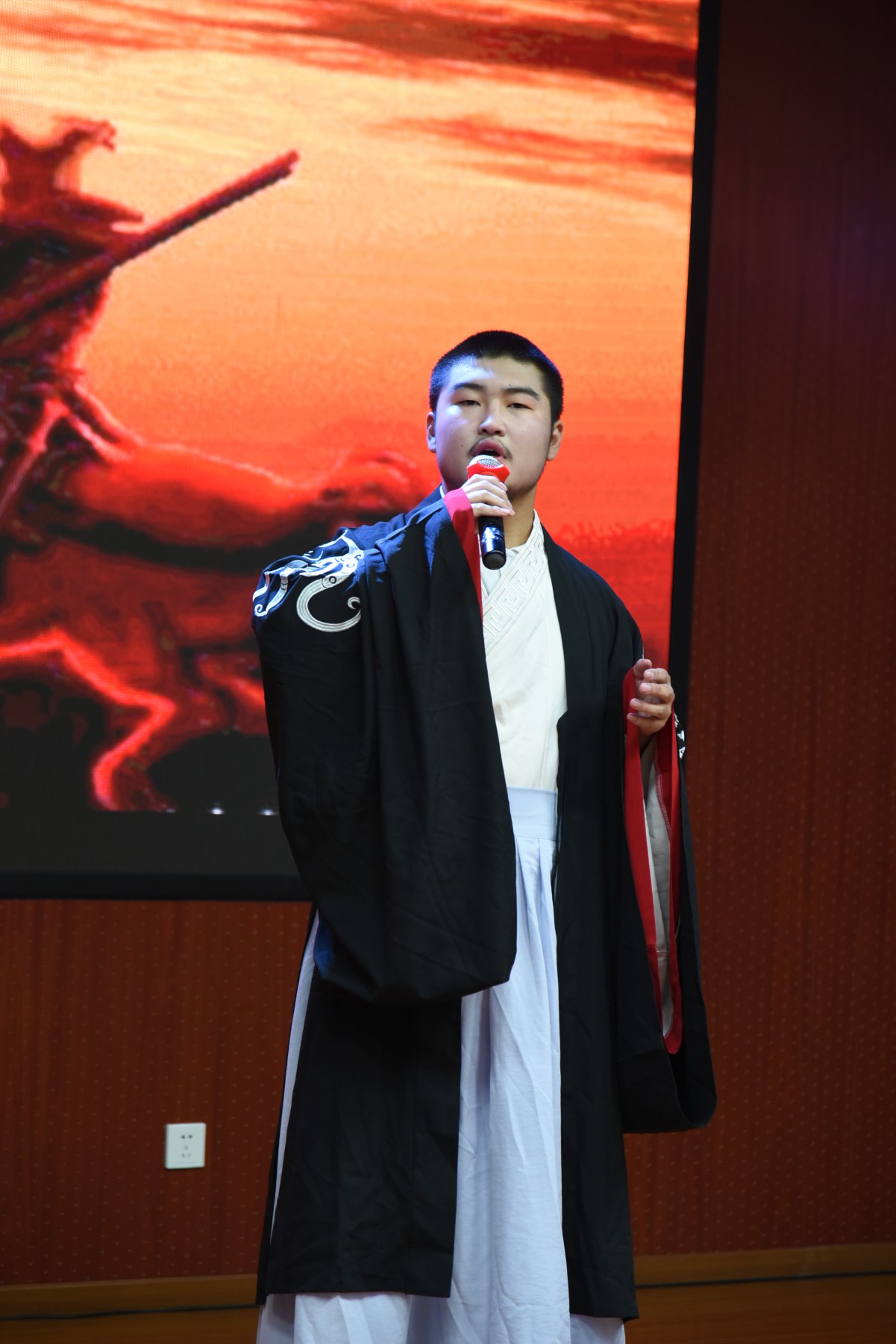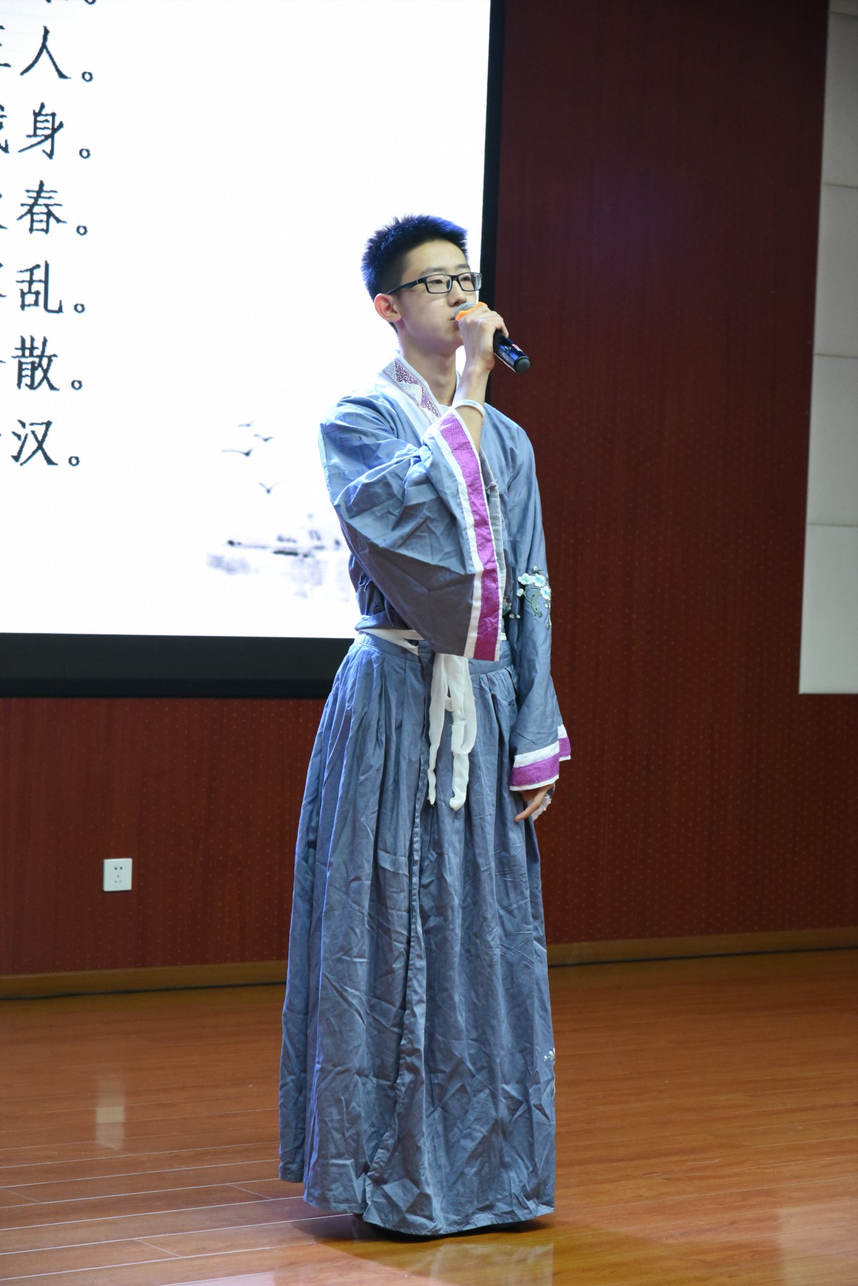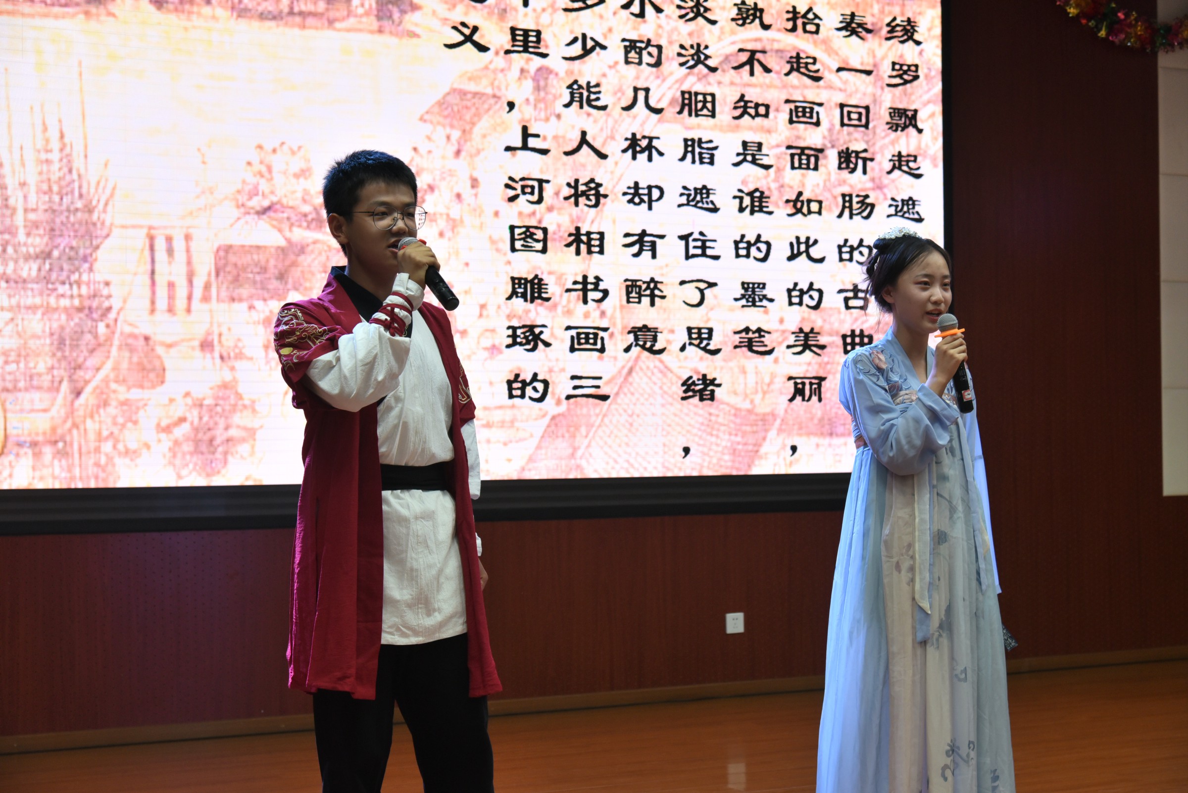 比赛中,选手身着汉服在闪光灯的照射下,吟咏着经典诗词,他们在吟唱之余还伴有舞蹈表演,古筝,吉他伴奏等艺术形式。比赛以班级为单位,每班派出最优秀的选手参加比赛,赛前通过抽签的形式决定出场顺序,十四个节目各有特色,不分伯仲,会场一次又一次雷鸣般的掌声说明一切。其中高二刘博涵,毕芷菡两位同学带来的“秋风词”更是让观众感受到了文辞中的相思之苦;毕芷菡谢幕时犹挂的两行清泪勾起了每一个人的相思之情。两个小时的赛程,师生始终沉浸在古典诗词的魅力之中。
