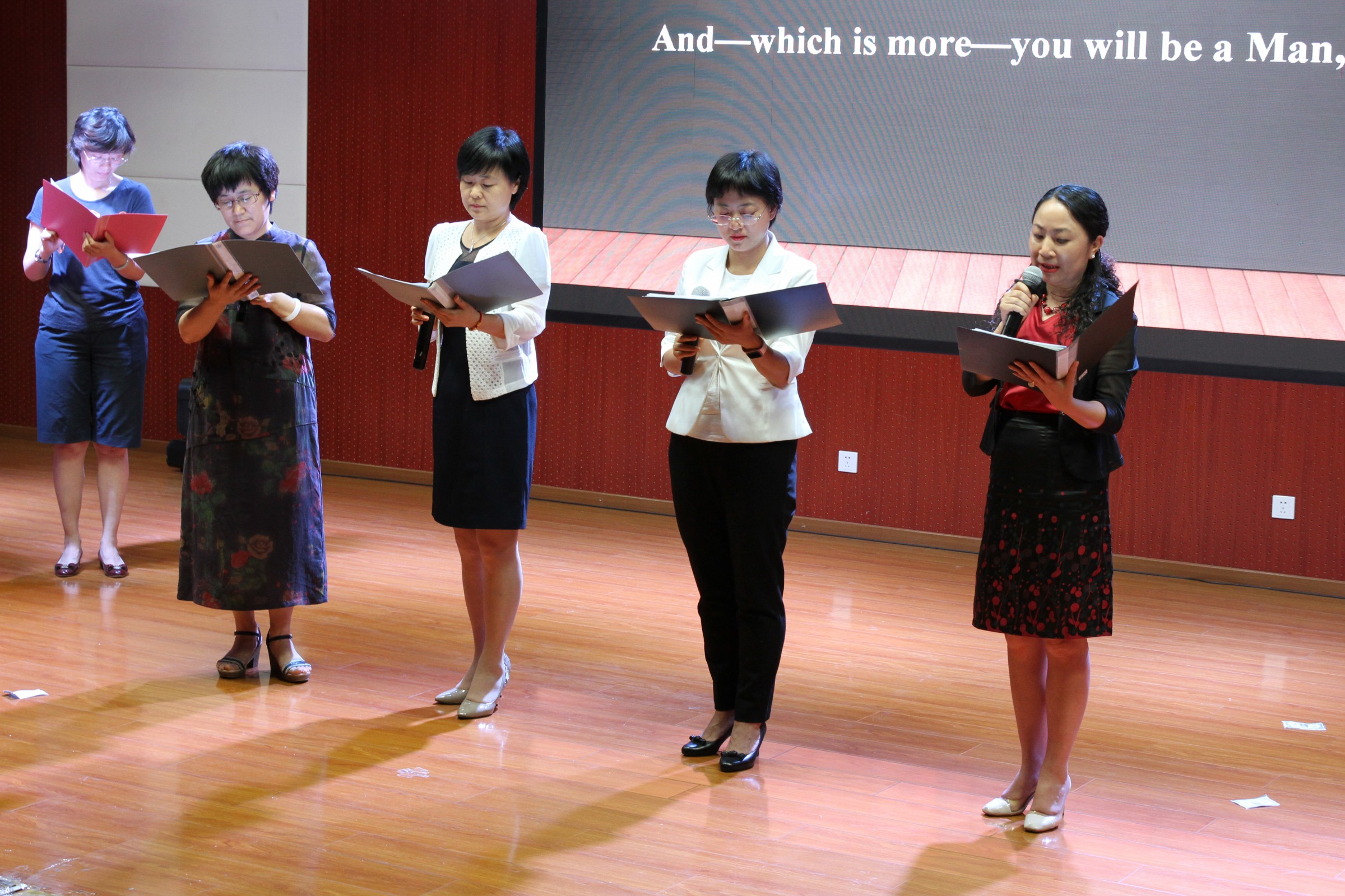 嘉年华的压轴节目是英语教研组全体教师为大家带来的经典诗朗诵《If》。这首诗是写给儿子的一首励志诗,用来勉励他要勇于接受挑战,战胜困难。我们的特别嘉宾周建萍副校长、王冬梅主任、高二年级组长王美月老师、和语文老师程瑞芬老师为我们倾情演绎汉语翻译版本《如果》,深深震撼了大家的心灵。外教Dorm也上台用幽默风趣的言语告诉大家英语学习很有趣,全场都忍俊不禁。一日为师,终身为父,老师们用中英文诗朗诵的方式,为同学们讲述人生之道,受益匪浅。