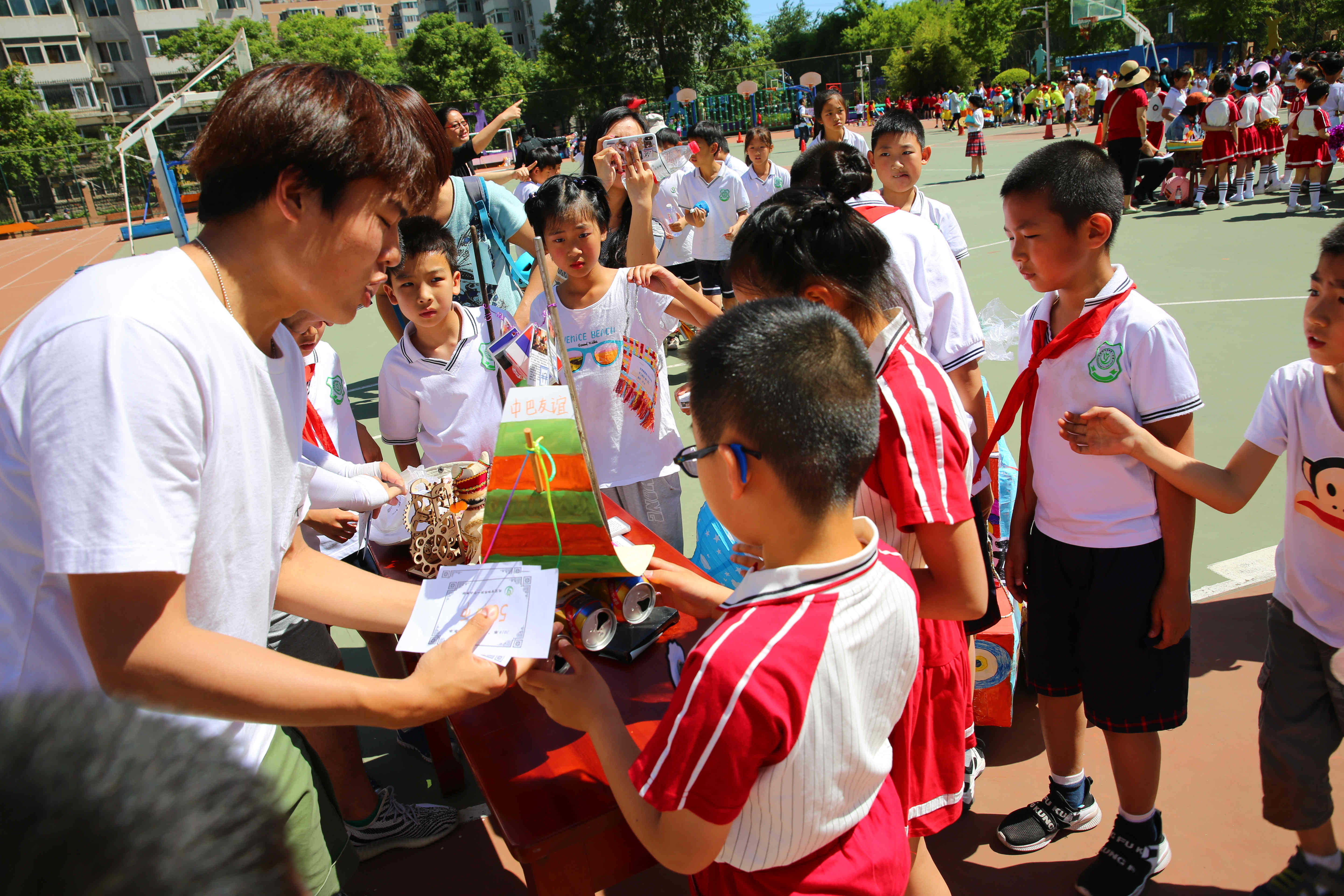 走近一看,原来是和平街一中清友园校区的二、三年级的孩子们,在六一儿童节前夕为大家献上了一场由“一带一路”引发的多学科融合“创·精彩无限——驾着小车游世界”的贸易文化节嘉年华盛宴,这个为期一个月的设计创想、初步探路、实际操作,终于在今天成功展示。