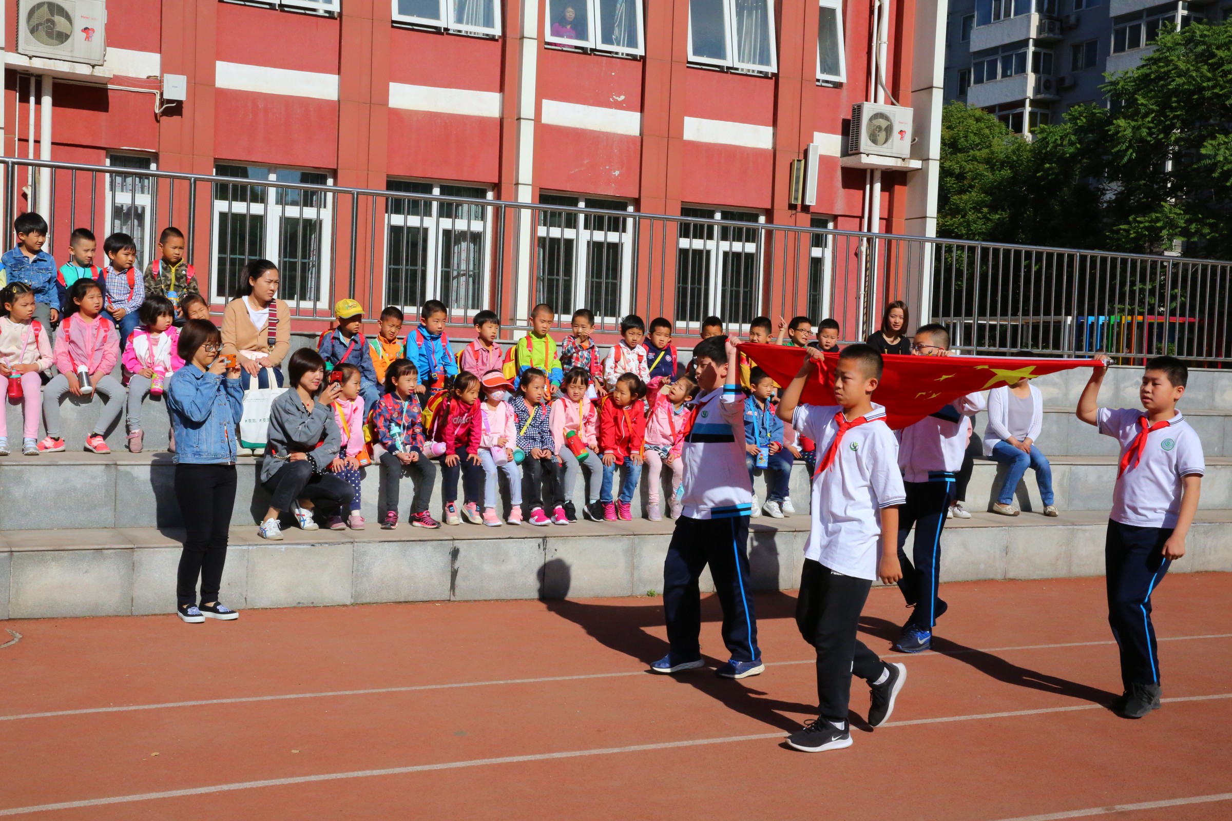 校园里绿意正浓,朵朵花儿散发着清香,……一切都在吸引着孩子的注意力。只见他们,手牵手,排着整齐的队伍,在老师的带领下来到操场上和我校学生一起参加了隆重而庄严的升旗仪式。哥哥姐姐们整齐的入场,笔直的队列,嘹亮的国歌,自信的旗手介绍……这一切都为他们树立了榜样。