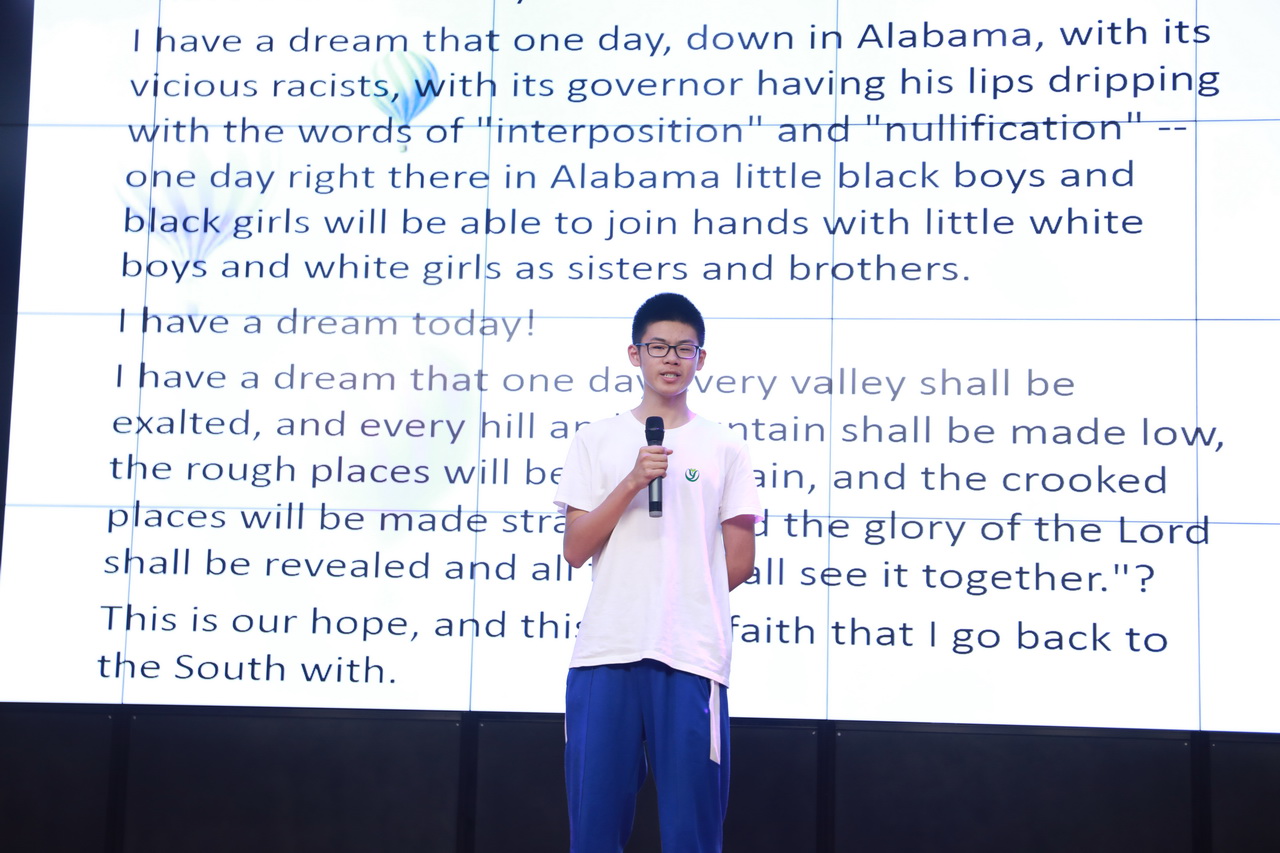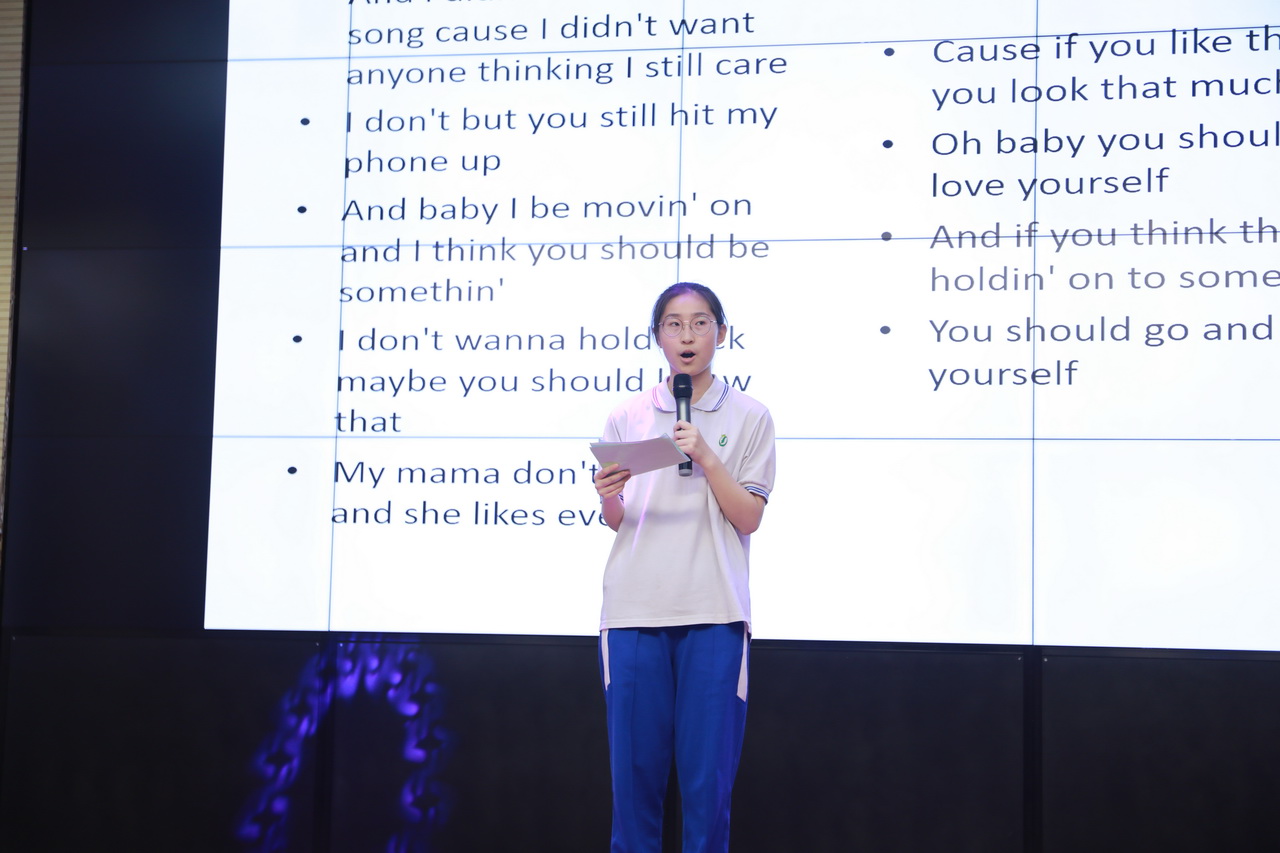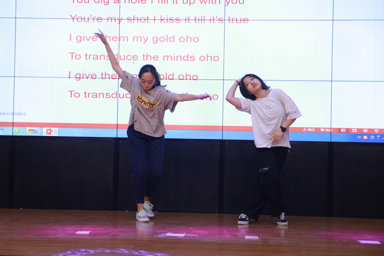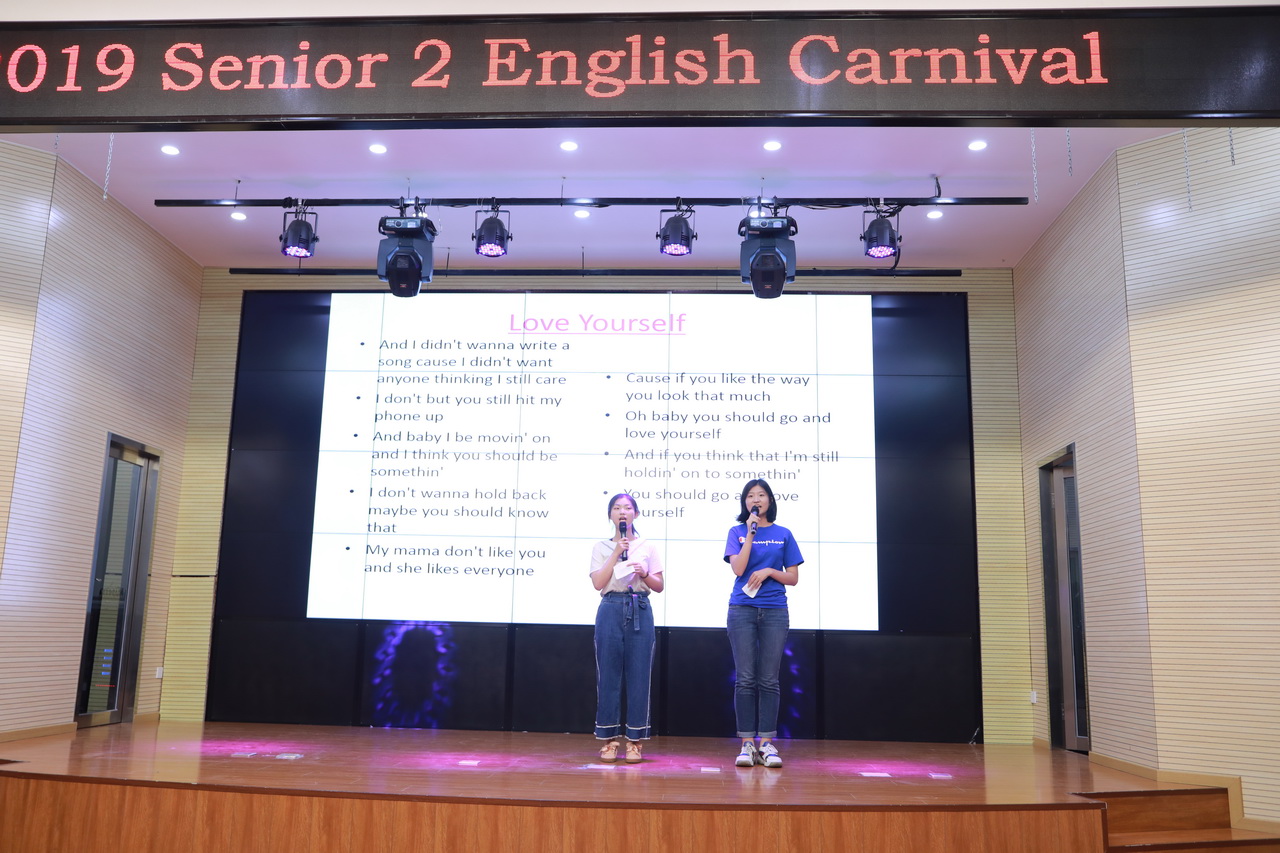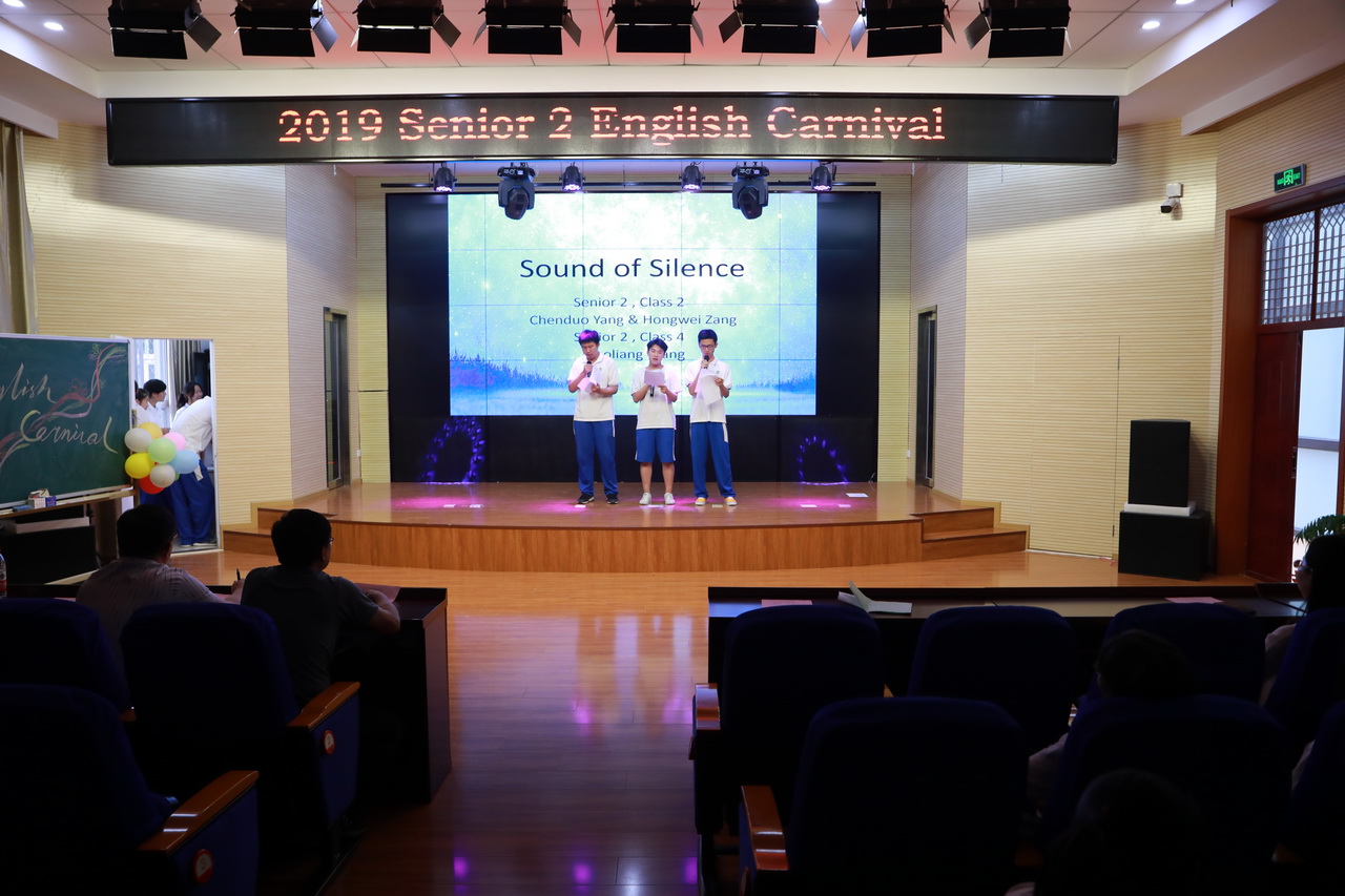 活动中,同学们激情演绎着不同的精彩节目。高二(4)班赵嘉昕同学演唱的经典老歌《My love》优美动听;高二2班臧英哲同学慷慨激昂的演讲《I have a dream》,给现场师生带来深深的触动;张艺凝和杨静同学用中学生特有的清纯音色讲述着《Love Yourself》这样一个发人深省的故事;周祚同学用配音的方式,将电影《Dark knight》中小丑本身的放荡不羁,纯粹又疯狂的心理表达的淋漓尽致;《Hush little baby》这首充满天真、童趣的歌谣被高二1班的男生们演唱的动情而又温馨;同学们演唱的《I'll be there for you》《The sound of silence》等悦耳的旋律令观众们仿如身临其境;高二6班范子琪同学朗诵的《致橡树》传达着一种平等、独立而又深情的高尚爱情观;最后,高二5班同学们精彩演绎的戏剧《Cinderella》把整个会场气氛推向了高潮。同学们尽情展示着自己的才华,老师们也褪去了往日课堂上的严肃,多了份活泼,尽情融入到狂欢中。现场笑声不断,掌声如潮。