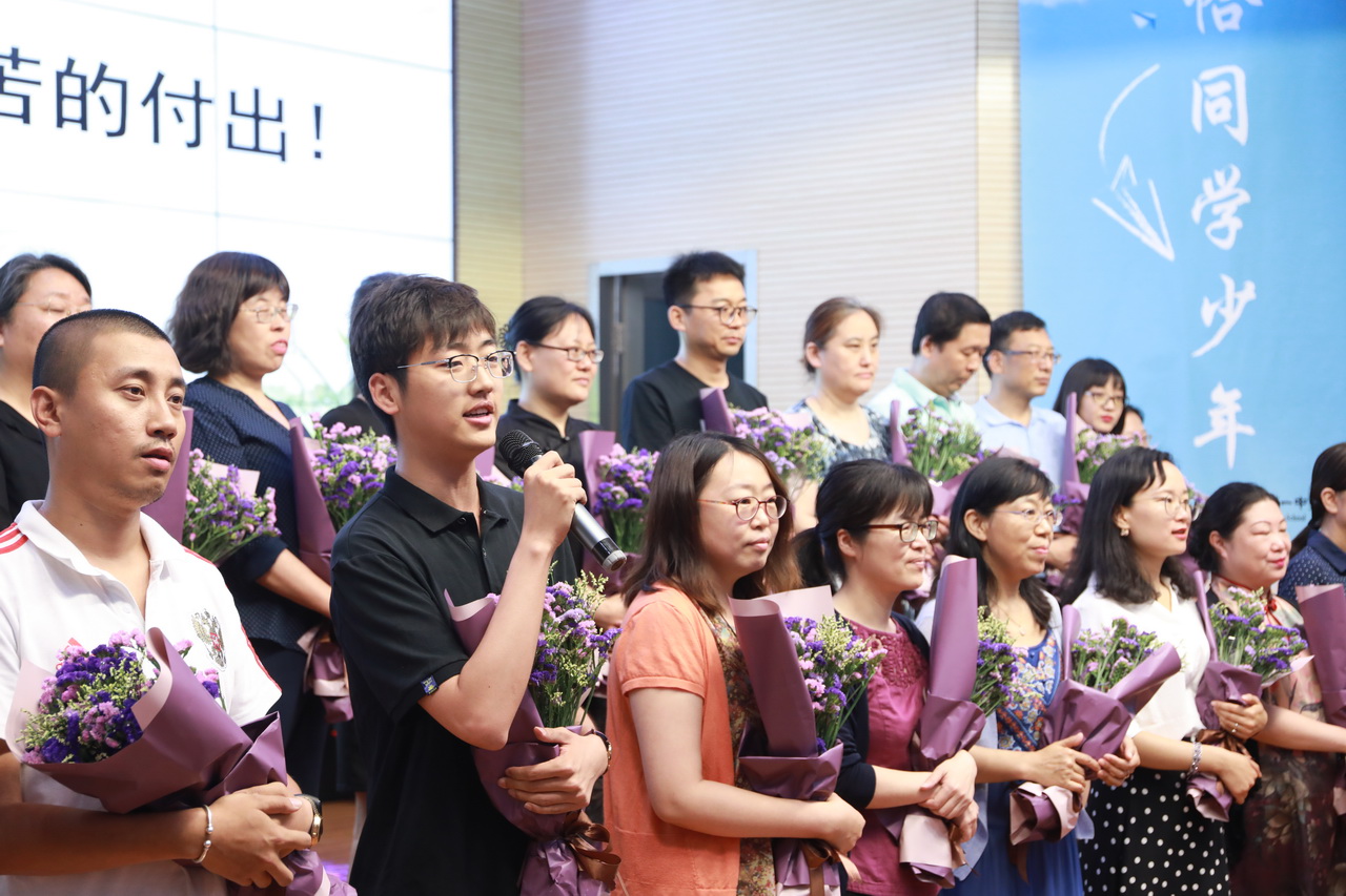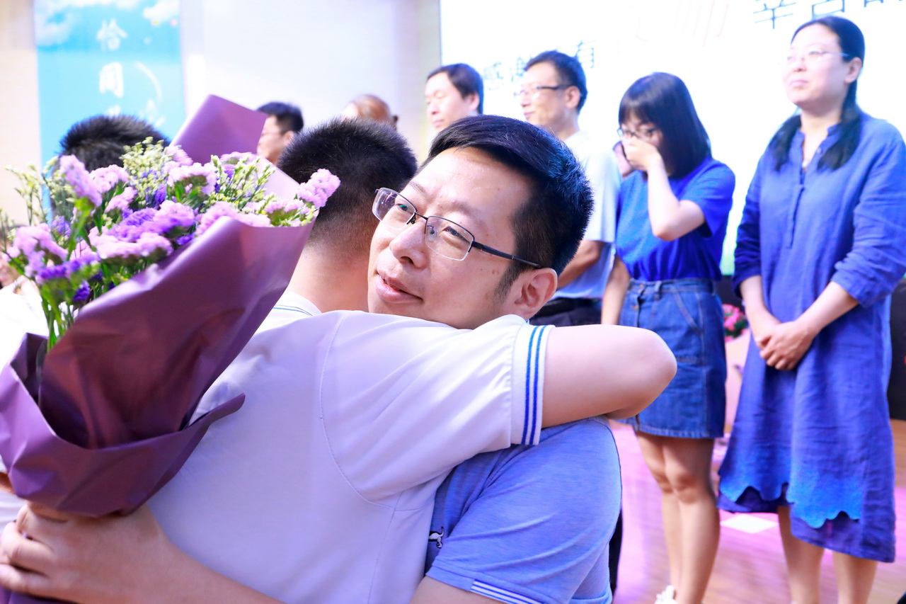 宋泽昕同学为全体师生倾情演唱了歌曲《理想》,在动听的歌声中全体高三教师依次走上舞台,为毕业生们送上最美好的祝愿和祝福。回想起一起走过的点点滴滴,高三学生向老师们深情鞠躬,表达对学校和老师的感谢。不少师生都留下了感动和幸福的泪水。
